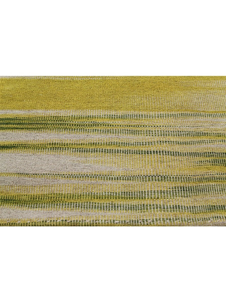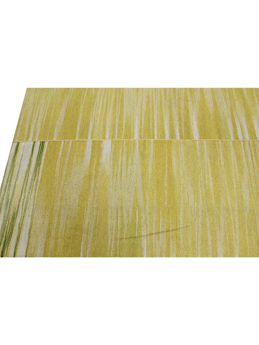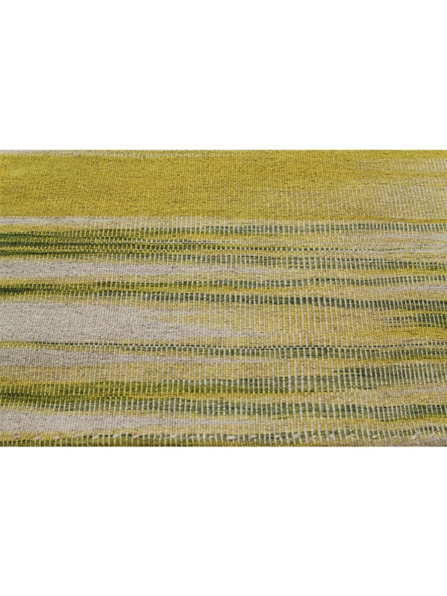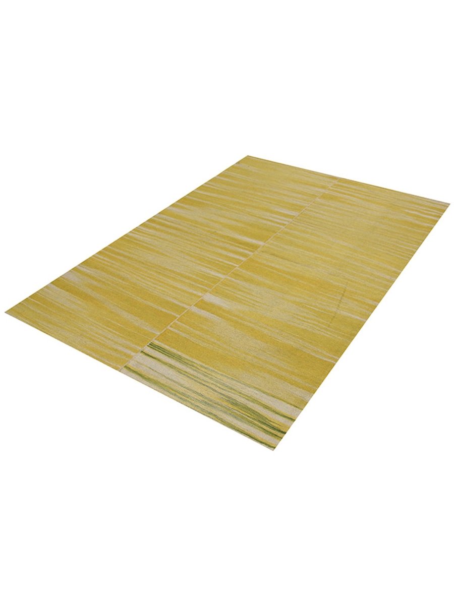 This 4x6 Gold Persian Kilim Area Rug is a stunning blend of classic Persian craftsmanship. Featuring a predominantly golden yellowish color with subtle variations in tone, the rug showcases fine, irregular horizontal lines that create a delicate striped effect. A central vertical division slightly distinguishes two similar sections, adding depth to the design, while faint greenish streaks in the upper left corner provide a touch of contrast.
