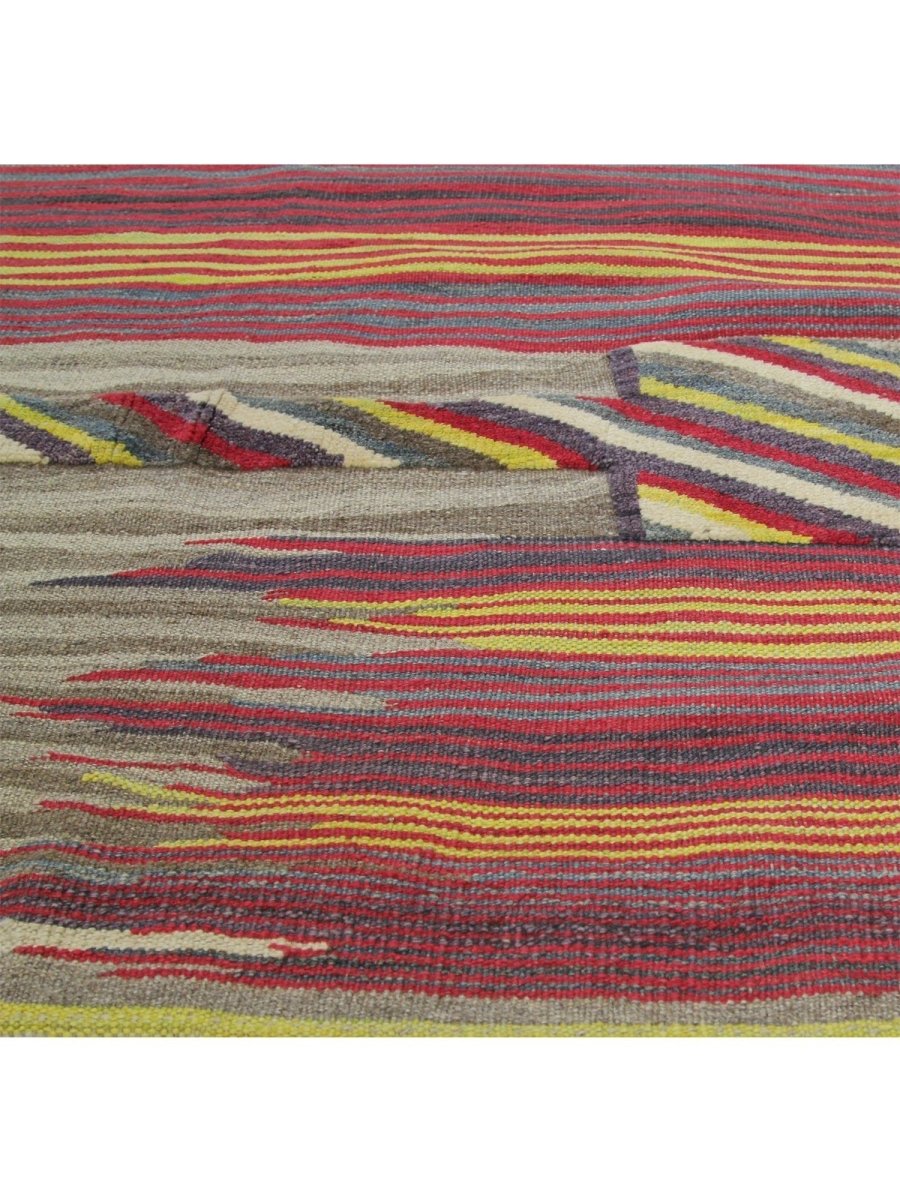 The 4x6 Persian Kilim Area Rug features a sophisticated blend of earthy beige and gray tones, enhanced by bold red, yellow, and blue stripes. The geometric accents, including striking chevron and linear patterns, create a sense of movement and texture. Handwoven from high-quality Persian wool, this flat-weave rug is durable, lightweight, and easy to maintain. Its rich interplay of warm and cool hues adds versatility, making it a seamless addition to sleek, bohemian, or rustic spaces. The intricate craftsmanship ensures each piece is unique, bringing warmth and character to any room. This rug provides a timeless aesthetic that merges classical Persian artistry with chic style.