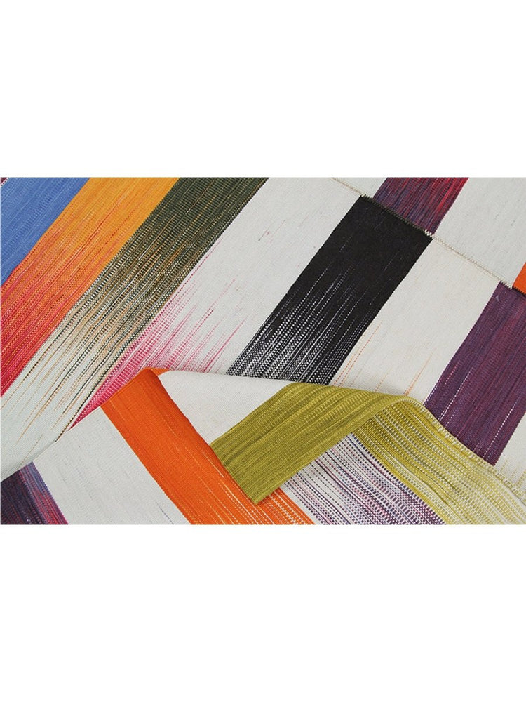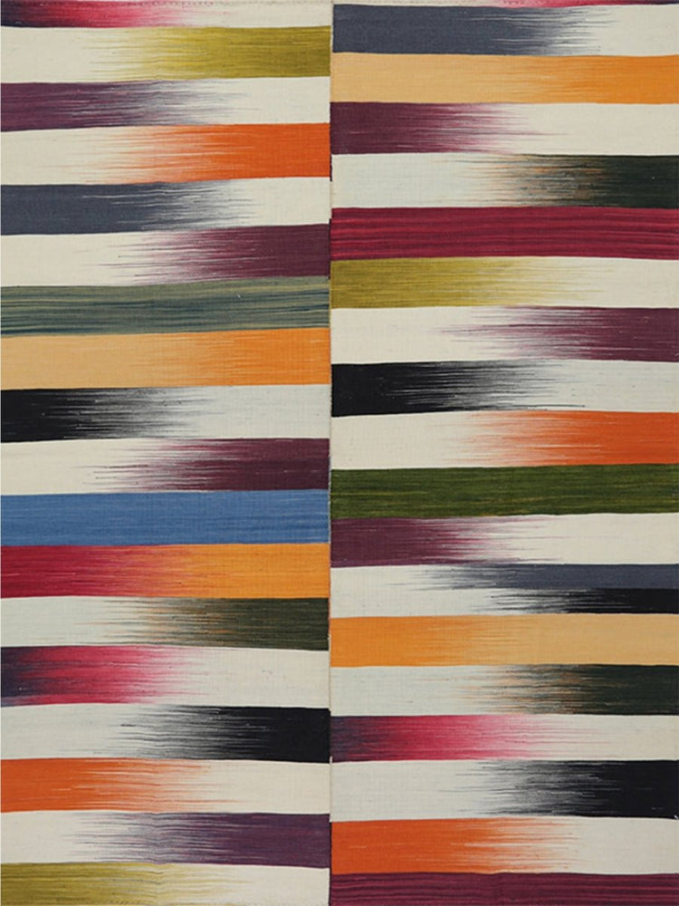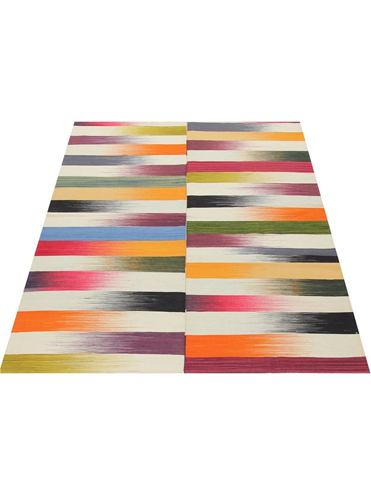 Rich hues of burgundy, black, purple, cream, and orange make this 5x6 Persian Kilim rug a standout decor piece. The handwoven wool construction ensures quality and durability, while the flat-weave design keeps it lightweight and easy to maintain. Featuring a classic gradient striped pattern, its carefully arranged bands of color create a sense of movement and visual depth. This rug brings warmth and charm to any space. Its intricate craftsmanship highlights a timeless weaving culture, adding authenticity and character to your home. Designed for both style and practicality, this rug offers a perfect blend of elegance, comfort, and lasting durability. The rich color palette enhances any interior, while its versatile size makes it easy to style in various settings, from cozy nooks to open living spaces.