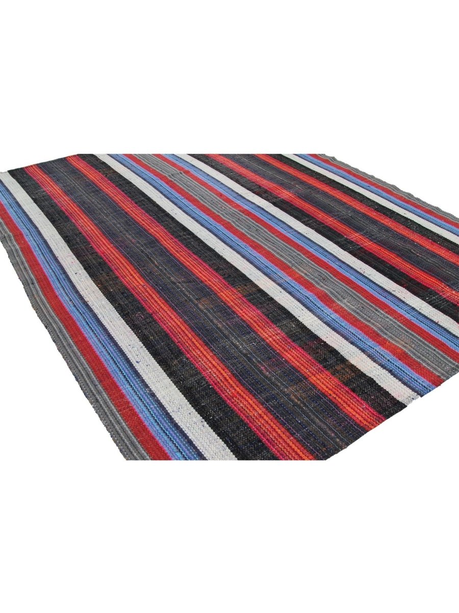 This charming 5x7 Kilim area rug is a delightful addition to any room, boasting a timeless striped pattern that adds a touch of warmth and sophistication. Made from a high-quality cotton blend, it features a beautiful combination of black, ivory, red, and blue hues, perfectly balanced to create a sense of energy and vitality. The striped pattern adds a touch of visual interest and dynamism to the rug's design, which is characterized by subtle color gradations and a classic charm. With its generous size of 5'7" x 6'7", this Kilim area rug is perfect for adding a touch of elegance. Its exceptional quality and beautiful design make it a valuable addition to any home. Whether displayed in a formal setting or a cozy retreat, this Kilim area rug is sure to impress.