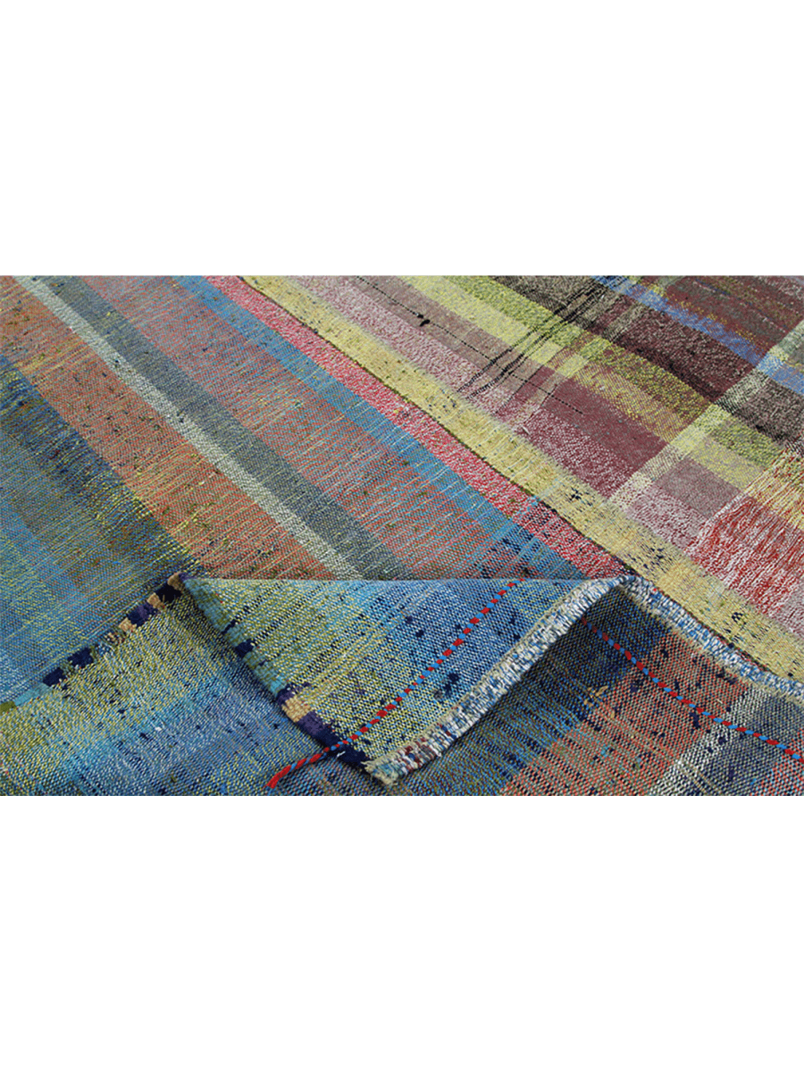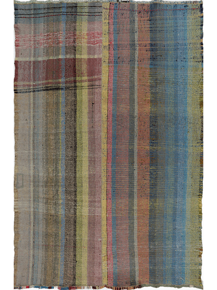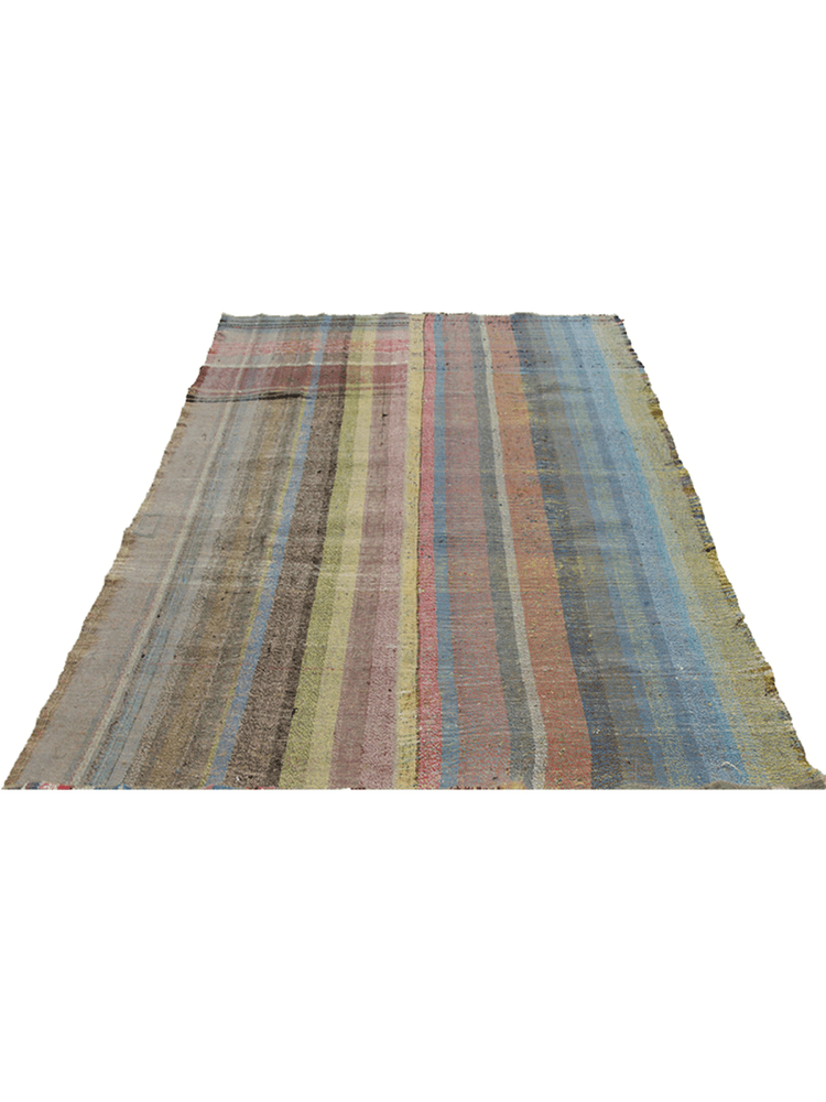 This 5x8 Persian Kilim area rug showcases a striking striped pattern with an eclectic mix of colors, including shades of blue, green, yellow, red, pink, and earthy tones. The slightly faded appearance enhances its rustic and artisanal charm, making it a beautiful addition to various interiors. Hand-knotted from fine wool, this flat-weave rug is lightweight yet durable, offering comfort and longevity. The intricate detailing and vibrant hues create a dynamic visual appeal, making it a standout decor piece for any space. While its craftsmanship adds a touch of elegance. Whether used as an accent piece or a functional floor covering, this rug brings warmth and character to your home.