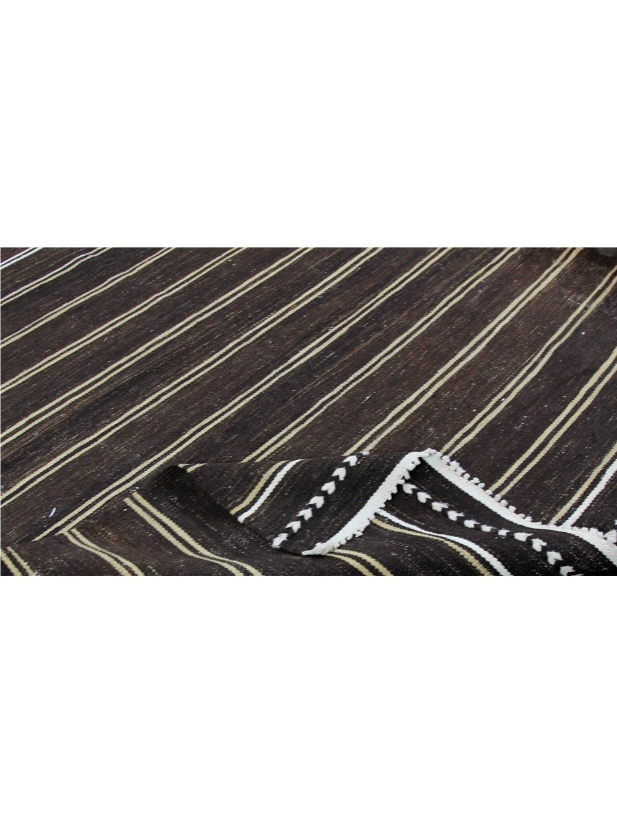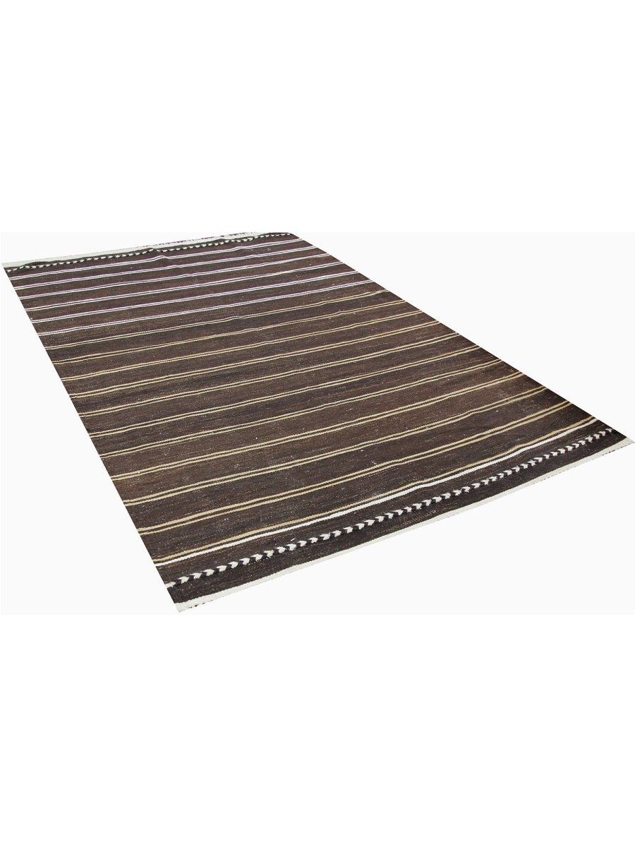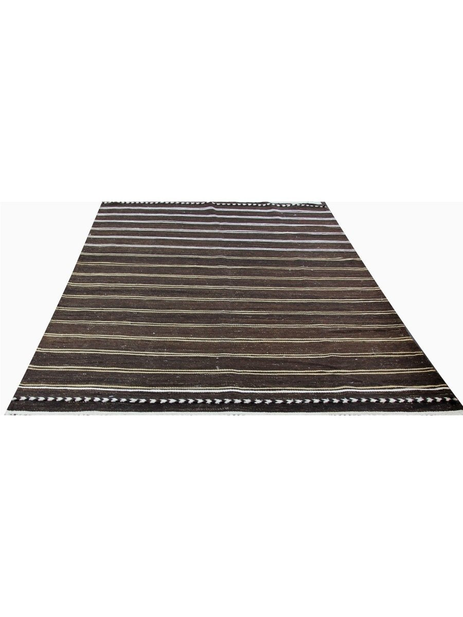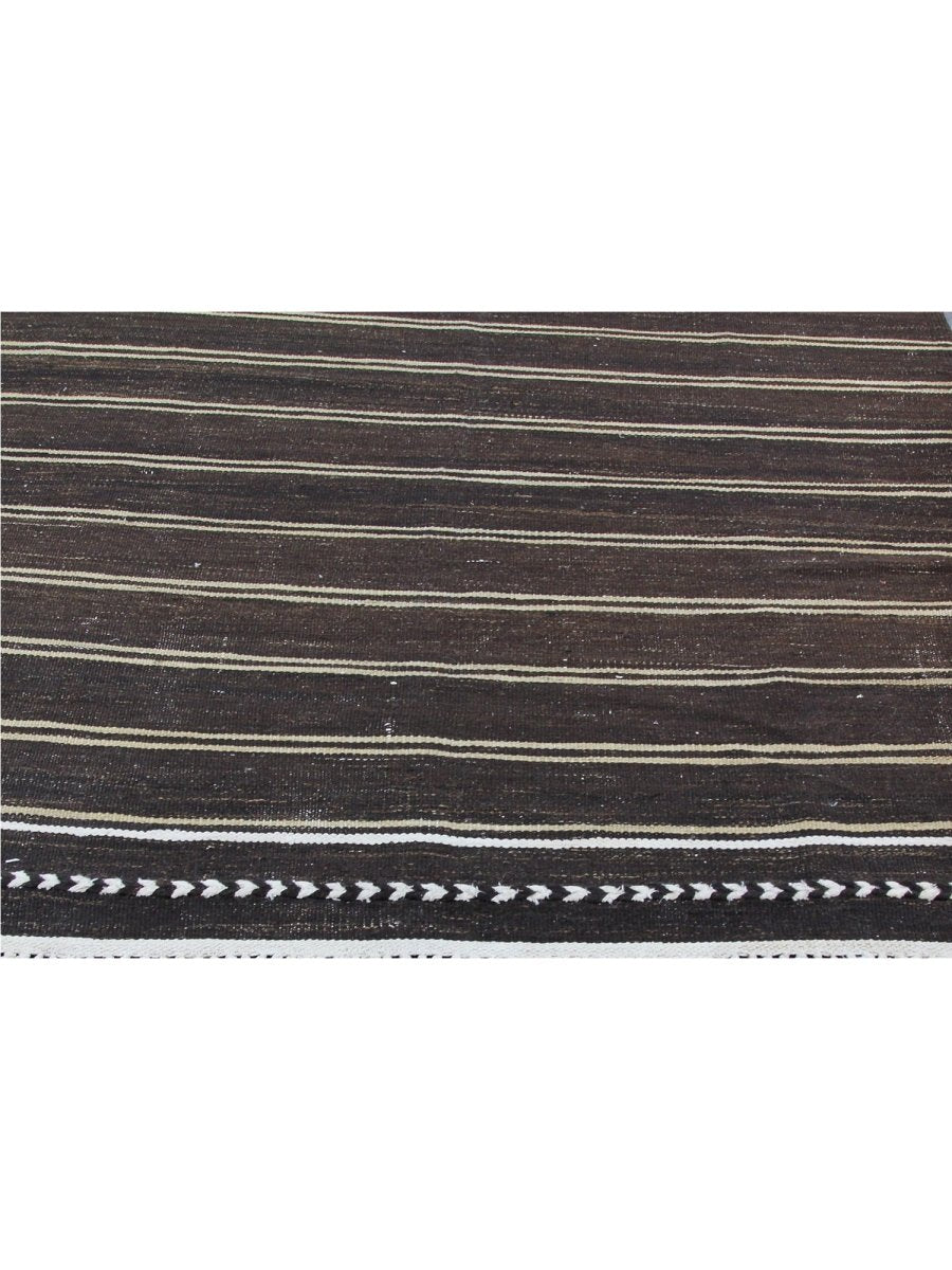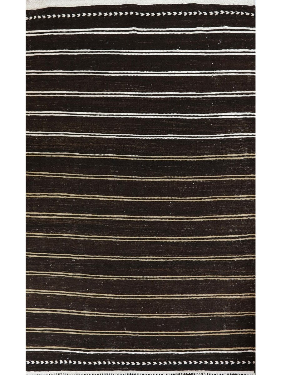 The 6x10 Old Persian Kilim Area Rug offers a harmonious blend of earthy tones and timeless elegance. Hand-knotted in Persia from premium wool, this rug features a deep brown base accented by delicate horizontal stripes in white and beige. The alternating stripe pattern creates a soothing rhythm, while the embroidered border with repeating leaf motifs adds a decorative touch. Ideal for rustic, classical, or sleek interiors, this rug’s understated charm adds warmth and depth to living rooms, dining spaces, or bedrooms. The wool construction ensures durability and softness, while its flat-weave texture offers lightweight practicality for easy maintenance. Whether enhancing minimalist interiors or adding depth to cozy spaces, this rug’s neutral tones provide a versatile foundation for any room.