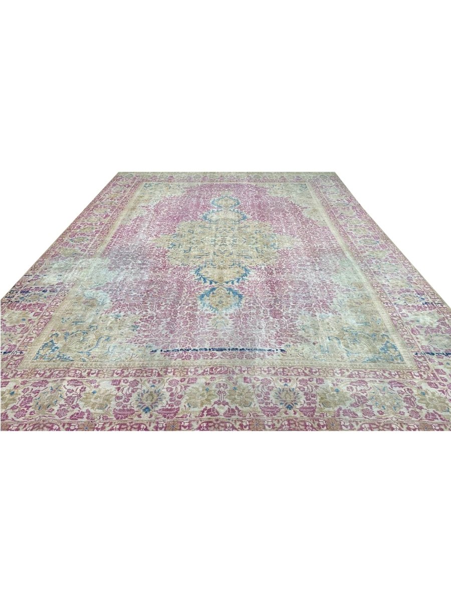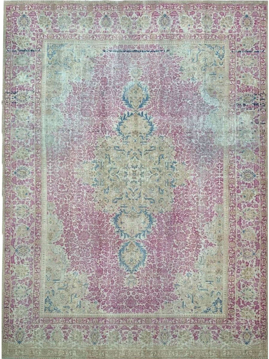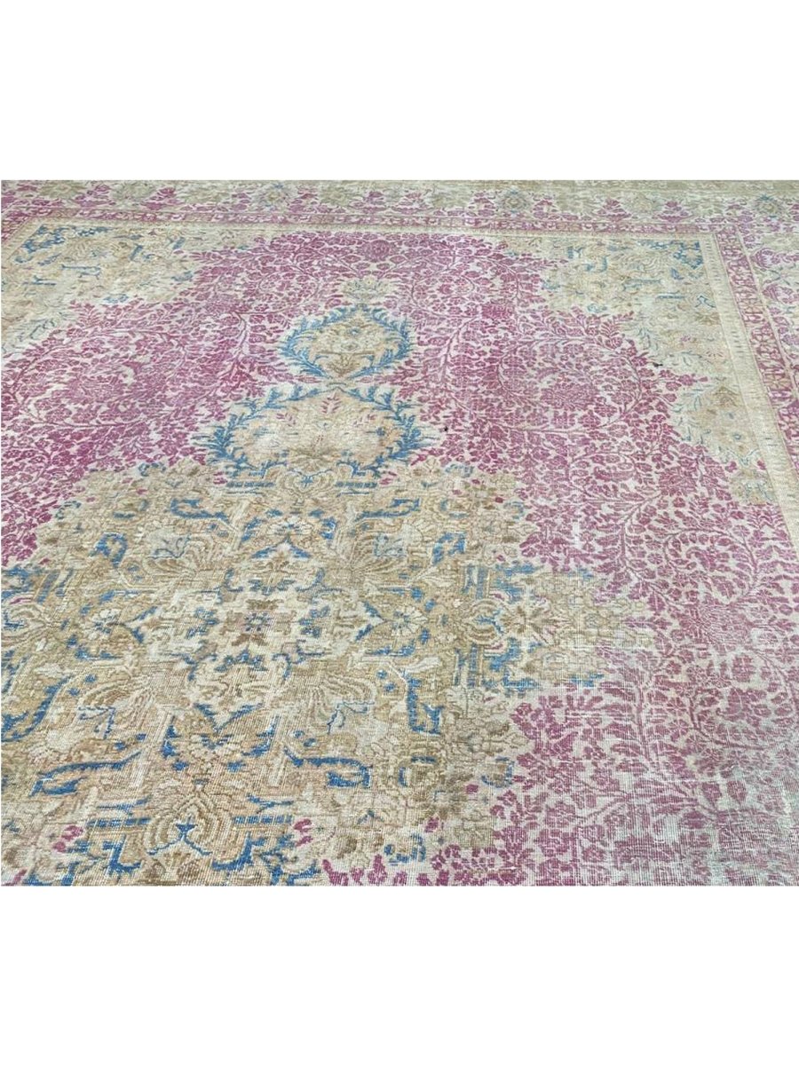 This beautiful old Persian Tabriz rug showcases a graceful interplay of pink, beige, and delicate sky-blue accents. The intricate central medallion is surrounded by elaborate floral motifs and vine patterns, creating an enchanting visual harmony. Hand-knotted with care using premium wool, it offers durability and a comfortable underfoot experience, ideal for formal and casual living spaces.