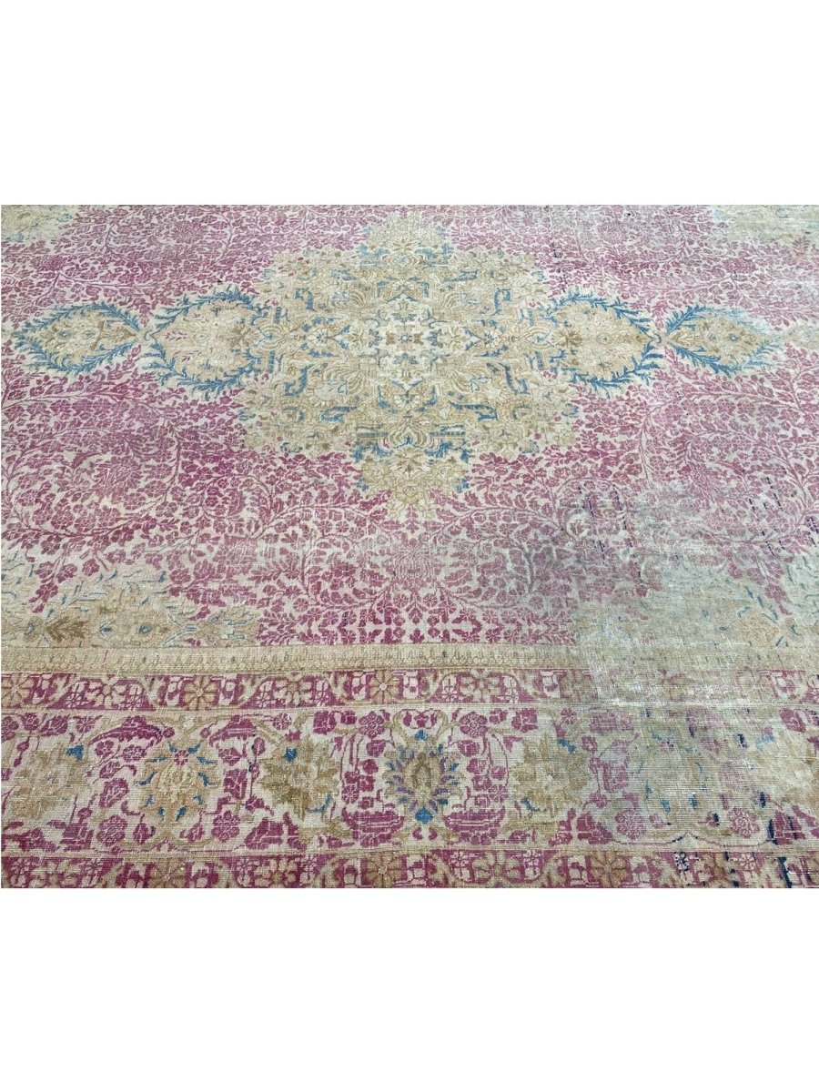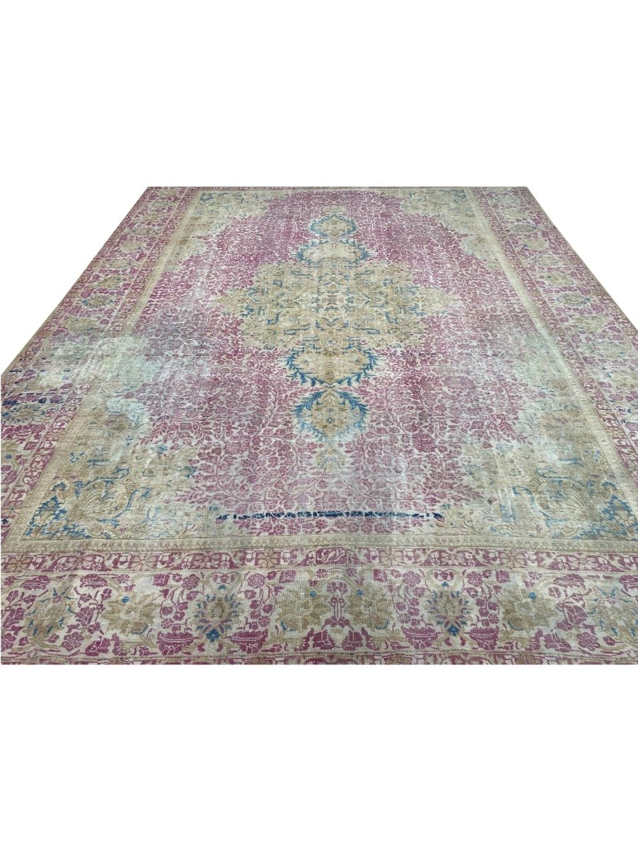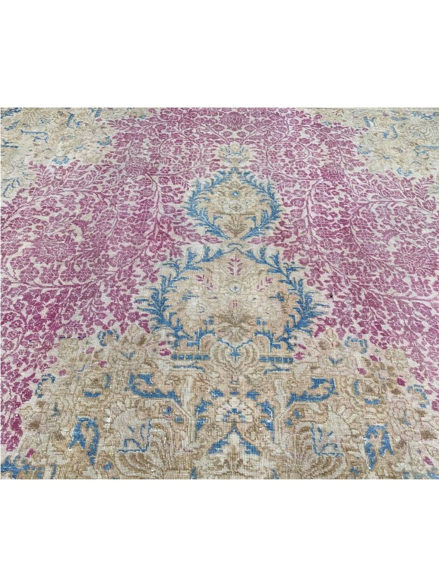 This beautiful old Persian Tabriz rug showcases a graceful interplay of pink, beige, and delicate sky-blue accents. The intricate central medallion is surrounded by elaborate floral motifs and vine patterns, creating an enchanting visual harmony. Hand-knotted with care using premium wool, it offers durability and a comfortable underfoot experience, ideal for formal and casual living spaces.