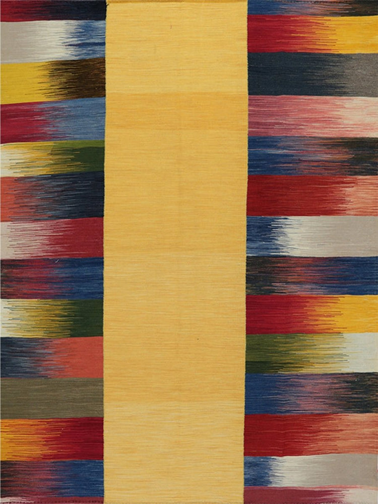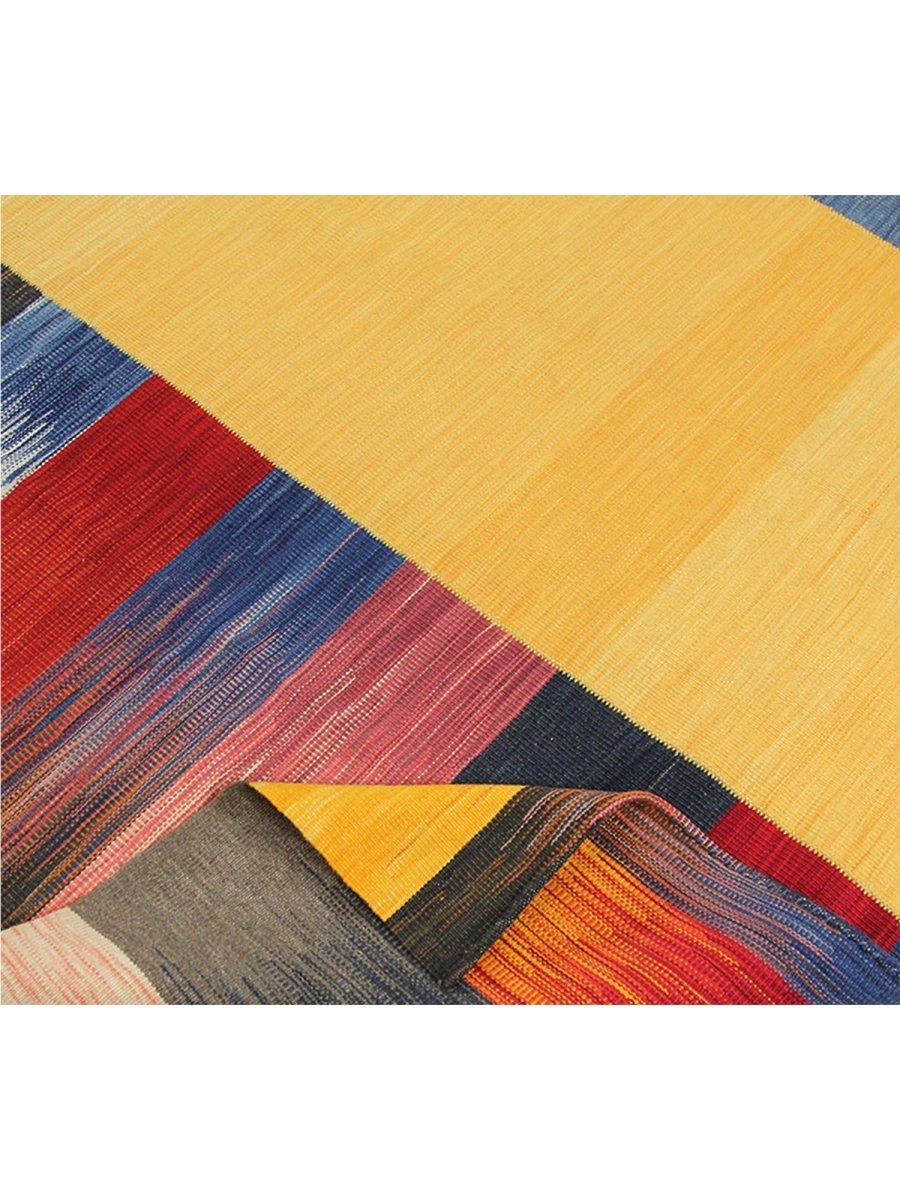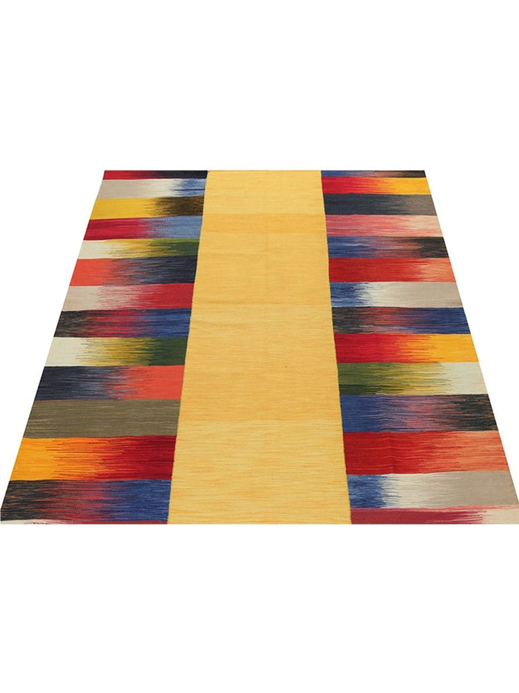 This 6x7 Persian Kilim area rug features a striped pattern set against a warm gold base. The vibrant yet earthy hues of red, blue, green, and beige create a dynamic and visually textured design, making it a standout piece for any interior. Handwoven from high-quality Persian wool, this flatweave rug offers durability and versatility, fitting seamlessly into bohemian, rustic, or modern spaces. Its balanced color palette and artisanal craftsmanship add warmth and character.