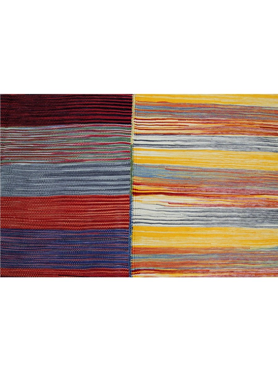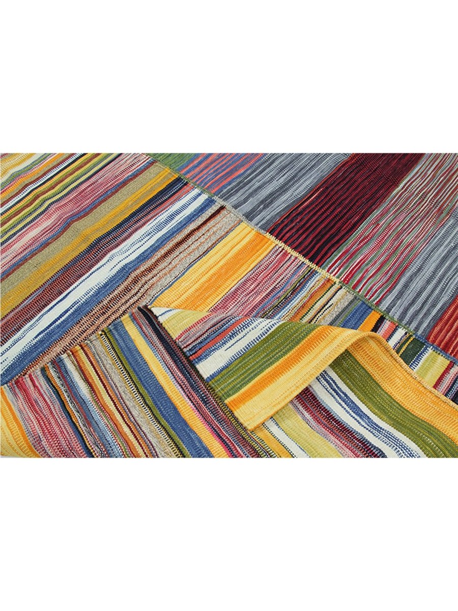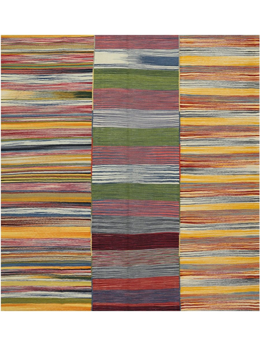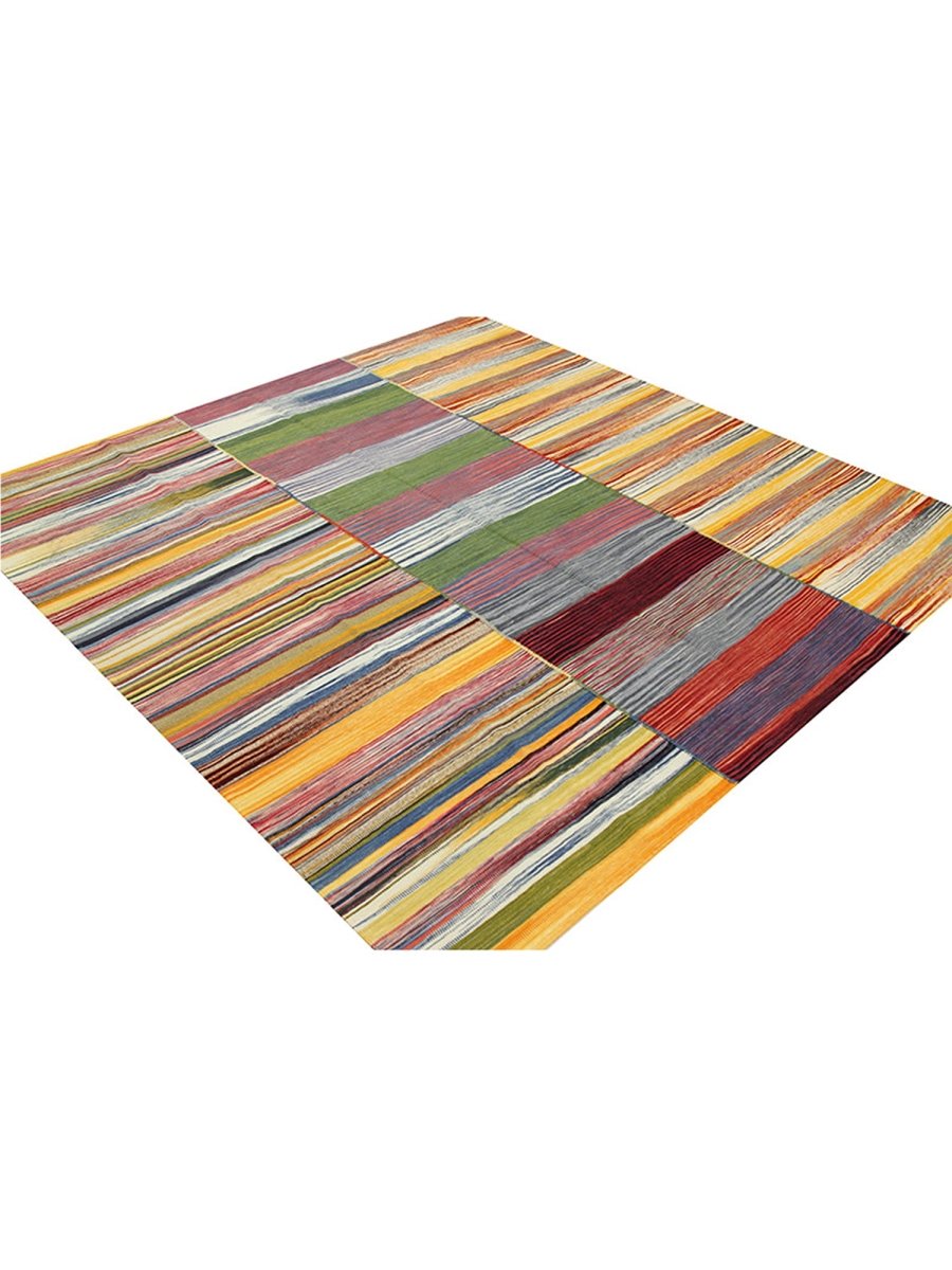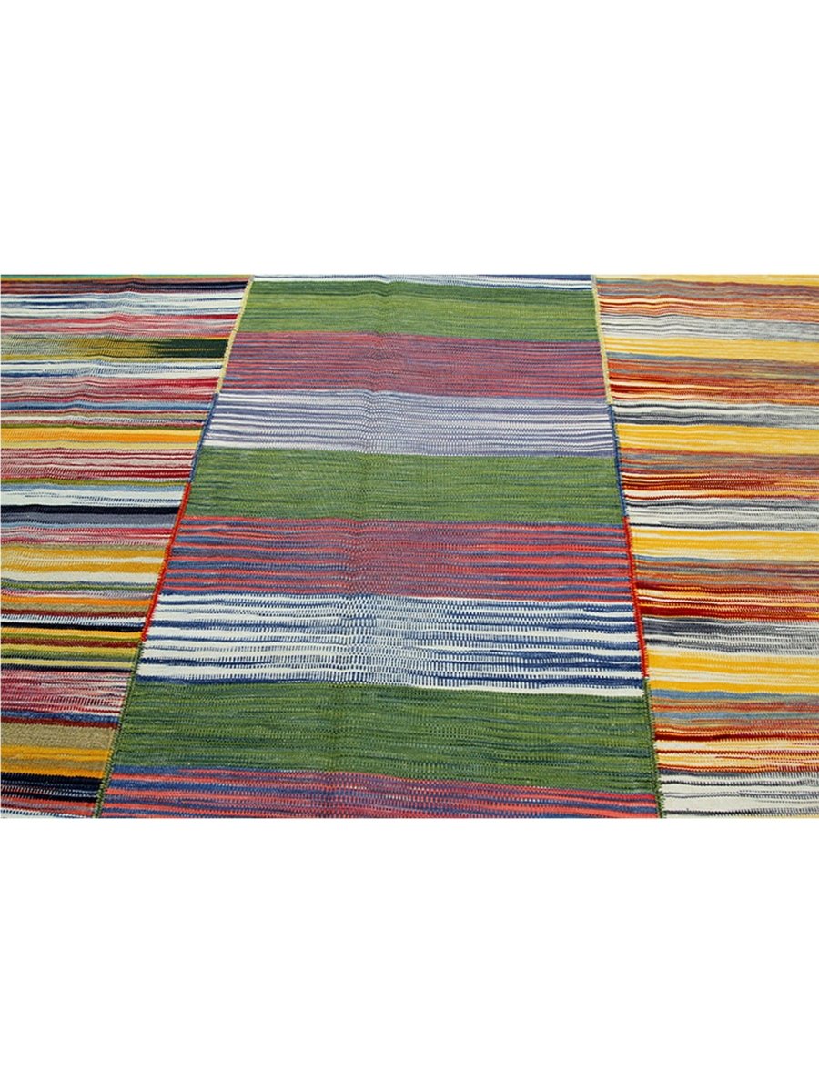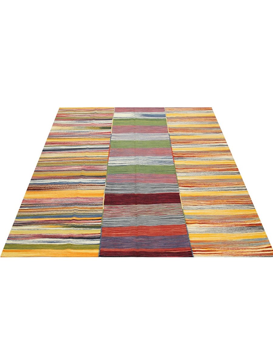 This 6x7 Persian Kilim area rug features a stunning striped pattern with dominant gold tones, complemented by shades of red, blue, green, and earthy hues. The parallel stripes create a visually dynamic effect, adding depth and warmth to any space. Handwoven from high-quality Persian wool, this flatweave rug offers durability and a lightweight design, making it ideal for various interiors. The combination of bold and muted tones gives it a versatile charm, perfect for bohemian, or rustic settings. This rug adds character and classic craftsmanship to your home.