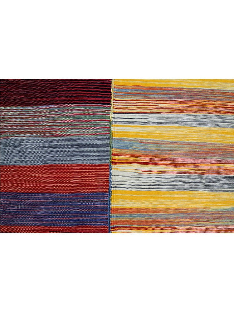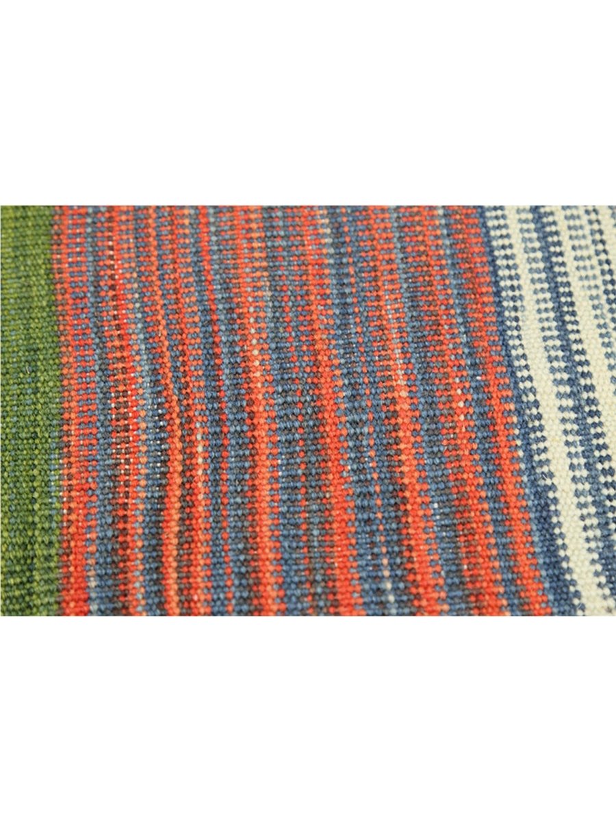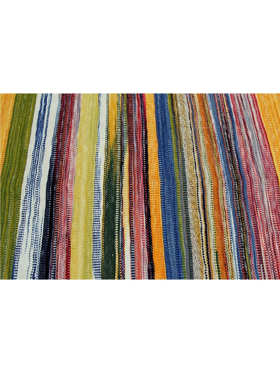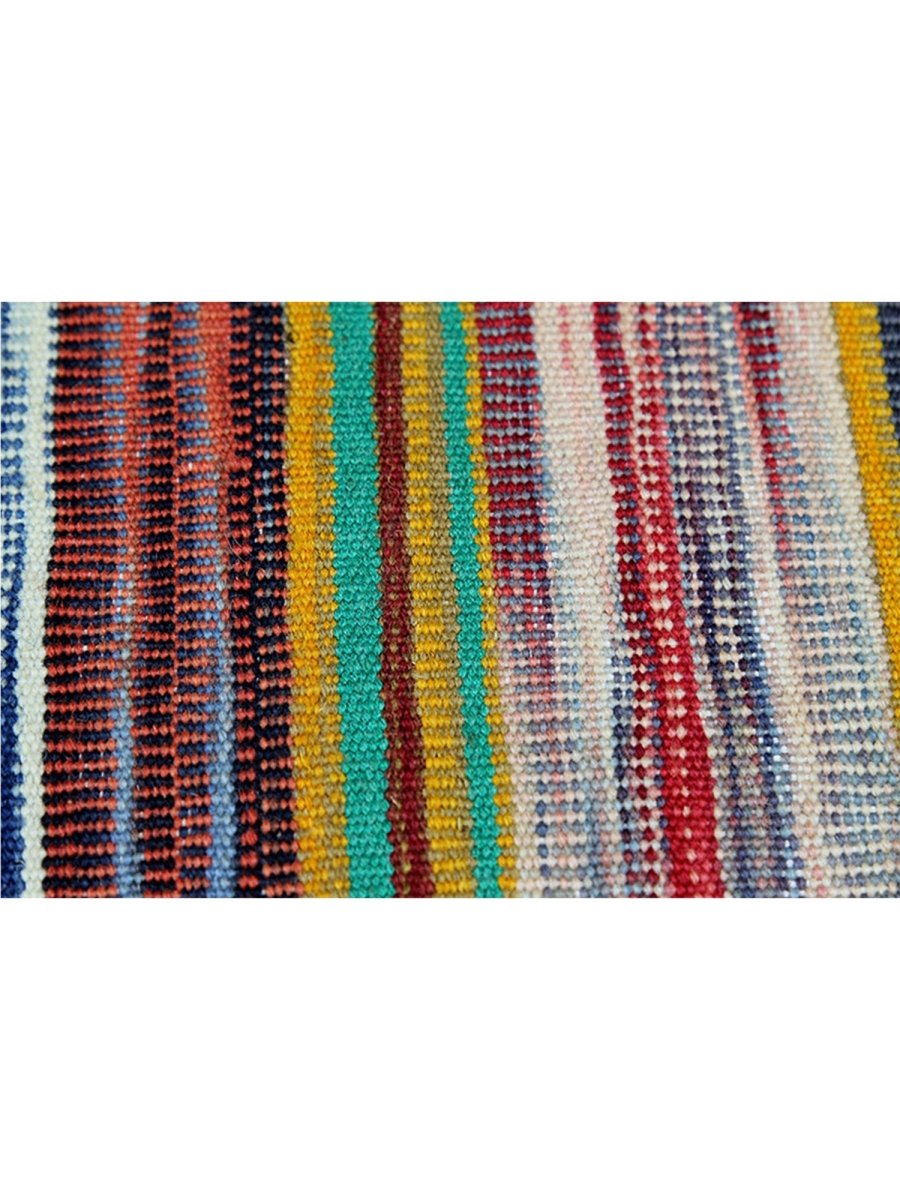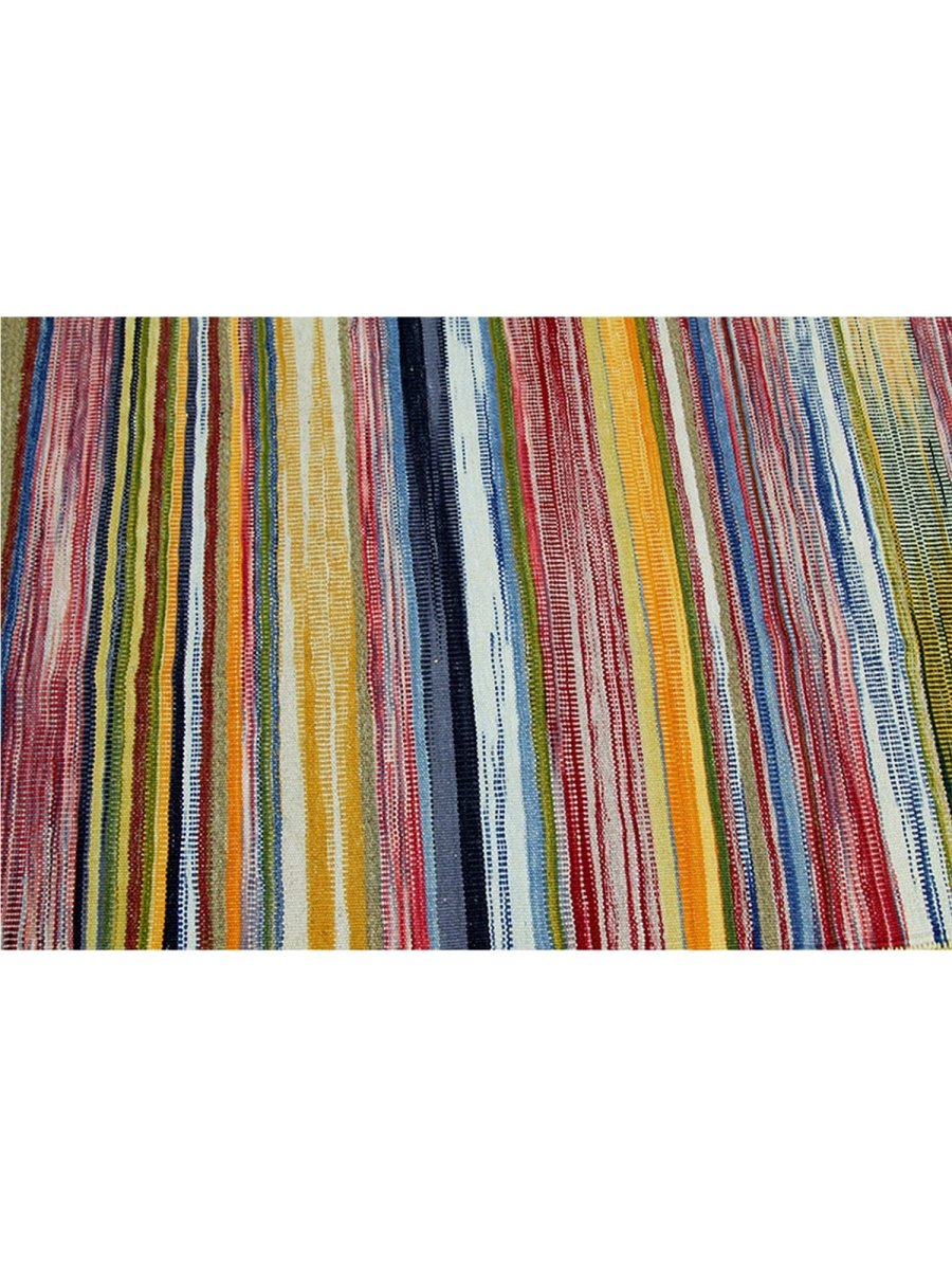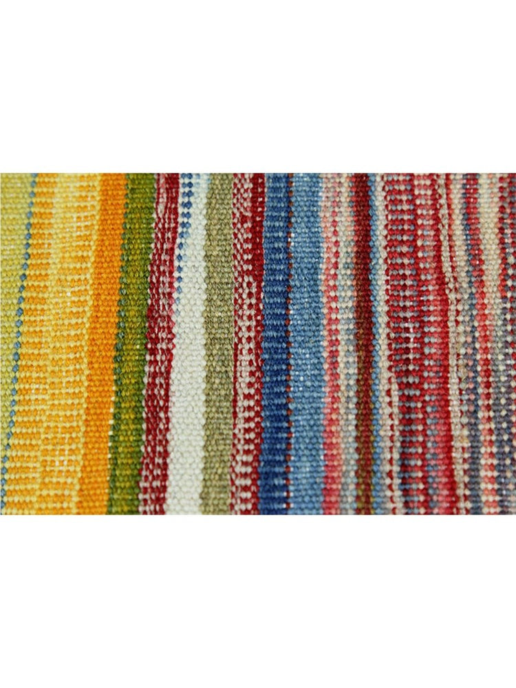 This 6x7 Persian Kilim area rug features a stunning striped pattern with dominant gold tones, complemented by shades of red, blue, green, and earthy hues. The parallel stripes create a visually dynamic effect, adding depth and warmth to any space. Handwoven from high-quality Persian wool, this flatweave rug offers durability and a lightweight design, making it ideal for various interiors. The combination of bold and muted tones gives it a versatile charm, perfect for bohemian, or rustic settings. This rug adds character and classic craftsmanship to your home.