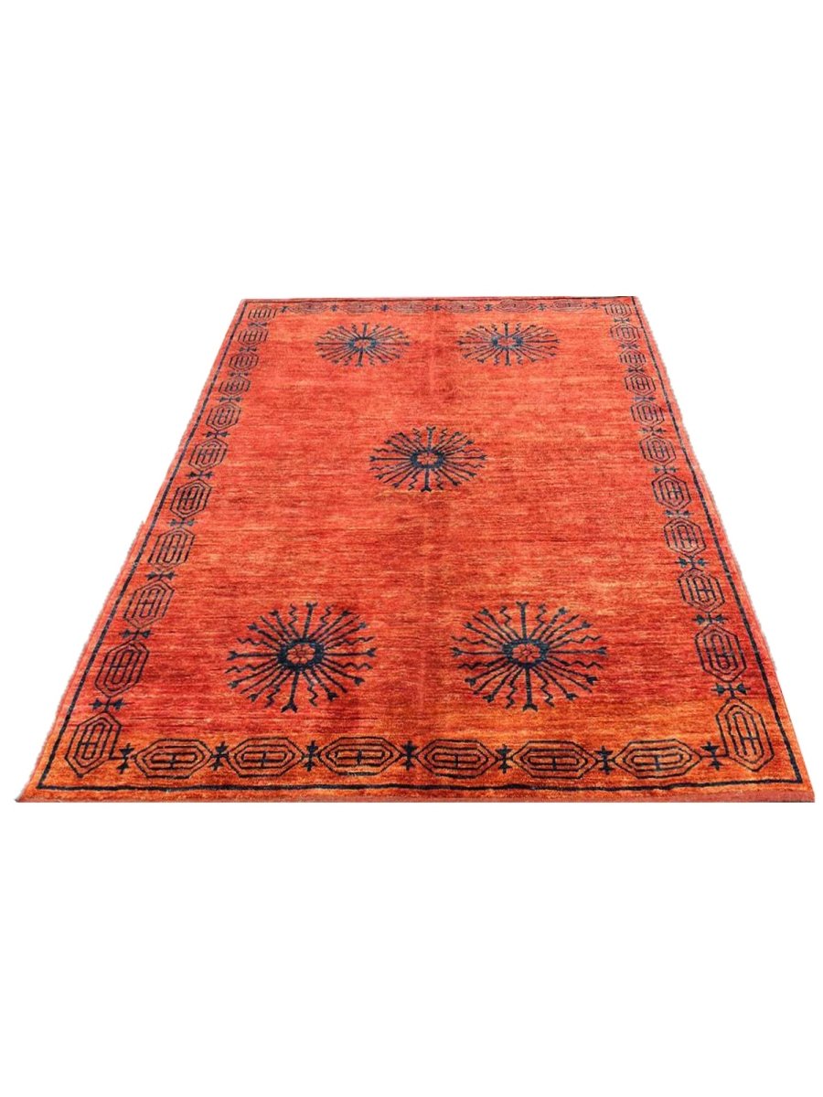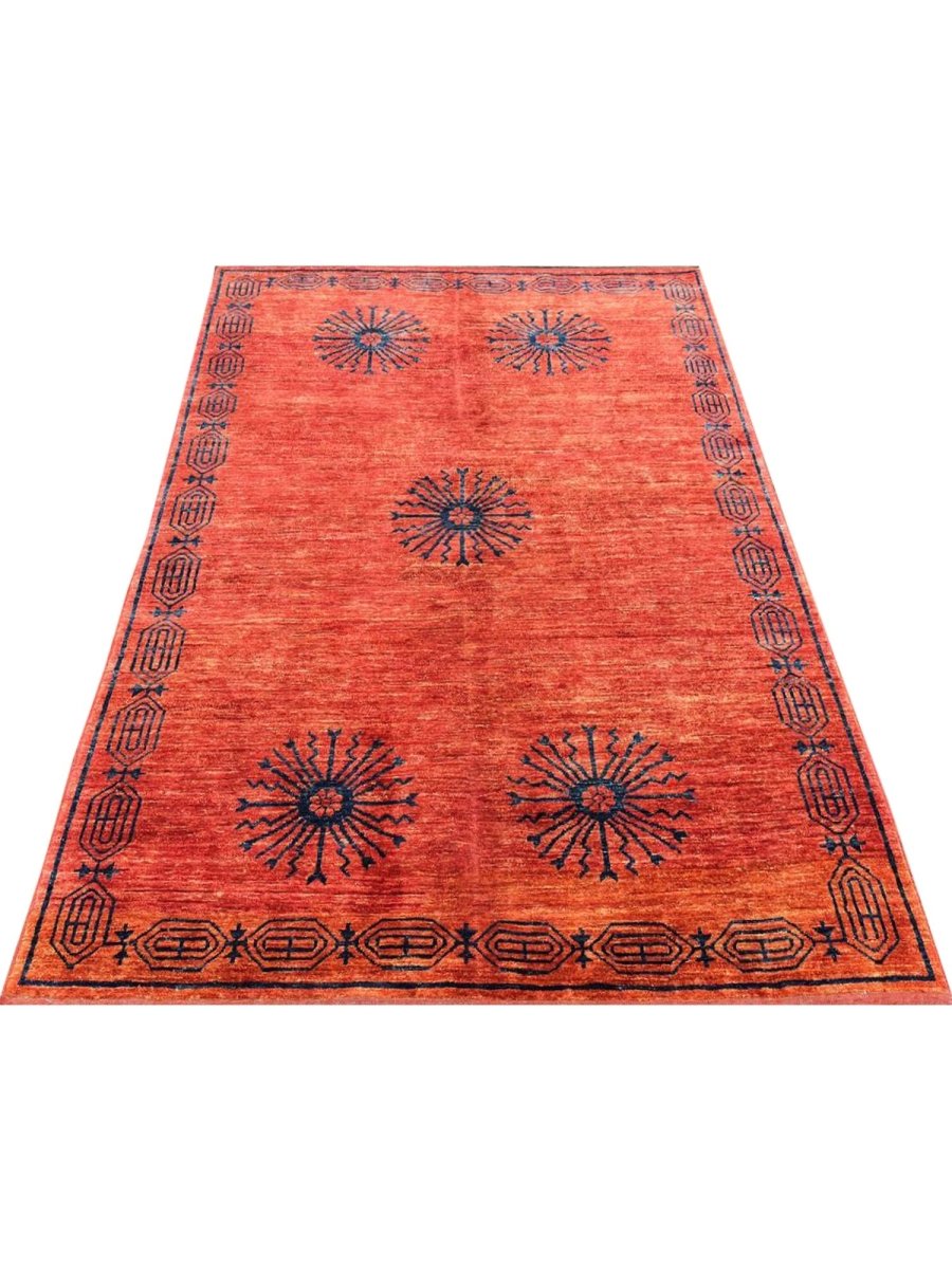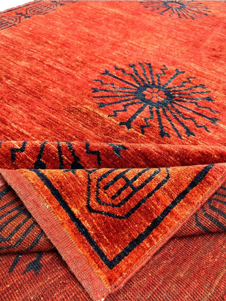 This 6x8 tribal area rug is a striking hand-knotted piece that showcases an intricate tribal-inspired design, adding character and depth to any space. Crafted from high-quality wool, it provides both softness and durability, making it ideal for high-traffic areas. A one-of-a-kind classic, this rug blends bold hues of blue, and, orange creating a warm and inviting ambiance. Perfect for enhancing the decor of living rooms, home offices, or cozy reading nooks. Free shipping in the US.