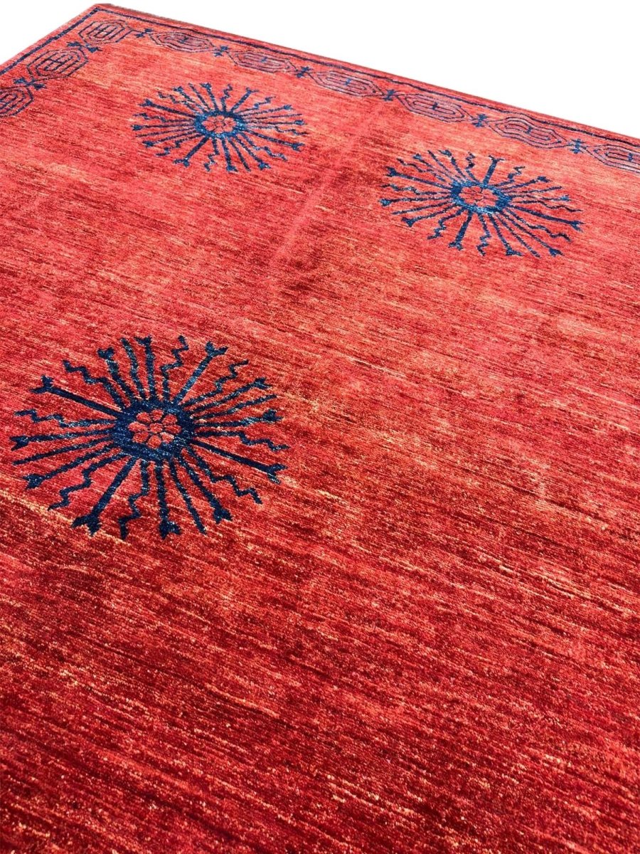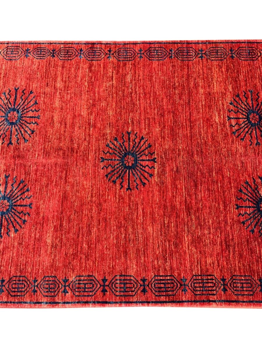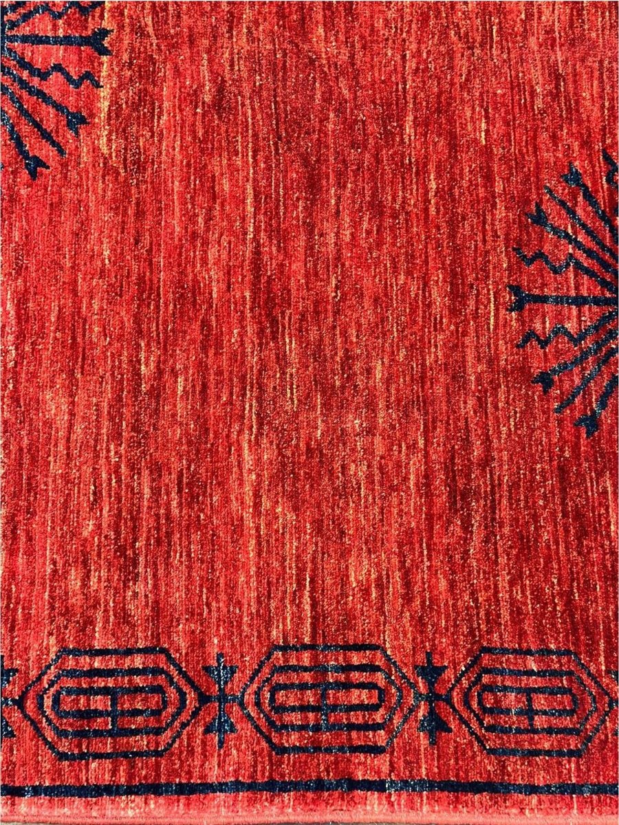 This 6x8 tribal area rug is a striking hand-knotted piece that showcases an intricate tribal-inspired design, adding character and depth to any space. Crafted from high-quality wool, it provides both softness and durability, making it ideal for high-traffic areas. A one-of-a-kind classic, this rug blends bold hues of blue, and, orange creating a warm and inviting ambiance. Perfect for enhancing the decor of living rooms, home offices, or cozy reading nooks. Free shipping in the US.