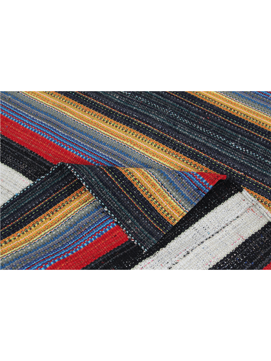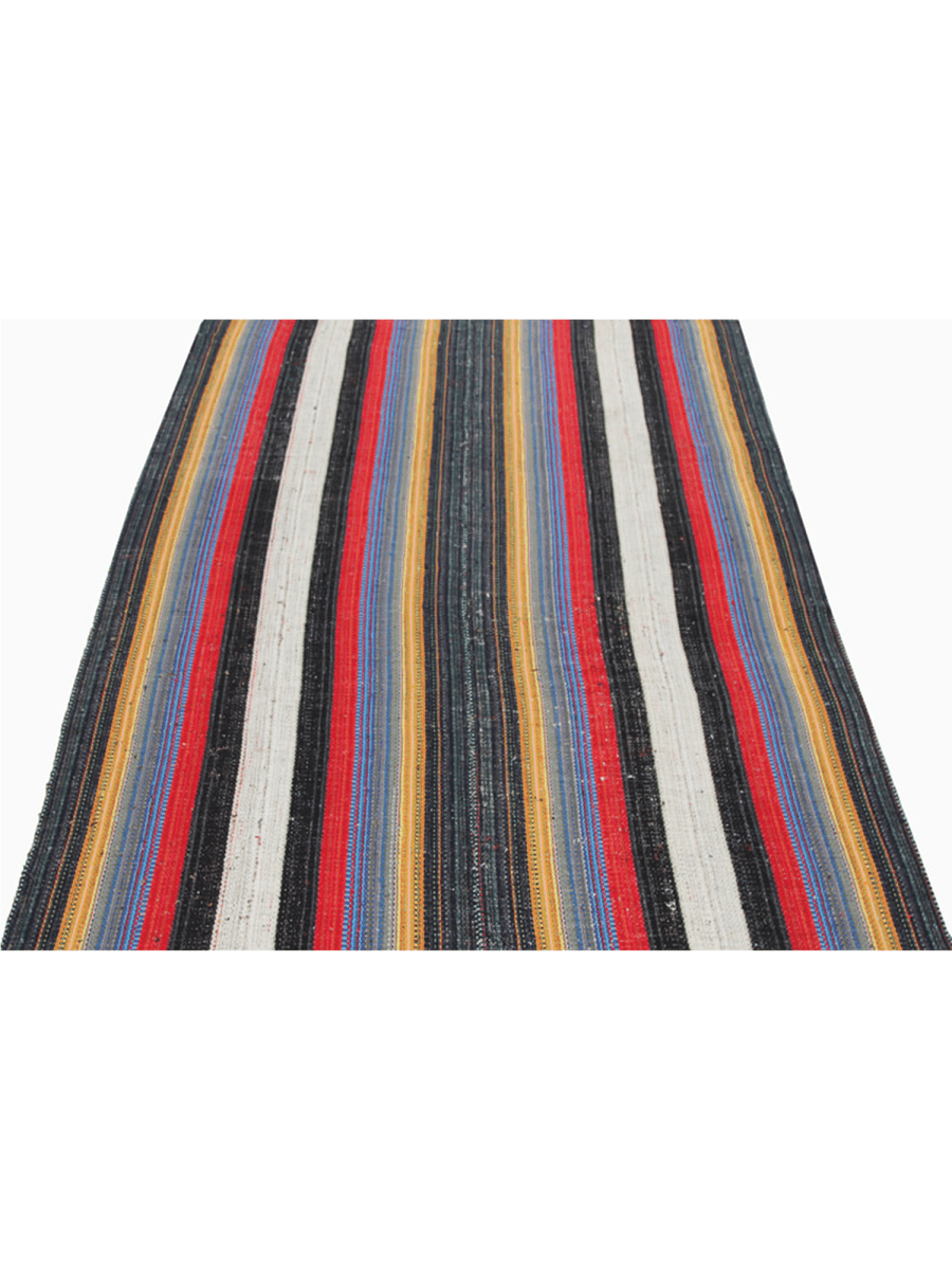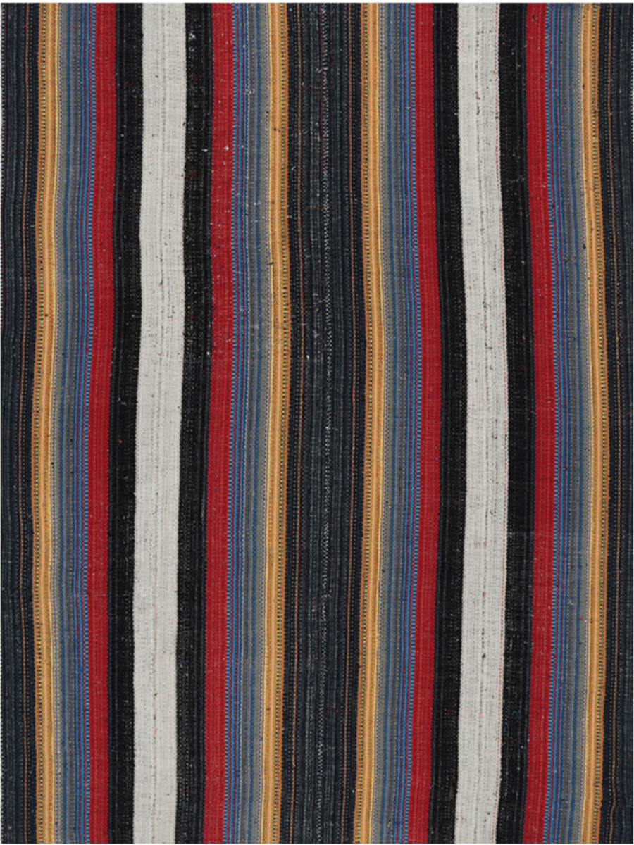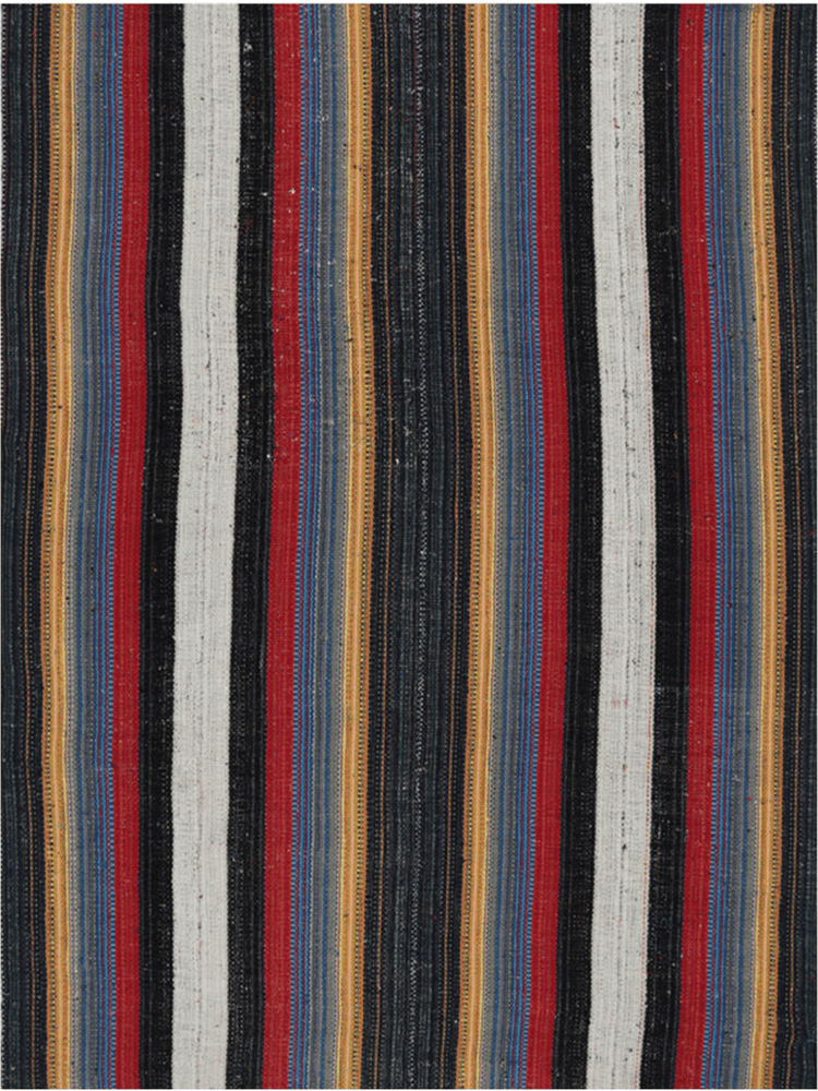 Make a statement with this 6x8 Persian Kilim area rug, crafted from a durable cotton blend. Its bold striped design showcases black, white, red, blue, and yellow, creating a striking visual impact. This rug adds energy and warmth to any setting. Hand-knotted for lasting durability, this rug combines bold style with practical design, making it ideal for high-traffic areas. It brings warmth, energy, and a striking visual impact to any space. The hand-knotted craftsmanship ensures durability, making it a practical yet stylish choice for high-traffic areas.