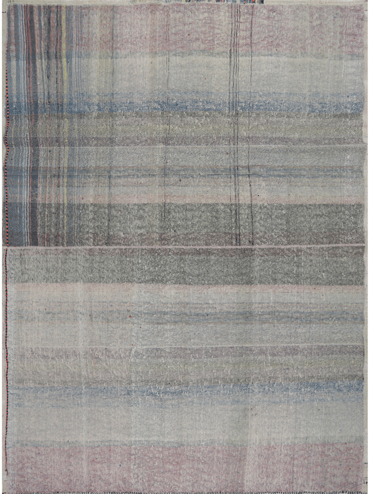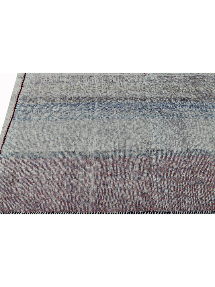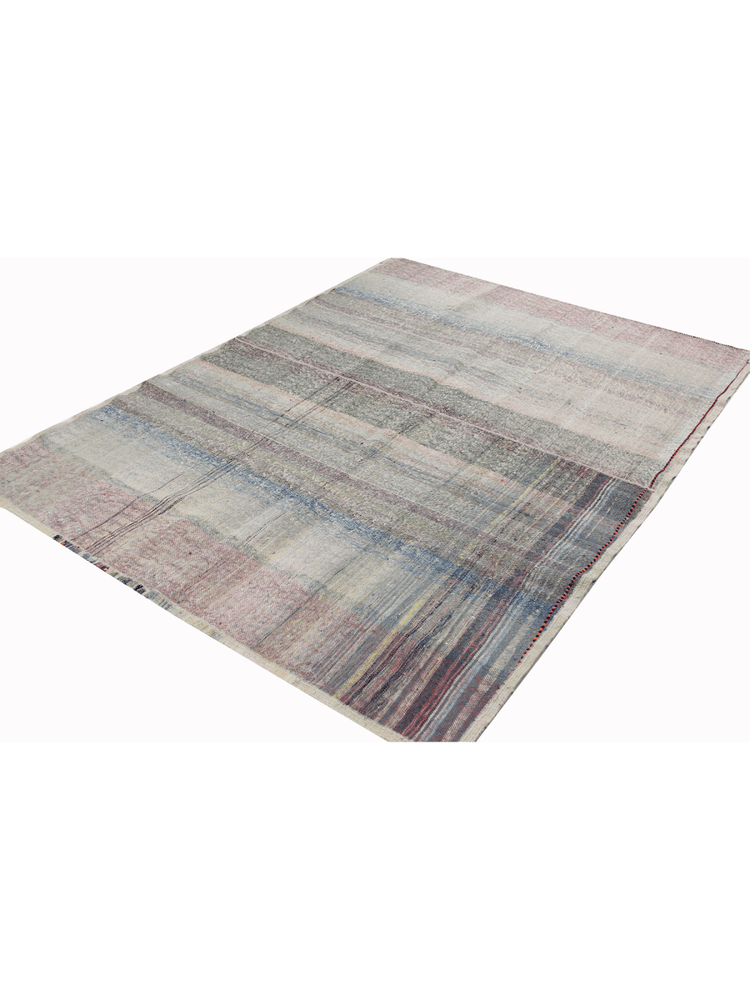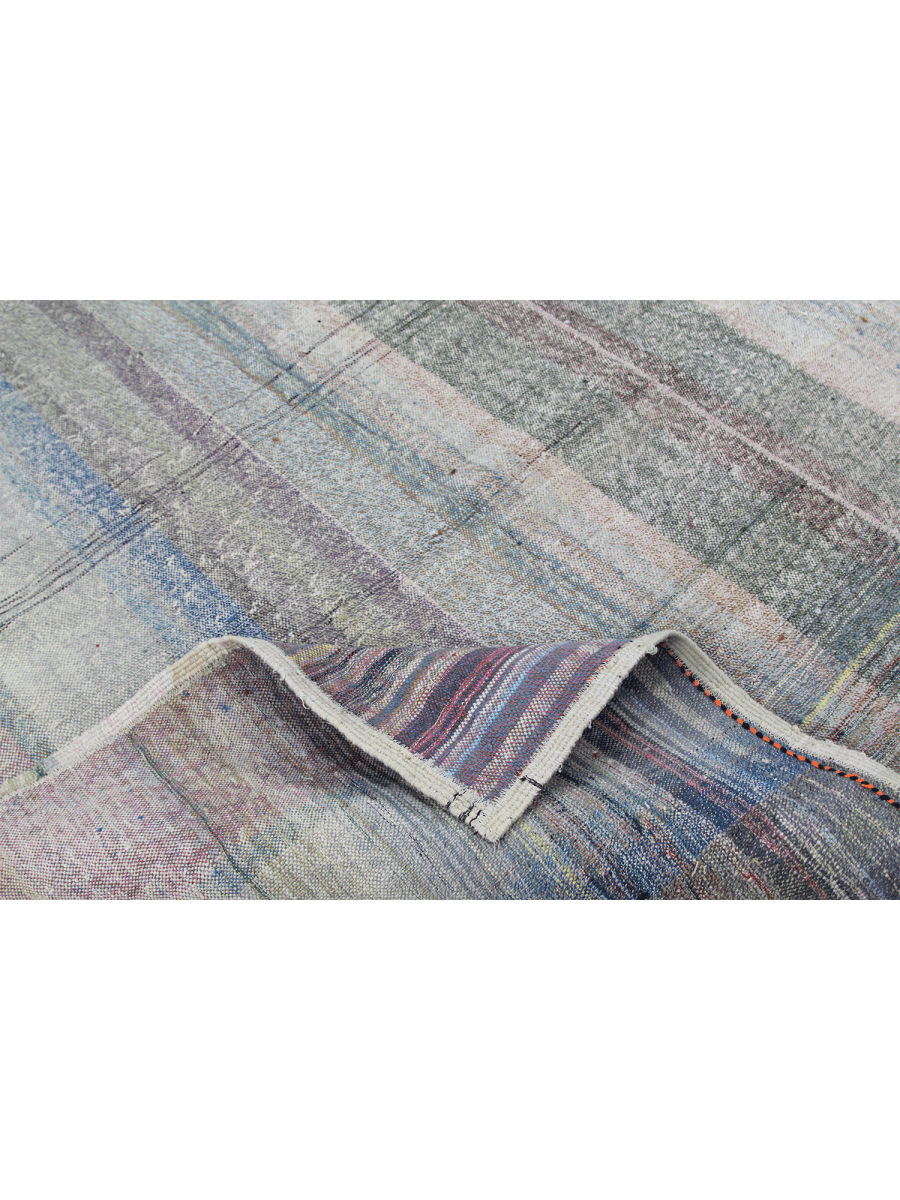 This 6x8 Persian Kilim rug showcases a stunning striped gradient pattern with horizontal bands of muted blue, grays, purples, and greens. The seamless blending of colors creates a watercolor-like effect, adding an artistic and sophisticated touch to any space. Handwoven from high-quality wool, this flat-weave rug offers both durability and flexibility while maintaining a soft, lightweight texture. Its understated yet visually captivating design makes it a perfect choice for eclectic interiors, adding depth and a serene ambiance.