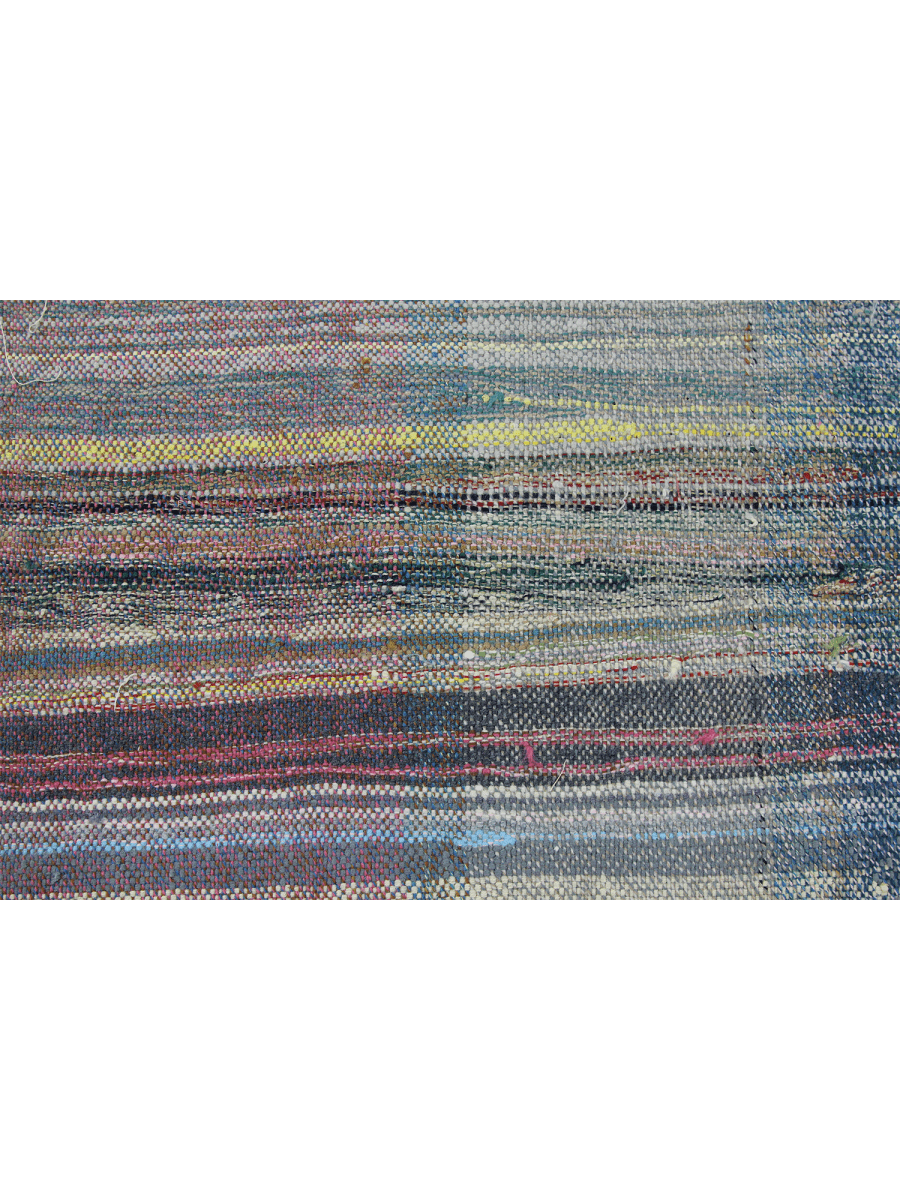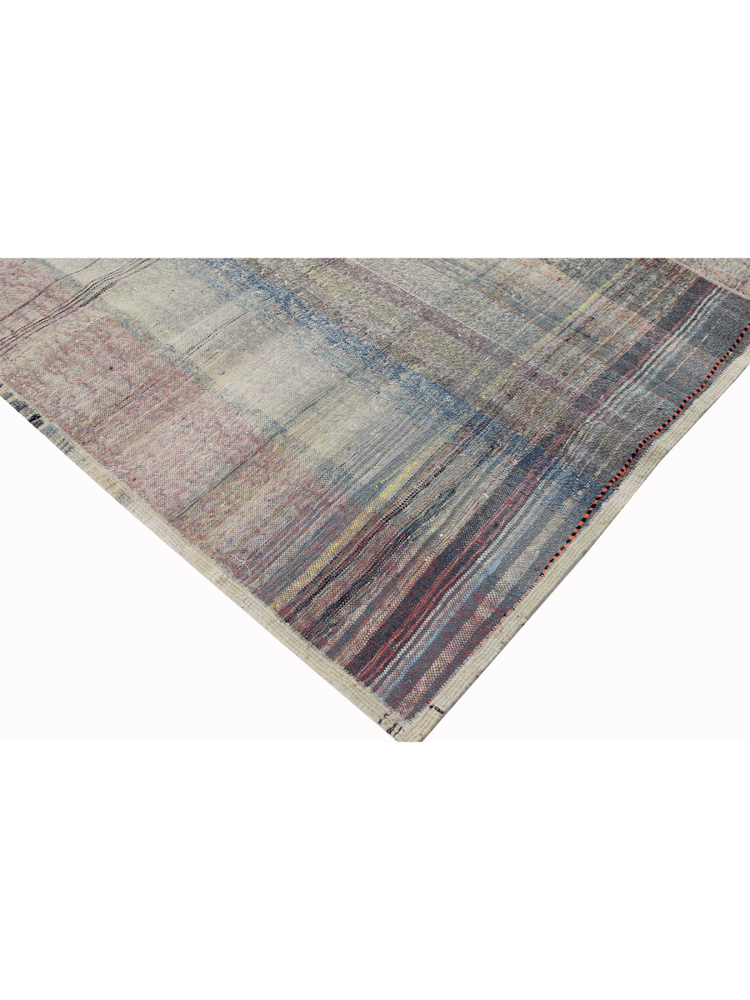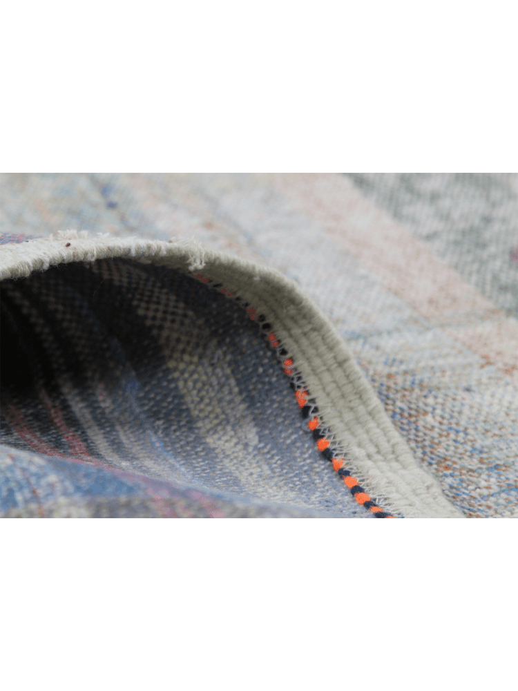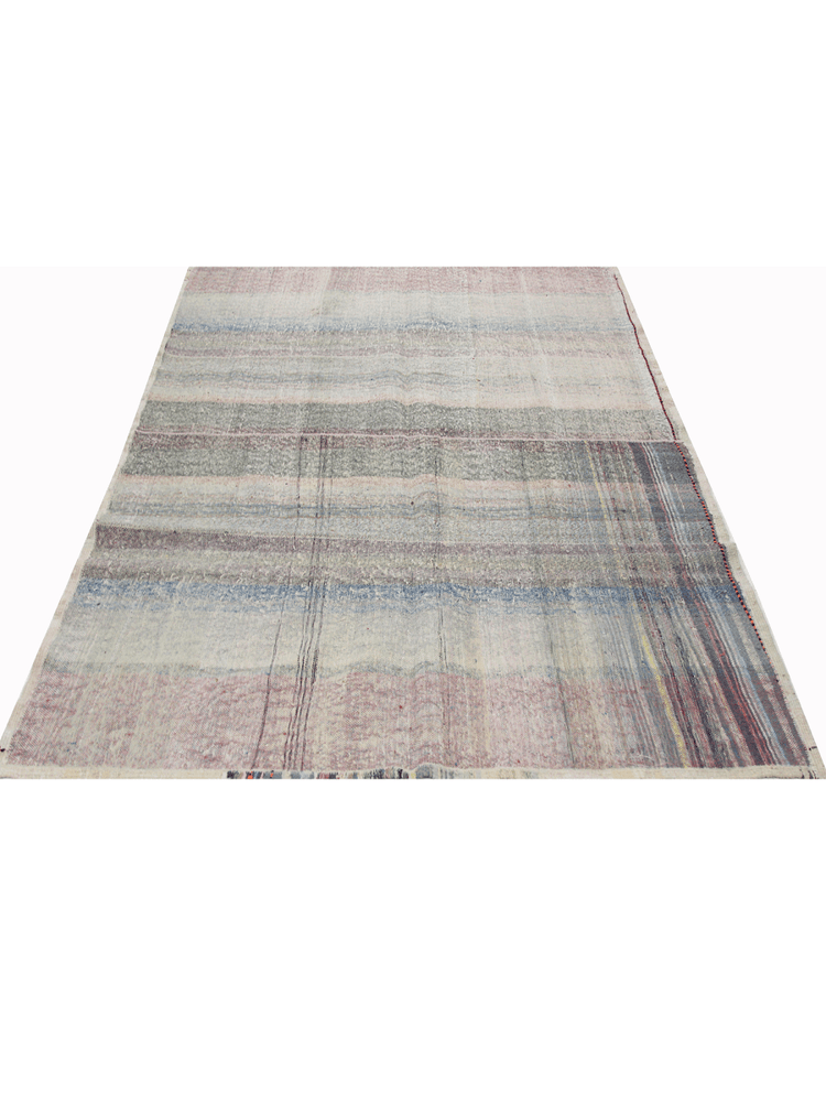 This 6x8 Persian Kilim rug showcases a stunning striped gradient pattern with horizontal bands of muted blue, grays, purples, and greens. The seamless blending of colors creates a watercolor-like effect, adding an artistic and sophisticated touch to any space. Handwoven from high-quality wool, this flat-weave rug offers both durability and flexibility while maintaining a soft, lightweight texture. Its understated yet visually captivating design makes it a perfect choice for eclectic interiors, adding depth and a serene ambiance.