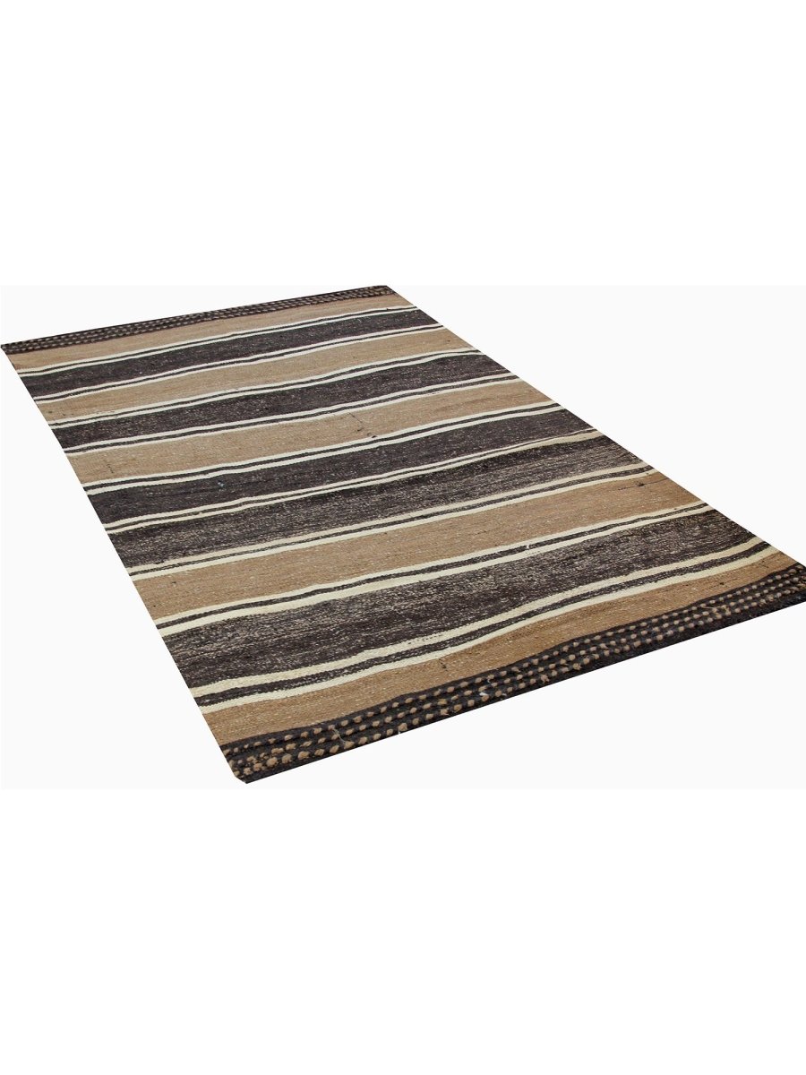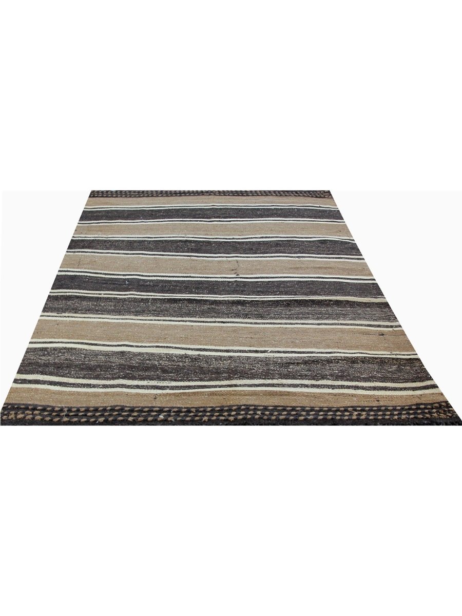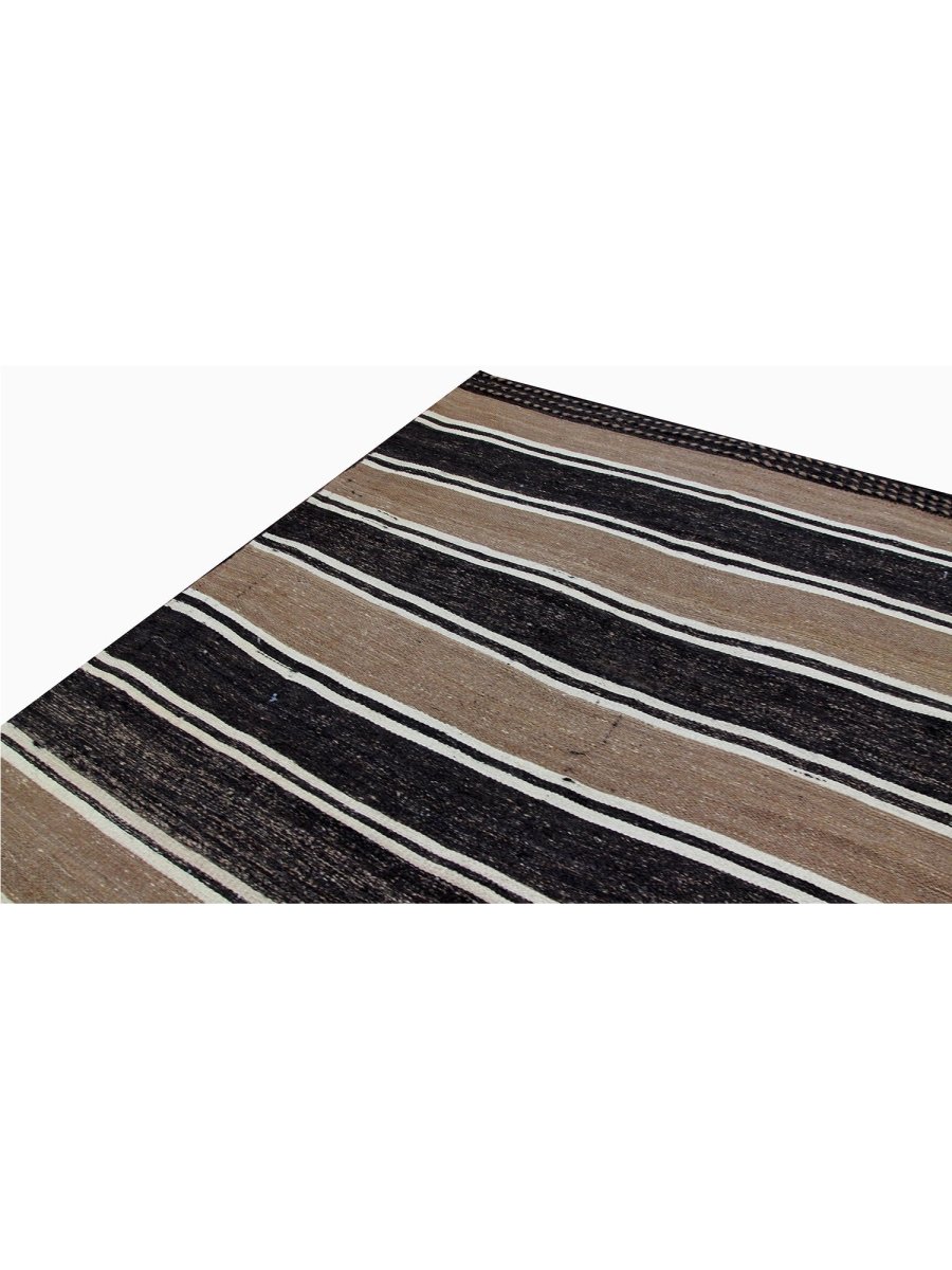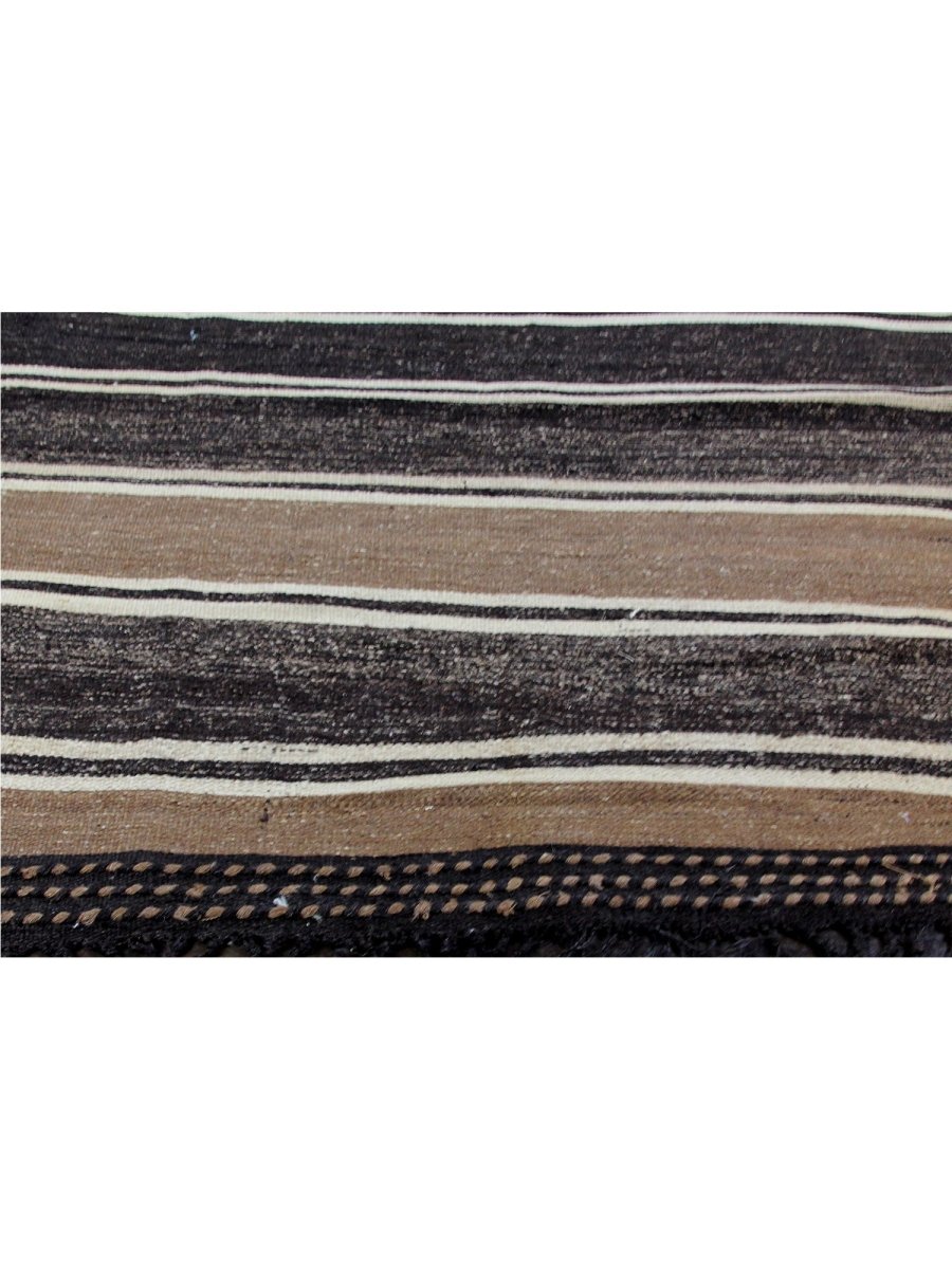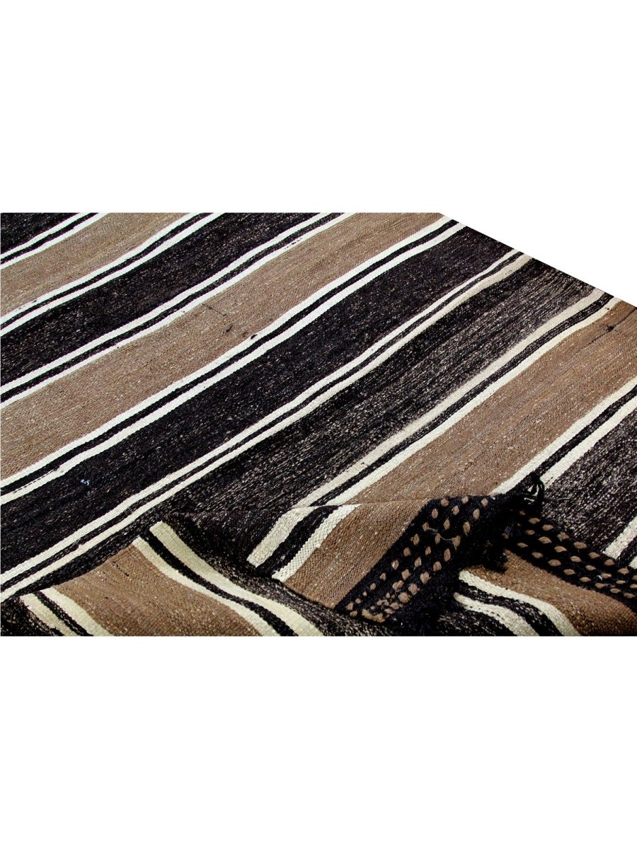 The 6x9 Old Persian Kilim Area Rug blends earthy tones with timeless striped design for a rustic yet refined aesthetic. Hand-knotted in Persia using durable wool, this rug features alternating stripes of deep black, warm brown, and crisp ivory. The bold linear pattern creates a clean, structured design, while the woven details add subtle texture. This versatile rug enhances classical, rustic, or chic spaces, providing warmth and character to living rooms, bedrooms, or hallways. Crafted with high-quality wool, this rug offers durability and softness underfoot, ensuring lasting comfort and visual appeal. A versatile piece that seamlessly fits into various design aesthetics, it is a beautiful addition to elevate the ambiance of any room.