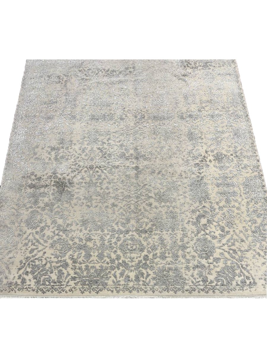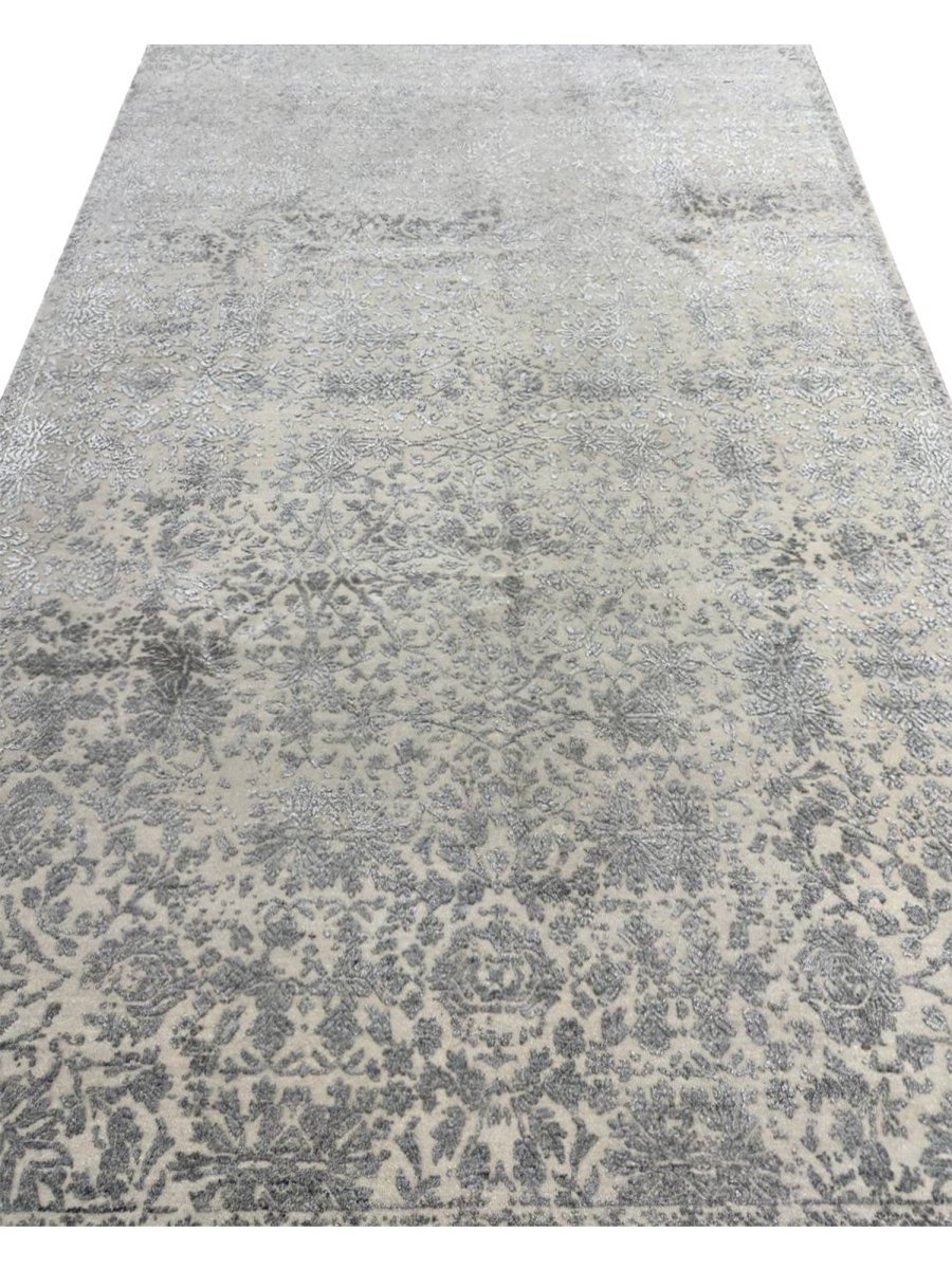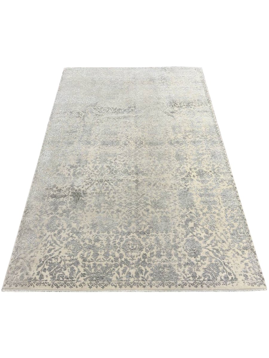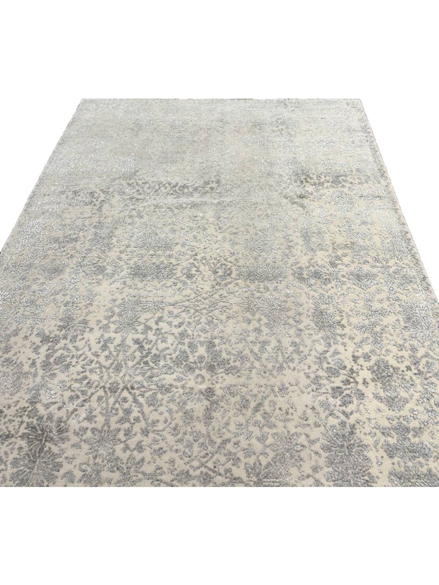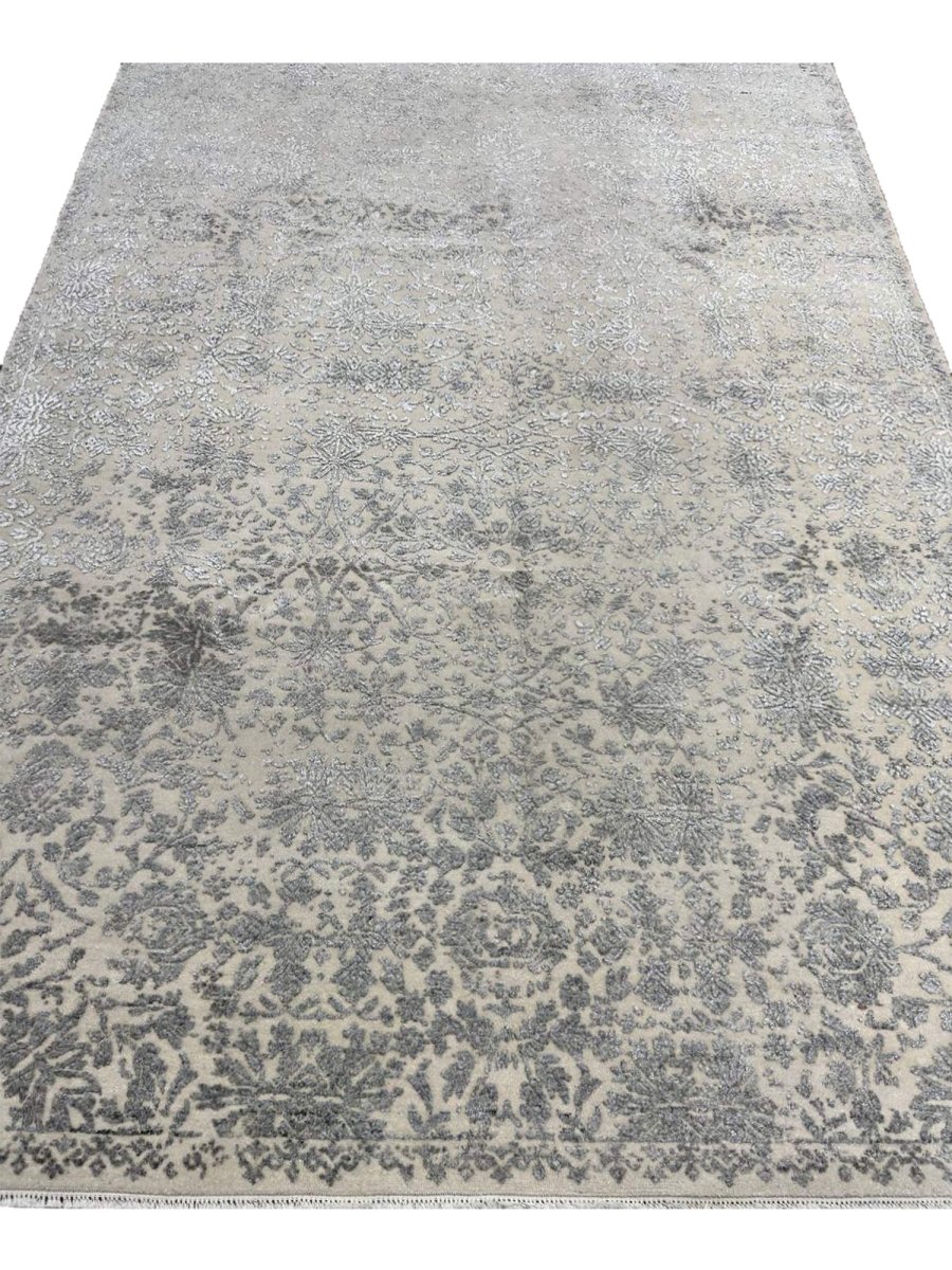 Enhance your bedrooms, living rooms, or home offices with the distinctive charm of this 6x9 transitional area rug. It is handwoven in India from premium wool and showcases a beautiful floral pattern, updated with a modern sensibility. The design elegantly blends a classic floral motif with a contemporary distressed and faded aesthetic, creating a sophisticated and understated look. The neutral color palette of soft gray and cream adds a touch of subtle elegance to any space, making it easy to integrate with your existing decor. Crafted for durability and style, this transitional rug will be a cherished addition to your home. Its soft texture and intricate, time-worn detailing make it a cozy yet refined choice for any room. Shop now and get free delivery to your doorstep in the United States. Experience timeless design and comfort in one elegant piece.