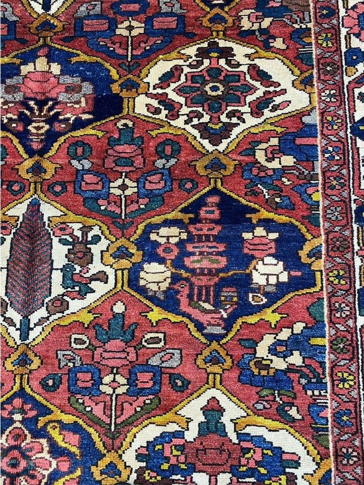 The 7x10 Antique Persian Bakhtiari Area Rug is a unique treasure that embodies the rich history of Persian weaving and will transform your living area. Made from high-quality wool, this gorgeous traditional rug features a geometric design that blends in perfectly with any type of interior design. It provides a friendly atmosphere and is perfect for large dining rooms, comfortable living spaces, or as a chic addition in your workplace. It is a multipurpose addition to your house because of the striking blend of red, blue, ivory, and pink that offer depth and character. This amazing carpeting is a stunning work of art that elevates your living area and goes beyond simple decoration. Take advantage of free US delivery.