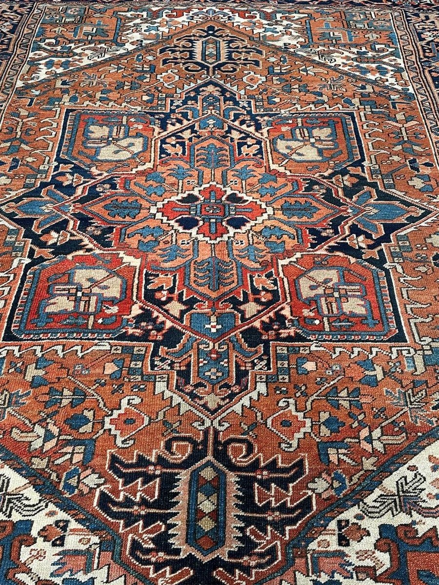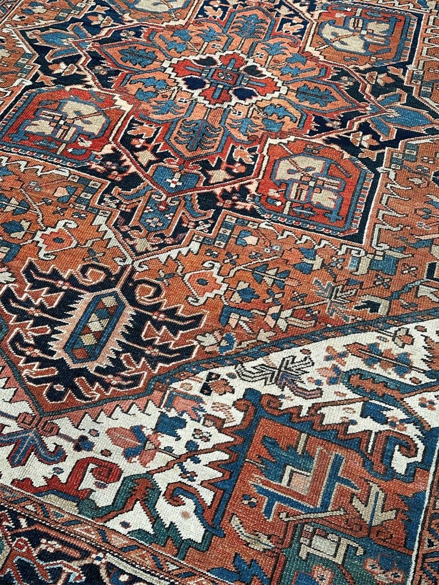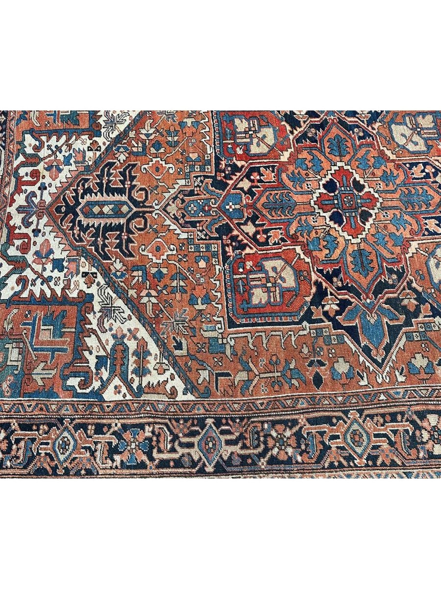 Decorate your space with the striking beauty of this 7x10 Antique Persian Heriz area rug. The magnificent rug is handmade in Persia from wool and showcases a commanding central medallion design. The background presents a beautiful orange tone, providing the classic backdrop to the intricate design. Rich geometric motifs have a color palette of navy blue, light blue, beige, brown, and red accents. This piece is perfect for anchoring bedrooms, living rooms, or dining areas. Crafted with traditional hand-making techniques, this wool rug offers enduring durability and a soft touch underfoot. Enjoy the convenience of free and fast delivery within the United States.