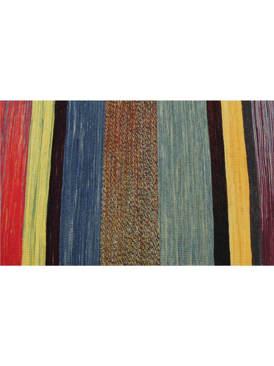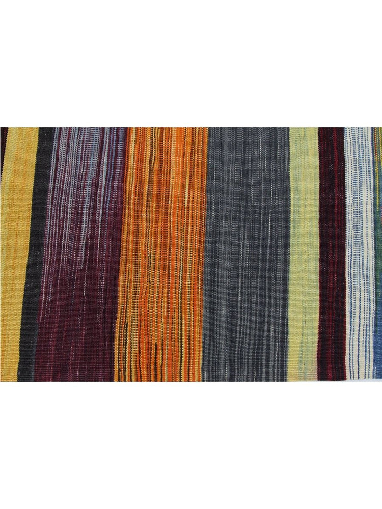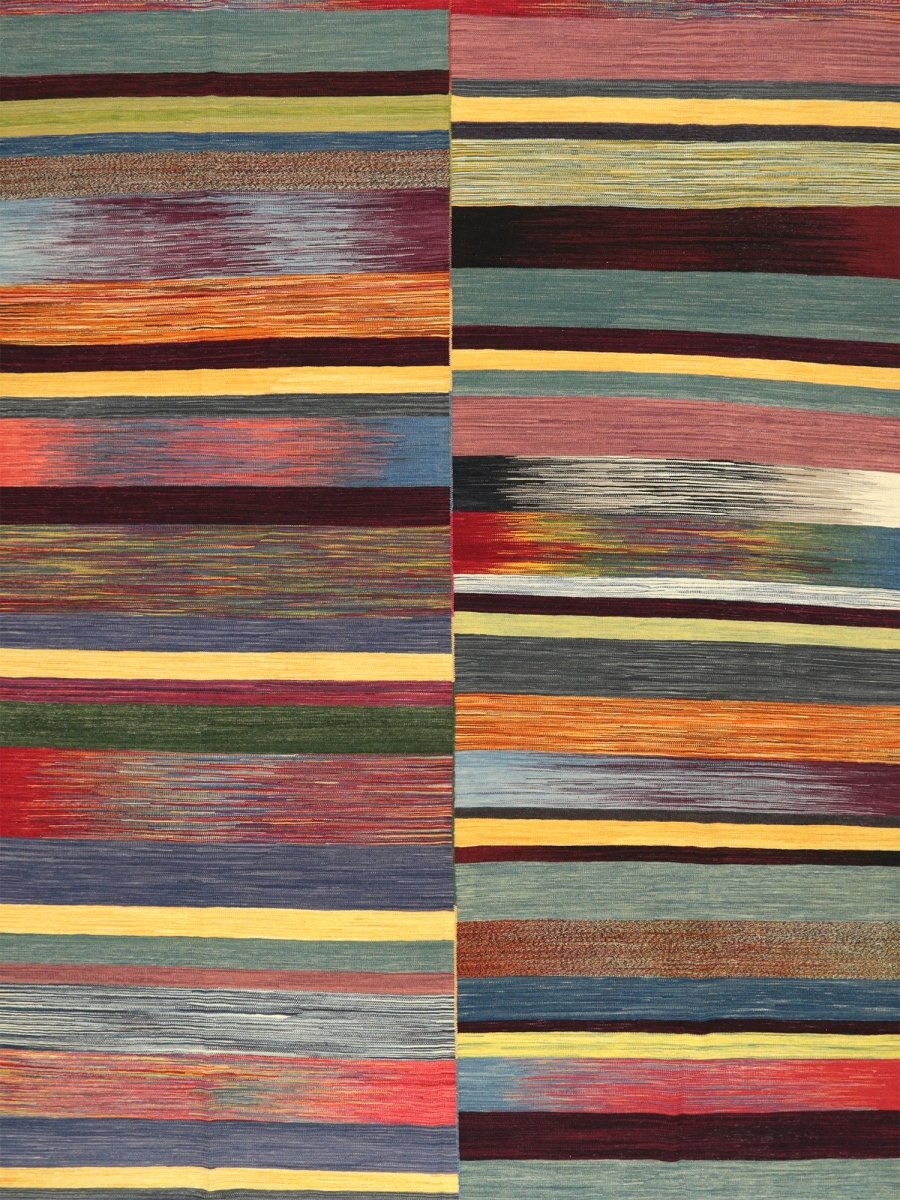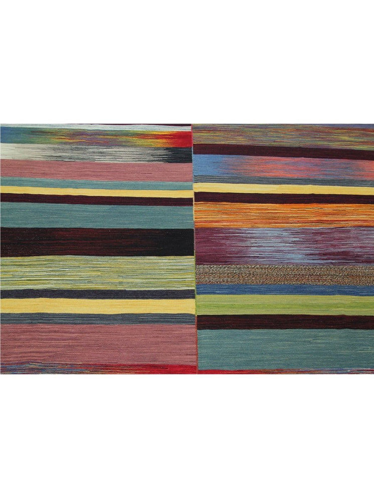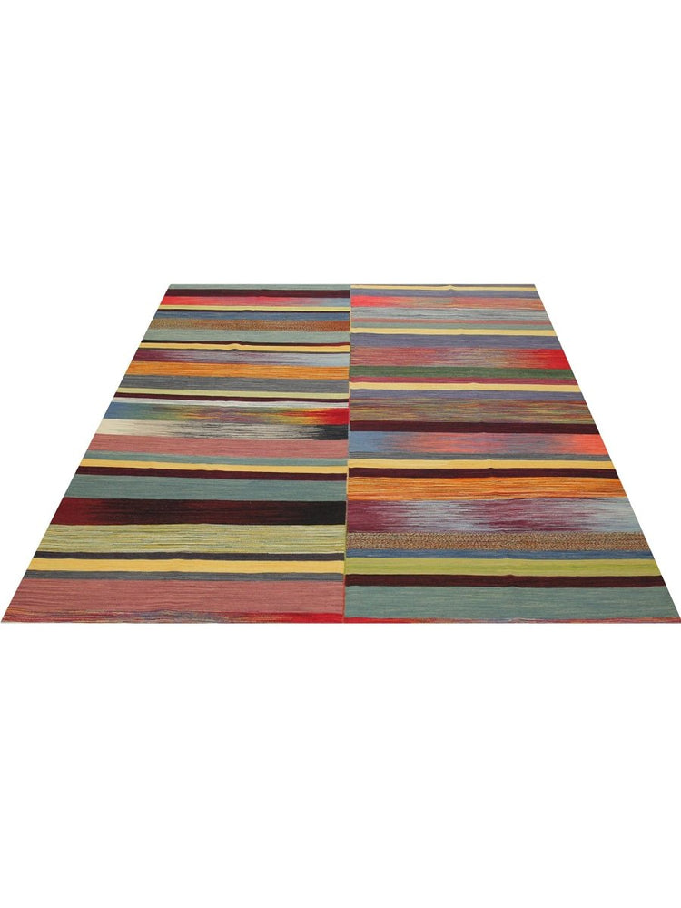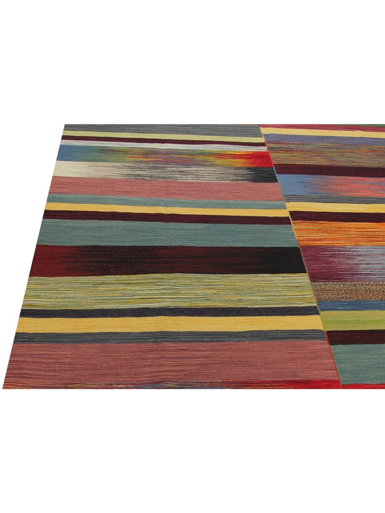 This 7x10 Persian Kilim area rug showcases a striking parallel stripe pattern in a vivid mix of yellow, blue, red, pink, rust, orange, and green. The bold and harmonious color combination creates a dynamic and visually engaging design, making it a standout piece in any space. Handwoven from high-quality Persian wool, this flatweave rug offers durability and a lightweight feel, ideal for both trendy and eclectic interiors. Its vibrant aesthetic brings warmth, energy, and cultural charm.