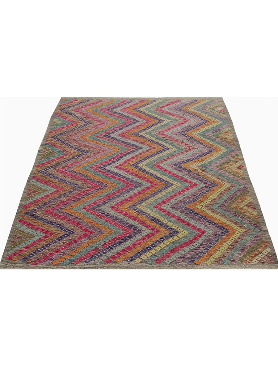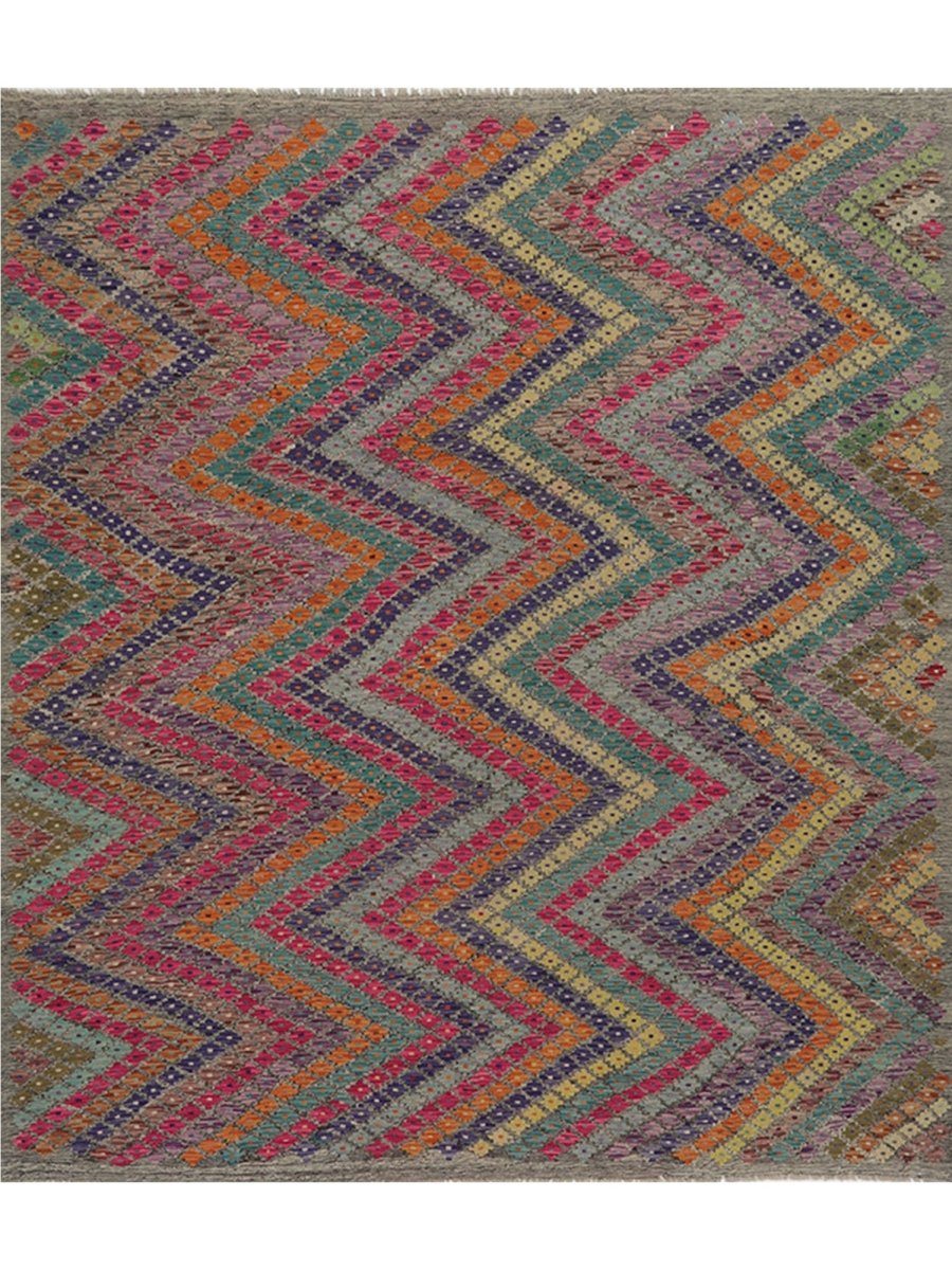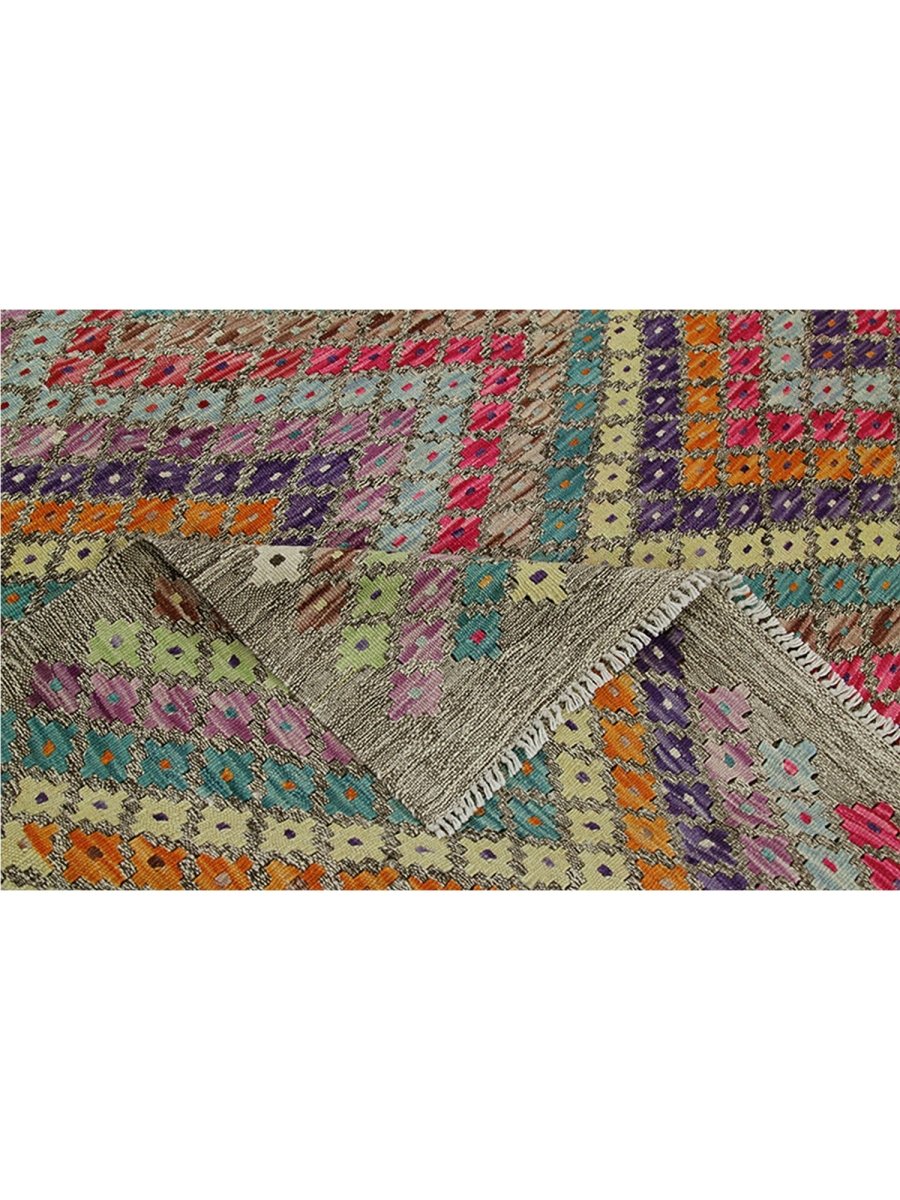 This 7x9 Turkish Kilim rug features a vibrant striped pattern in pink, gray, orange, yellow, and green, making it a bold addition to any interior. Handwoven from 100% wool which makes it soft, strong and this flat-weave rug is lightweight yet durable. Its striking color palette enhances any home decor effortlessly.