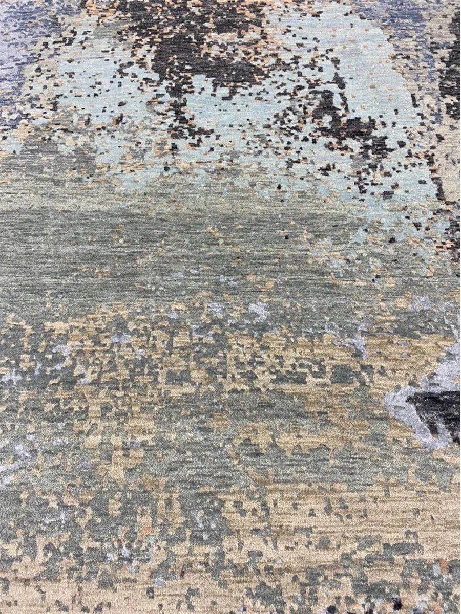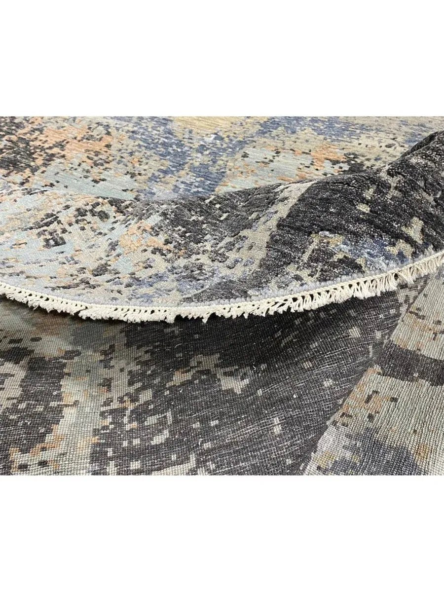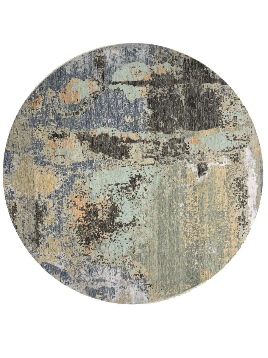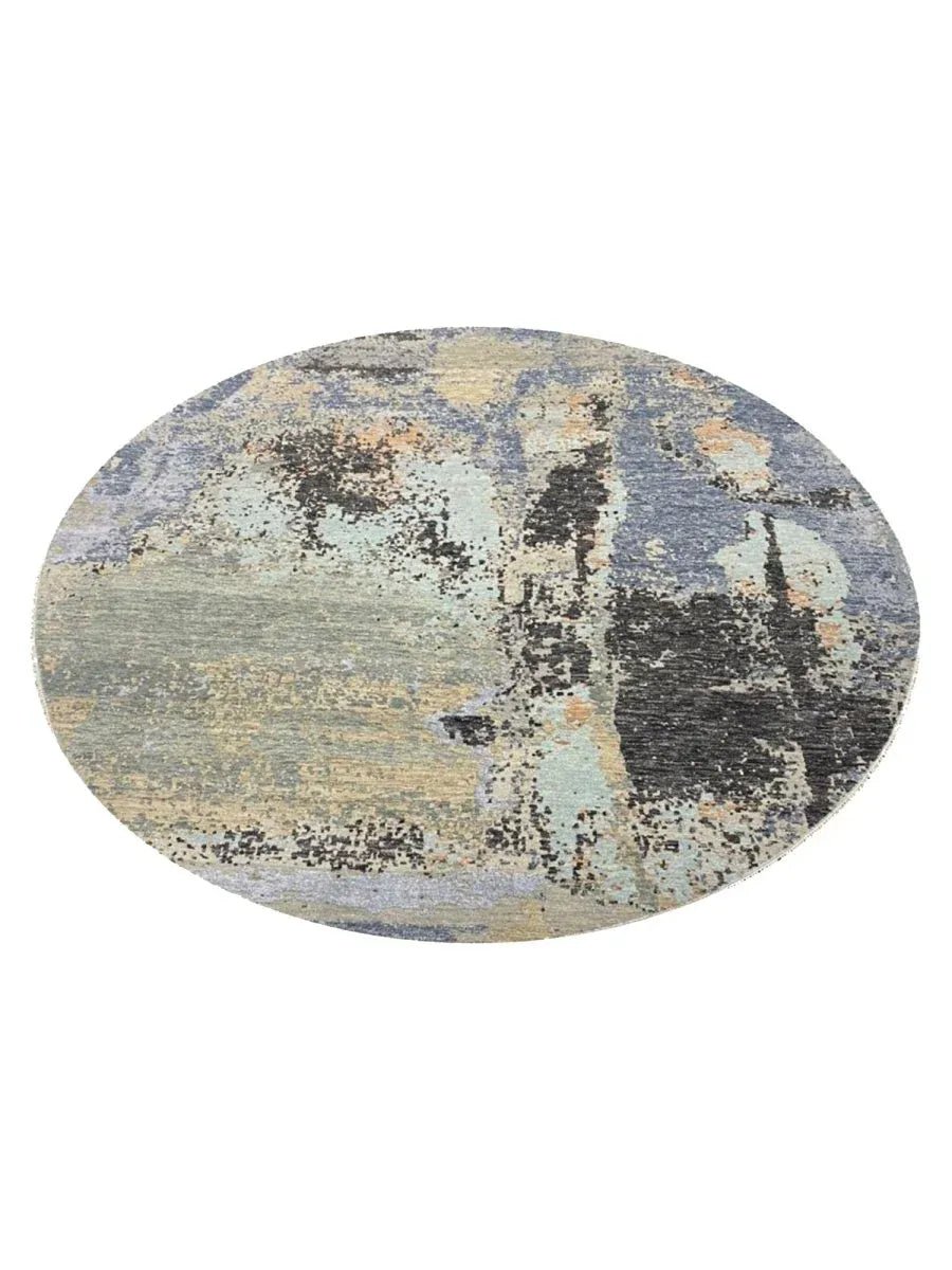 Enhance your home with this magnificent 8x8 round Modern Abstract area rug. Expertly hand-knotted in India, this new rug is crafted from premium wool and bamboo silk, offering a luxurious sheen and exceptional softness. Featuring a striking abstract pattern in green, gray, blue, and tan, this rug brings depth and sophistication to any space. Its plush texture and durable craftsmanship provide lasting comfort and quality. The round shape enhances visual appeal, creating a stylish focal element while adding softness and balance to the overall design. Blending aesthetic impact with inviting comfort, this rug offers both visual interest and a refined, welcoming feel.