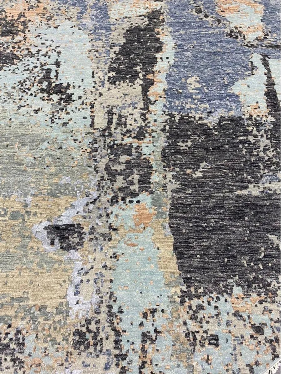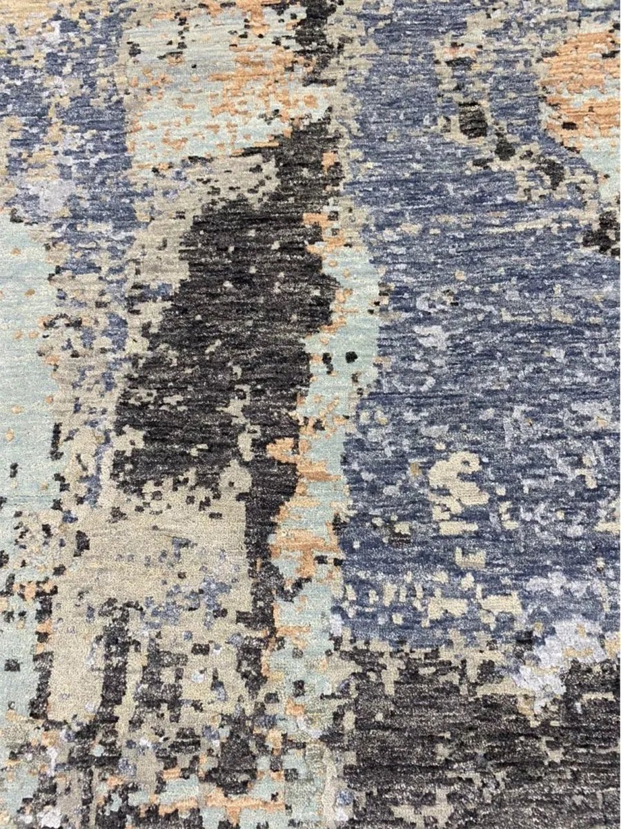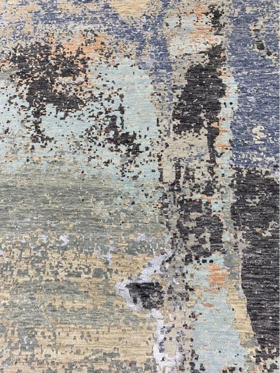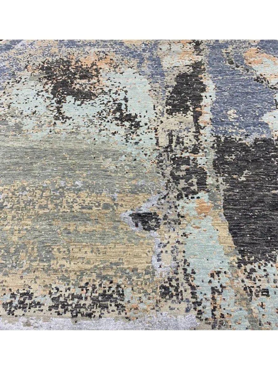 Enhance your home with this magnificent 8x8 round Modern Abstract area rug. Expertly hand-knotted in India, this new rug is crafted from premium wool and bamboo silk, offering a luxurious sheen and exceptional softness. Featuring a striking abstract pattern in green, gray, blue, and tan, this rug brings depth and sophistication to any space. Its plush texture and durable craftsmanship provide lasting comfort and quality. The round shape enhances visual appeal, creating a stylish focal element while adding softness and balance to the overall design. Blending aesthetic impact with inviting comfort, this rug offers both visual interest and a refined, welcoming feel.