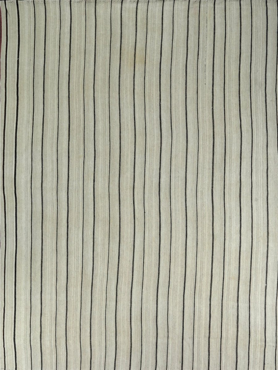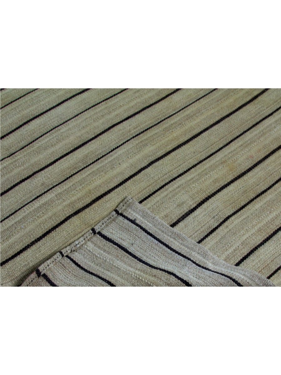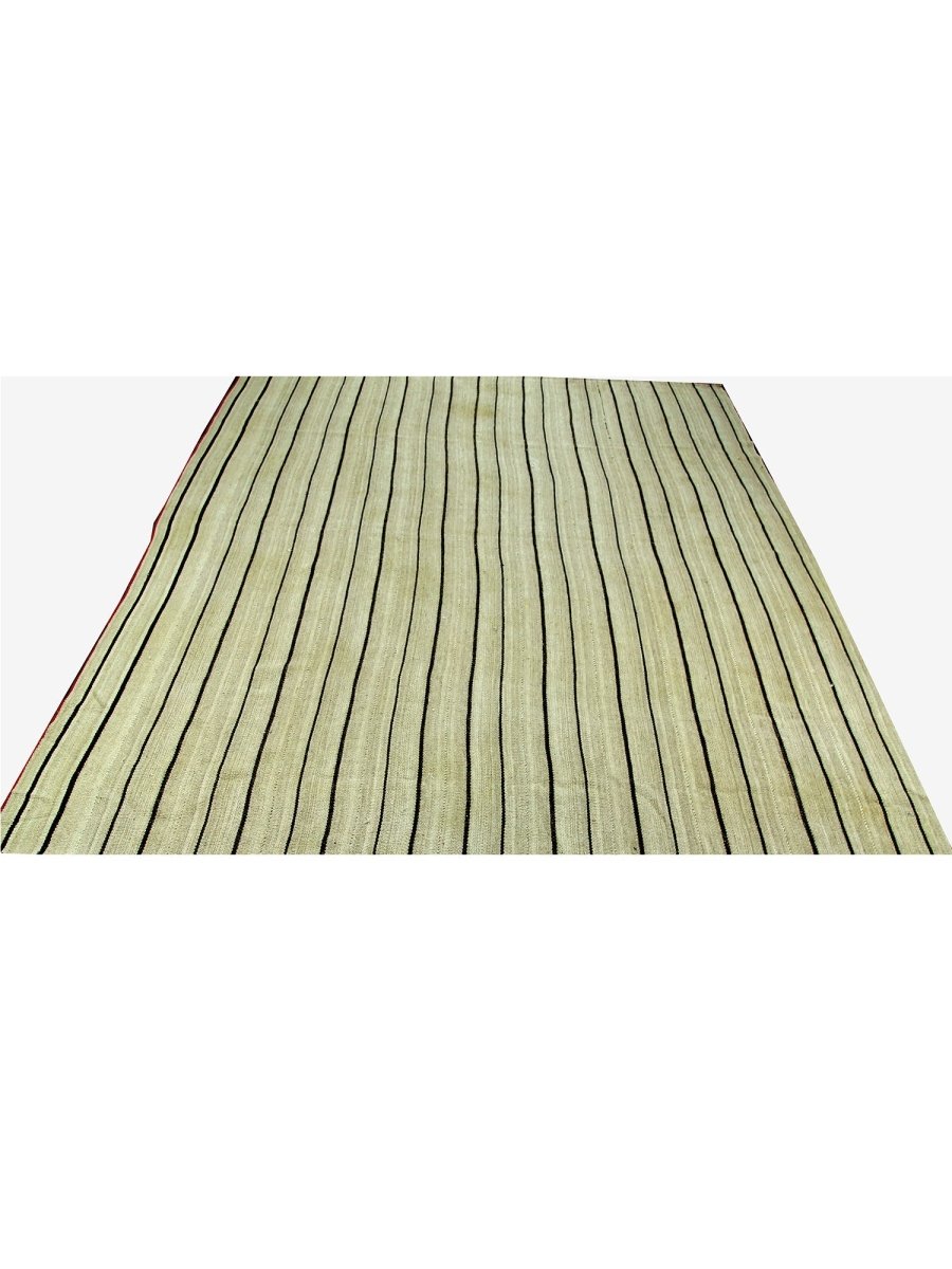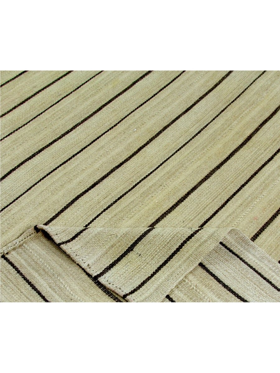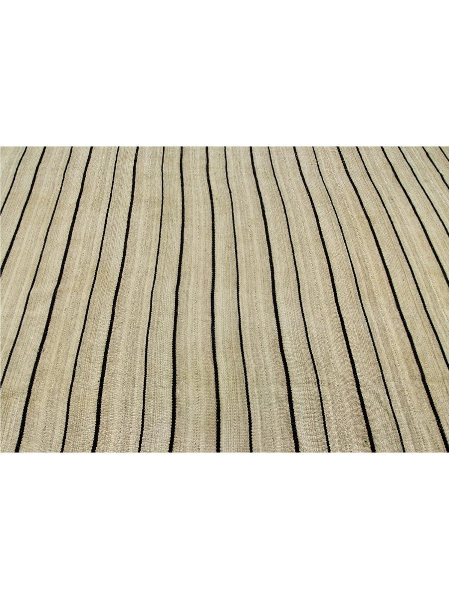The 8x11 Old Persian Kilim Area Rug offers timeless charm with its minimalist yet sophisticated design. Hand-knotted in Persia from premium wool, this rug features a warm beige base adorned with thin, evenly spaced black stripes running vertically. The neutral color palette enhances the rug's organic texture, while the subtle stripe pattern adds structure and elegance. The simple yet impactful design makes this rug a versatile choice for sleek, Scandinavian, or minimalist interiors. Ideal for living rooms, bedrooms, or dining spaces, its understated tones ensure it blends effortlessly with various color schemes while adding warmth and texture.