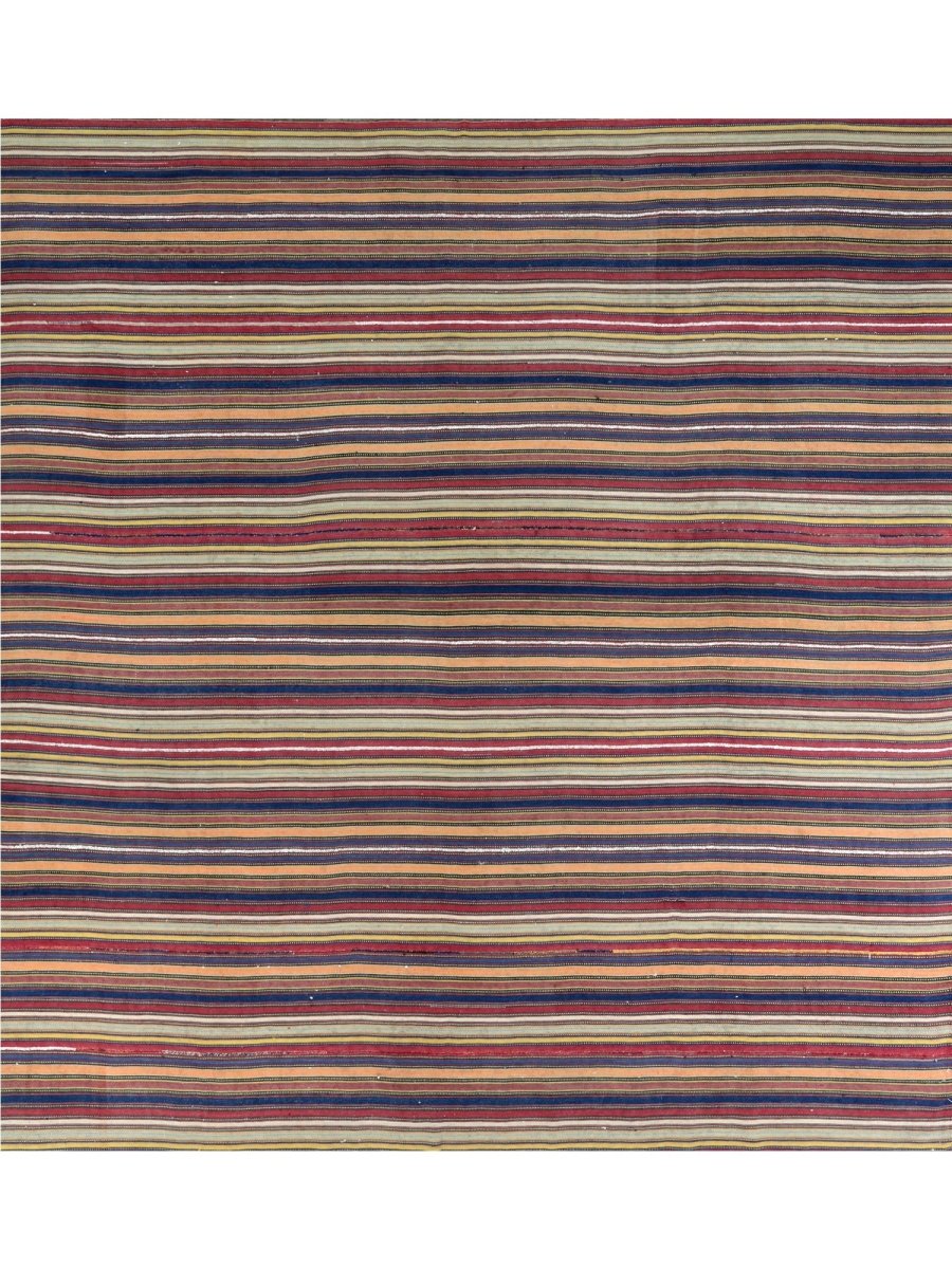 This 9x9 Old Persian Kilim Rug showcases a striking striped pattern in rich red, blue, peach, brown, and yellow hues, adding warmth and character to any space. Hand-knotted in Persia from high-quality wool, this flat-weave rug is durable and lightweight, making it an excellent choice for high-traffic areas. The bold yet harmonious color palette enhances its visual appeal, seamlessly complementing rustic, bohemian, or eclectic interiors. With its intricate craftsmanship and cultural significance, this Persian Kilim is a functional floor covering and a timeless decorative piece, bringing authenticity and charm to your home.