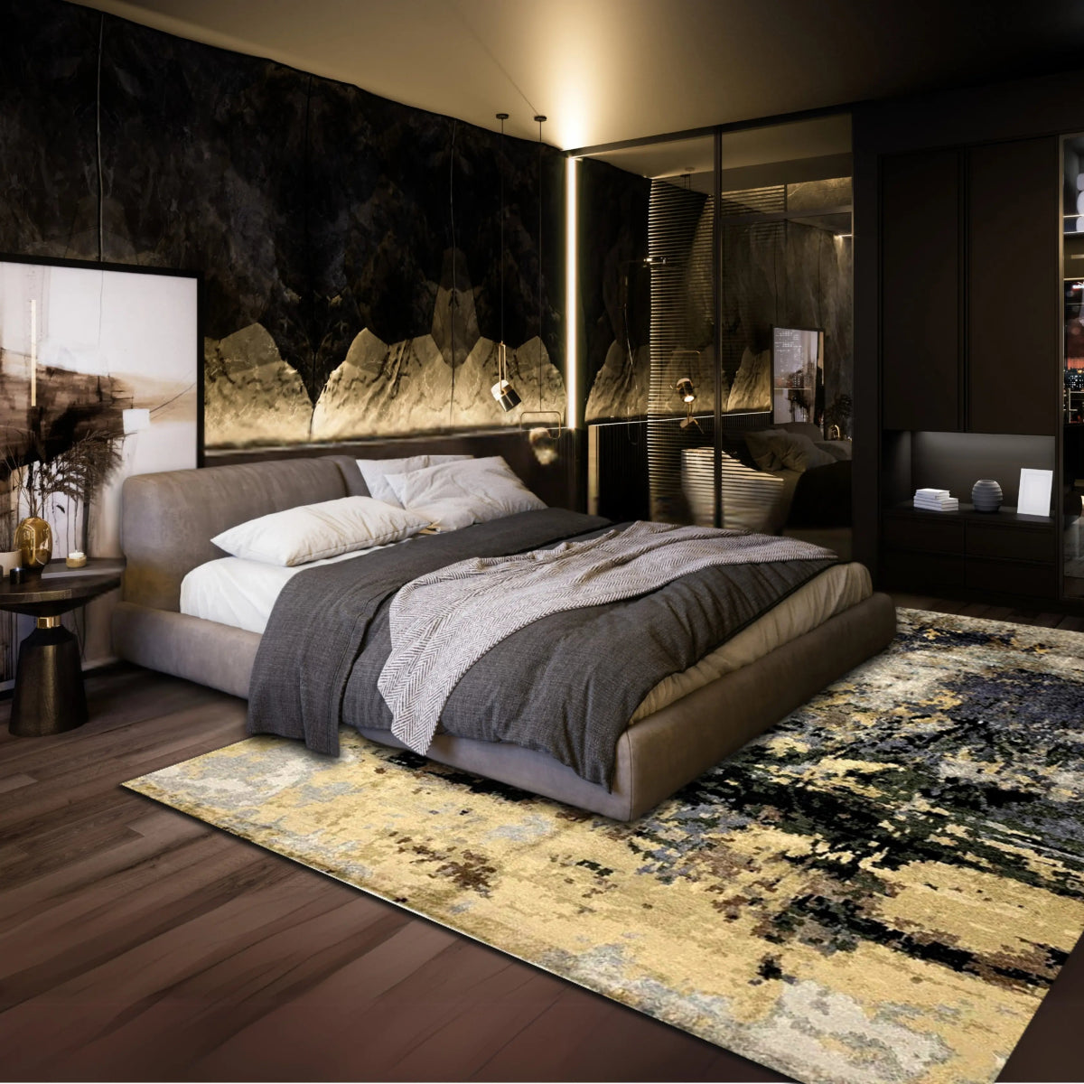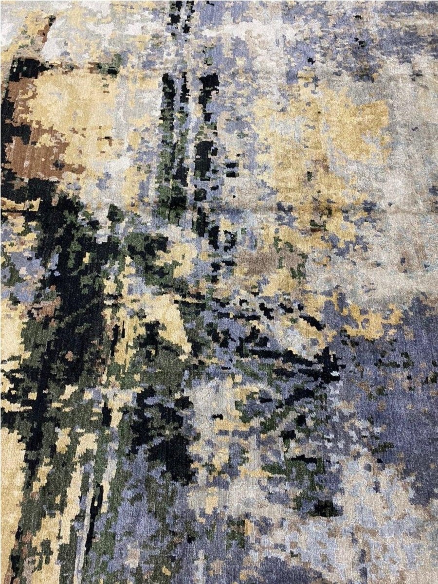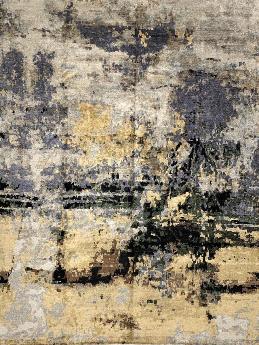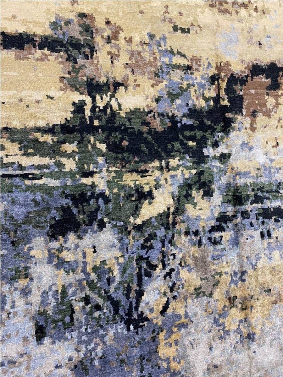 Add a touch of casual style with this 8x10 Modern Abstract Area Rug, crafted in India. This rug features a captivating abstract pattern, showcasing a simple yet effective design in a soft palette of beige, gold, blue, gray, green, black, and brown. Its durable bamboo silk construction ensures longevity and easy care, while the clean finish reflects quality craftsmanship and thoughtful design. This piece effortlessly brightens any interior, adding warmth, texture, and a relaxed feel. A balanced blend of simplicity and function, it enhances a wide range of decor styles with ease. Enjoy the benefit of free shipping across the United States. Each rug offers a distinct look, with subtle variations inherent to its creation.