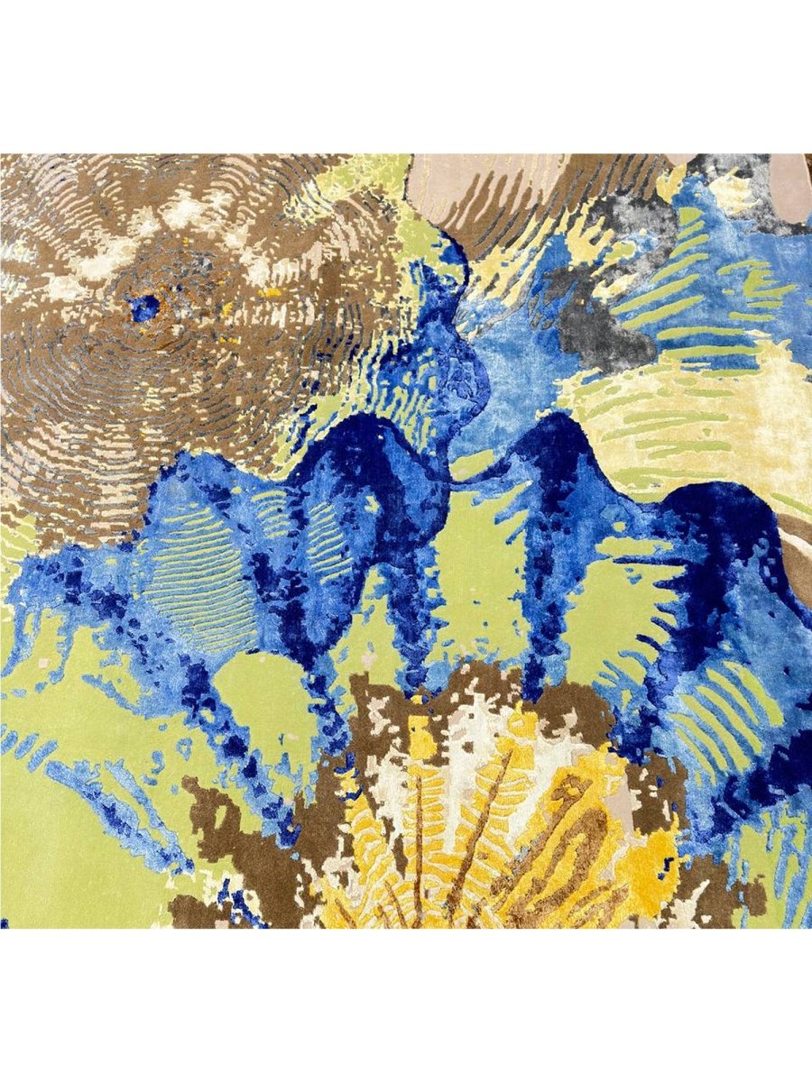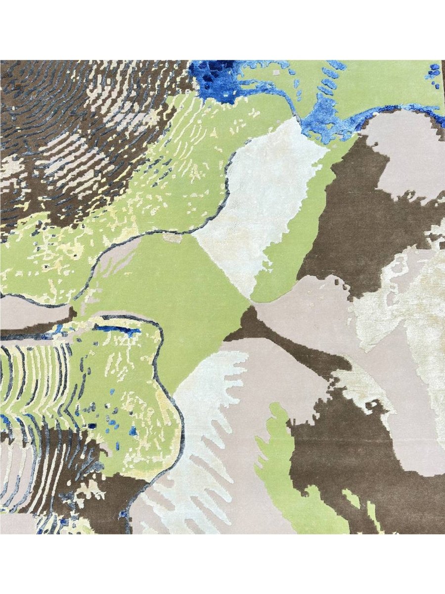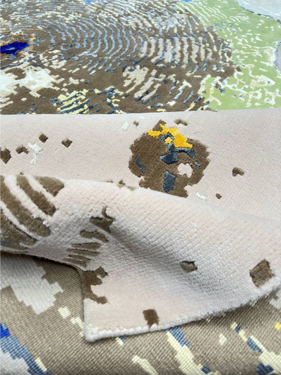 Immerse your space in the vibrant artistry of this magnificent 8x10 Modern Abstract area rug. Hand-knotted in India, this piece showcases exceptional craftsmanship and a bold artistic vision. Its versatile size makes it a stunning addition to various settings, from living rooms and dining areas to creative studios. The rug features a dynamic abstract pattern with organic shapes and textured details, set against soft beige and tan backgrounds. The design incorporates vivid blue, green, brown, and yellow splashes, creating a visually striking and energetic aesthetic. This rug is a true testament to modern design, promising to be a cherished piece that adds a contemporary and artistic touch to your home.