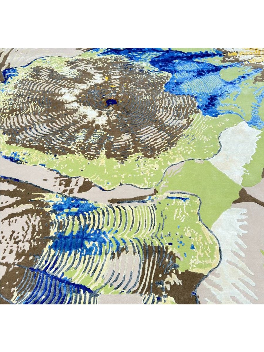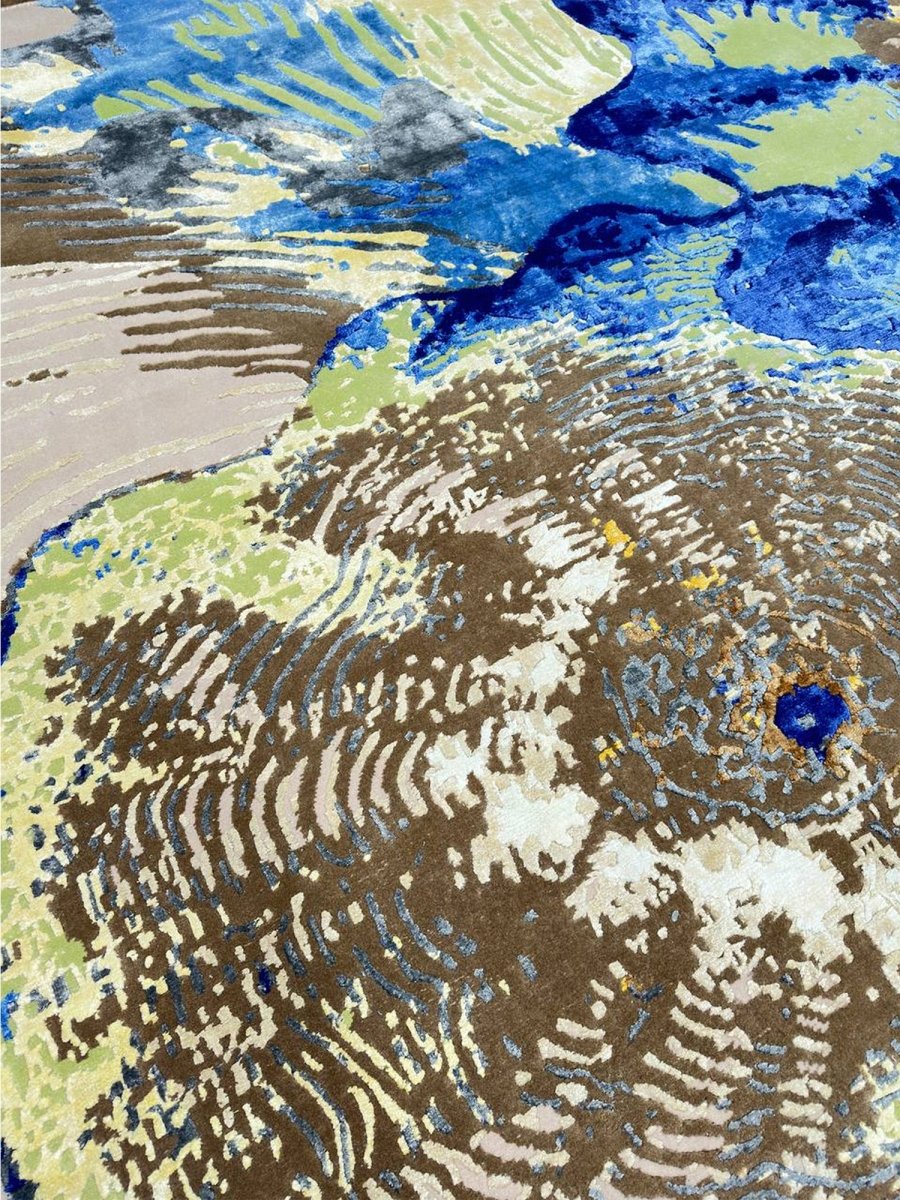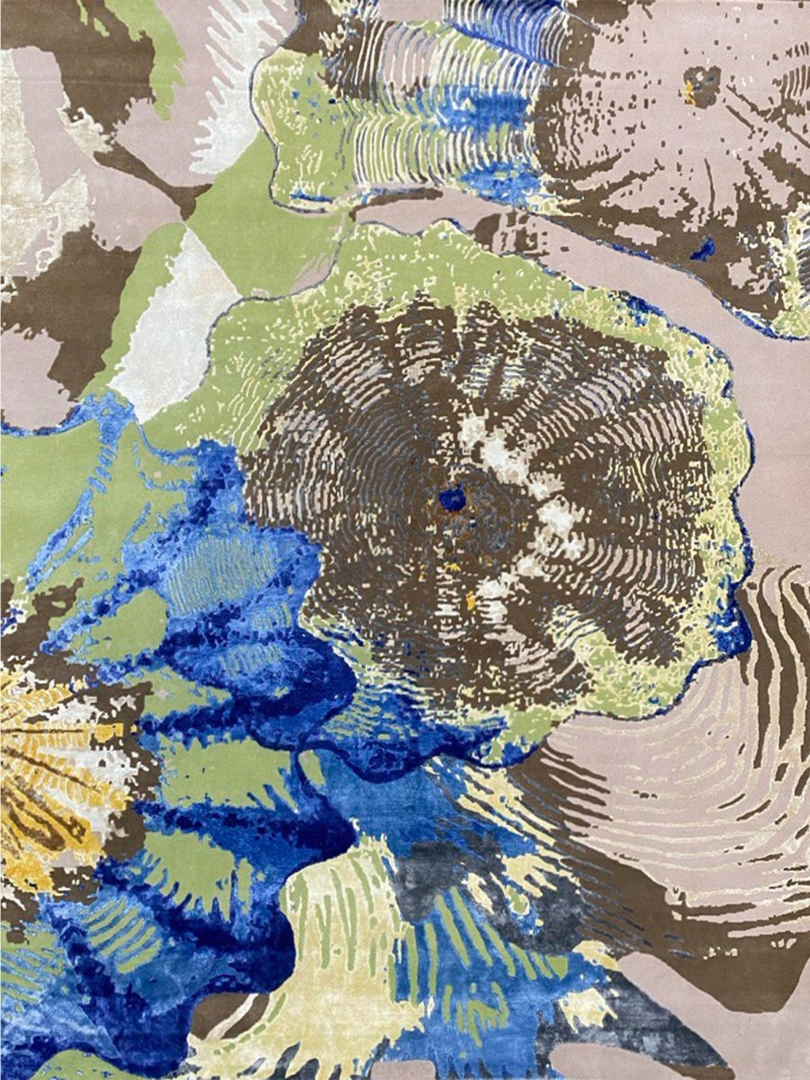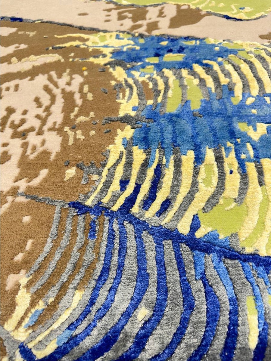 Immerse your space in the vibrant artistry of this magnificent 8x10 Modern Abstract area rug. Hand-knotted in India, this piece showcases exceptional craftsmanship and a bold artistic vision. Its versatile size makes it a stunning addition to various settings, from living rooms and dining areas to creative studios. The rug features a dynamic abstract pattern with organic shapes and textured details, set against soft beige and tan backgrounds. The design incorporates vivid blue, green, brown, and yellow splashes, creating a visually striking and energetic aesthetic. This rug is a true testament to modern design, promising to be a cherished piece that adds a contemporary and artistic touch to your home.