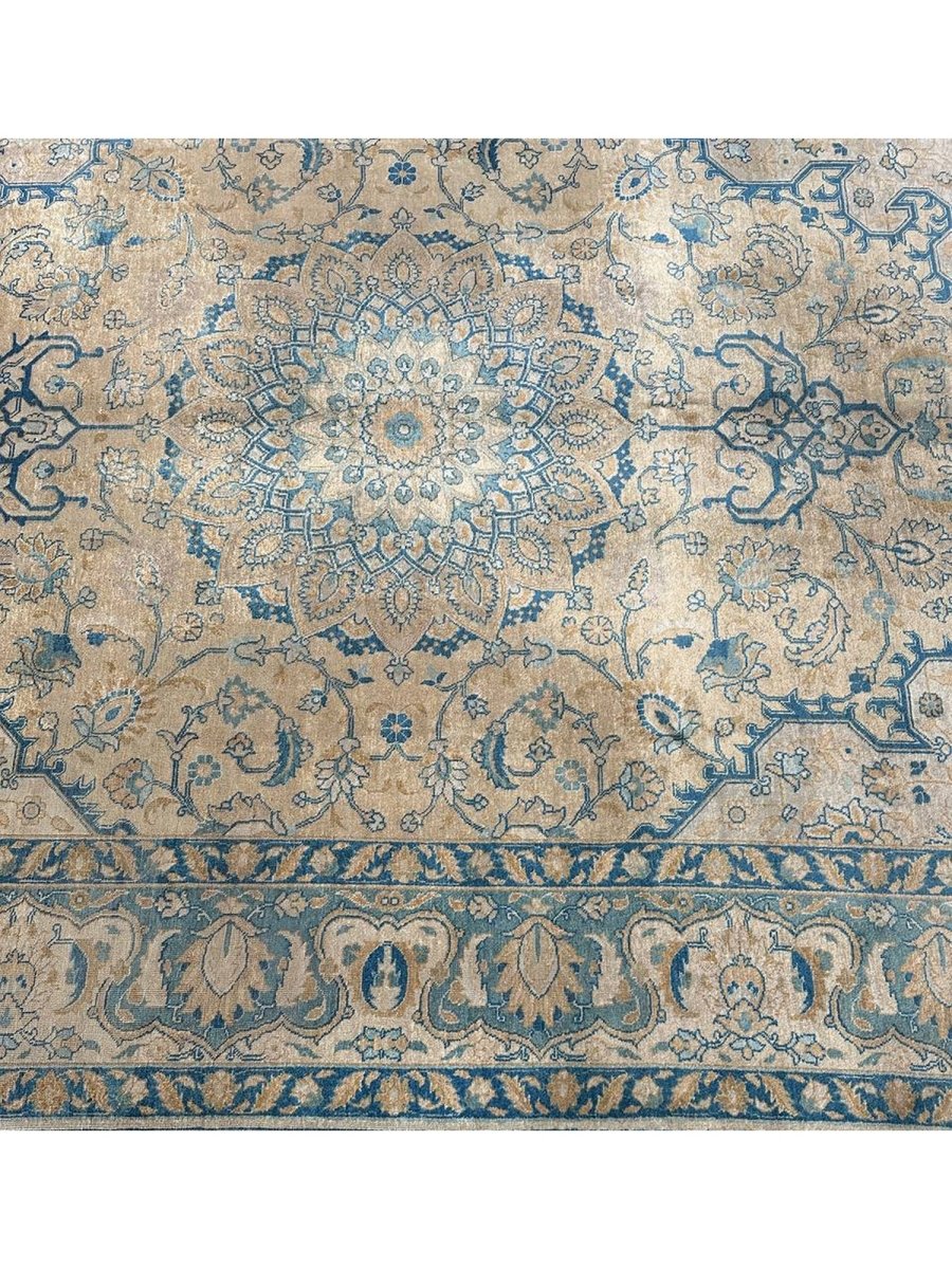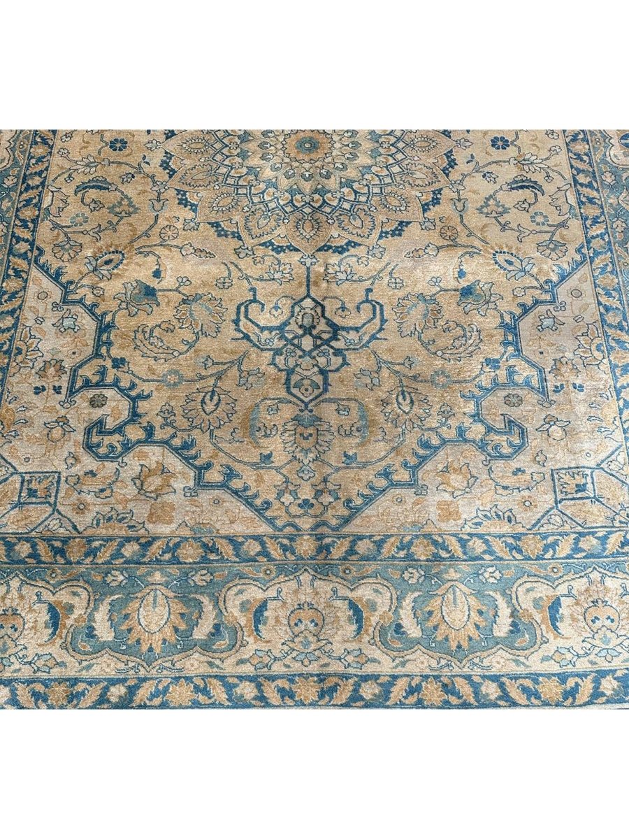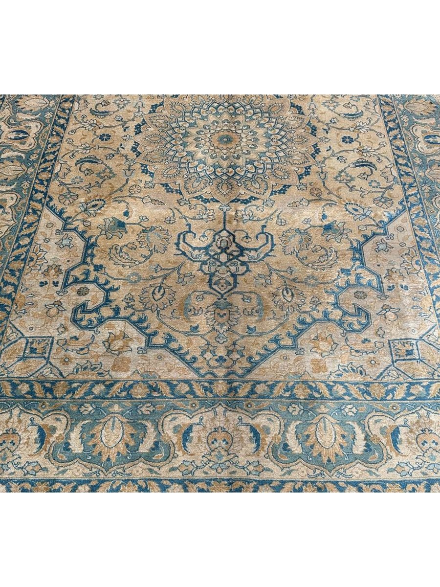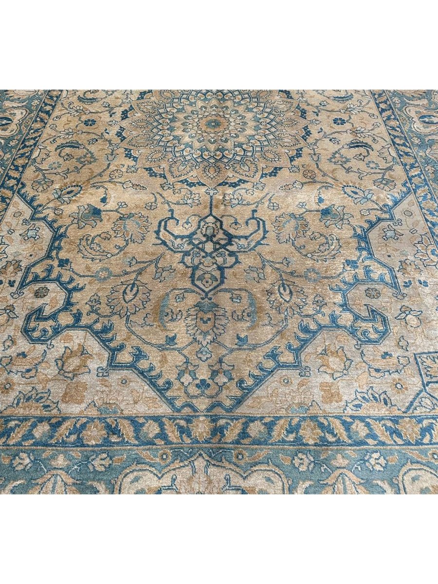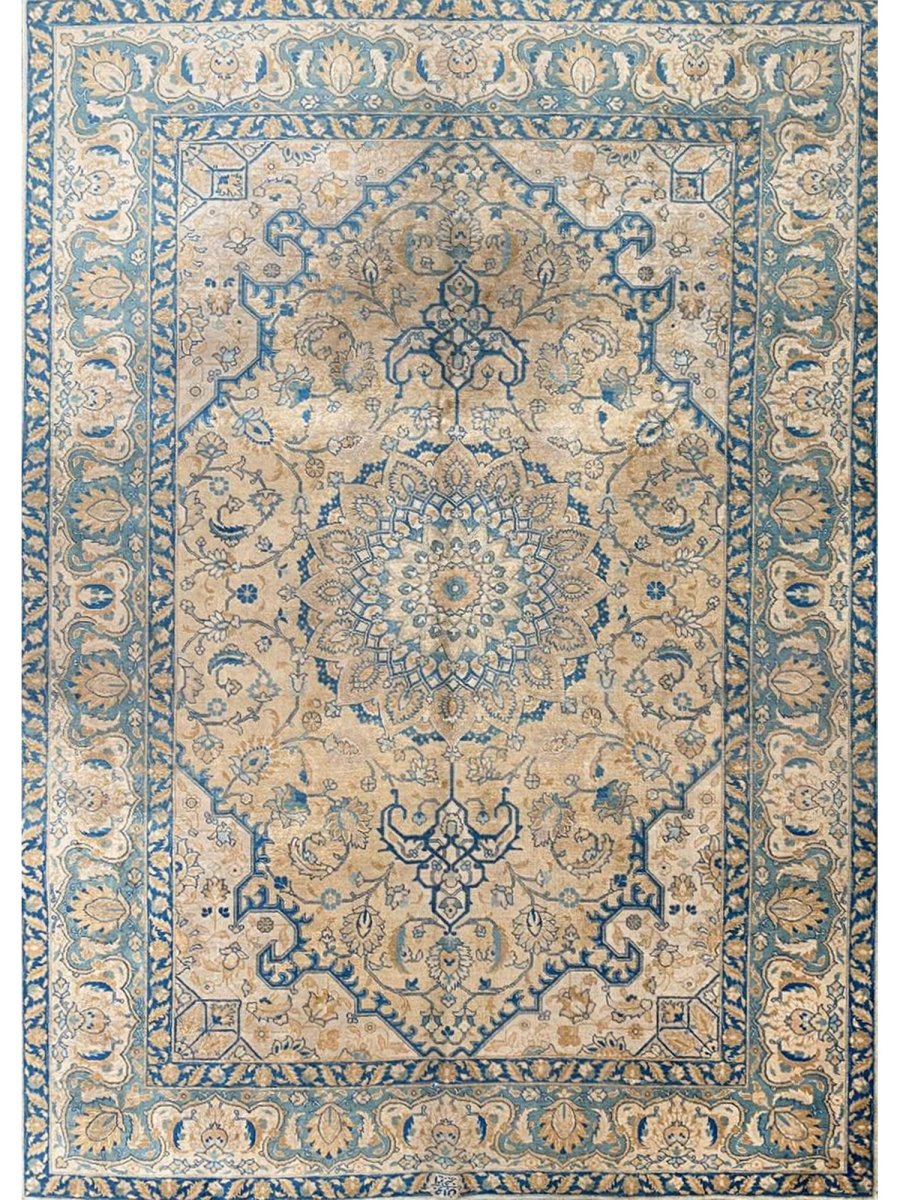 Decorate your space with the striking beauty of this 8x11 Antique Persian Tabriz area rug. The magnificent rug is handmade in Persia from wool and showcases a commanding central medallion design. The background presents a beautiful ivory tone, providing the classic backdrop to intricate design. The floral motifs have a color palette of muted blue, warm beige, and brown accents. This generously sized piece is perfect for anchoring spacious bedrooms, living rooms, or dining areas. Crafted with traditional hand-making techniques, this wool rug offers enduring durability and a soft touch underfoot. Enjoy the convenience of free and fast delivery within the United States.