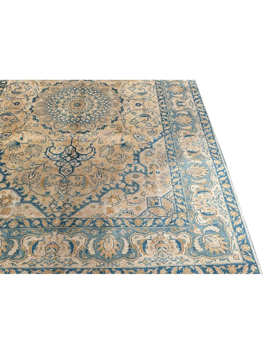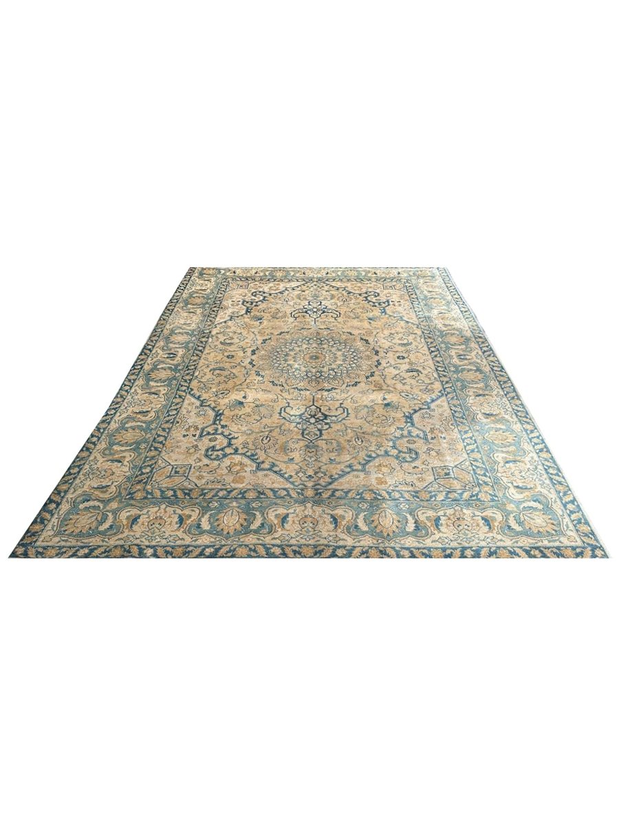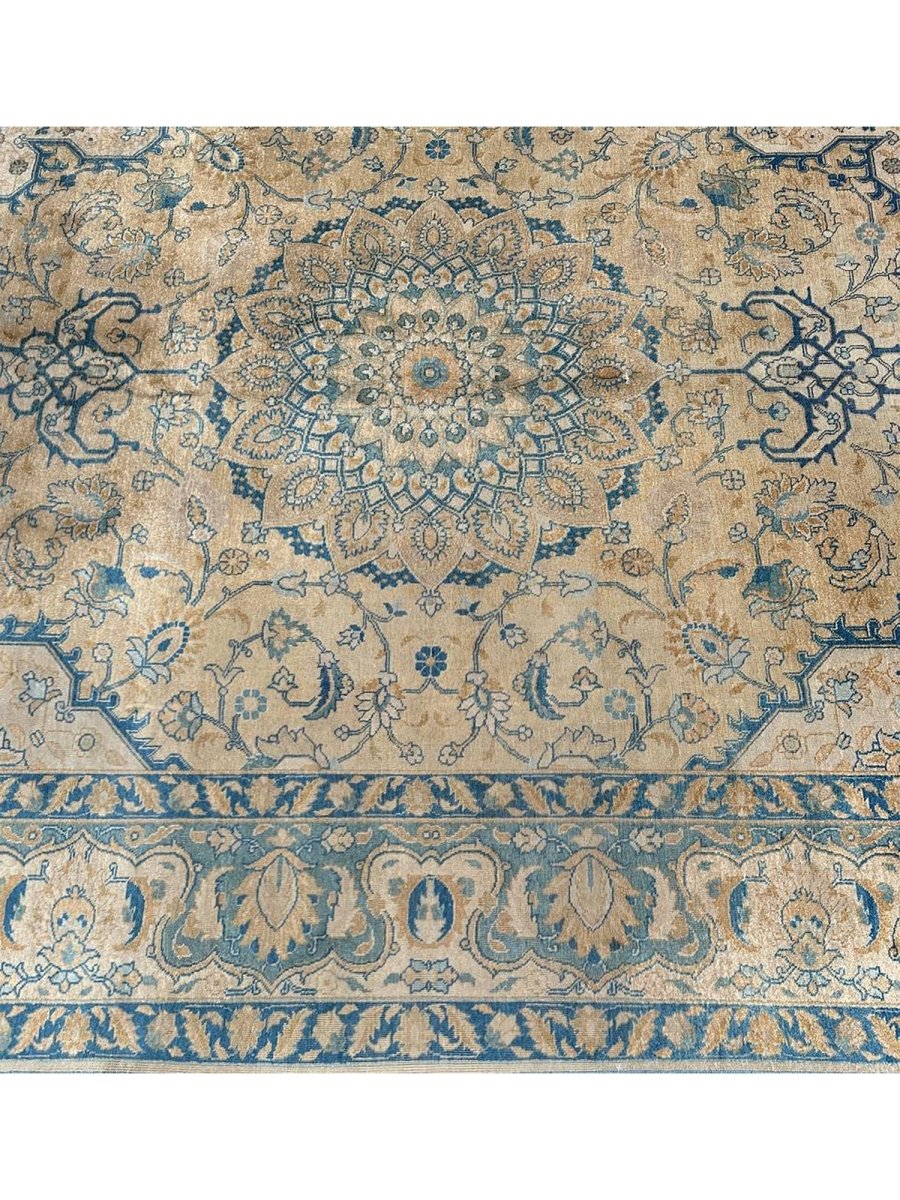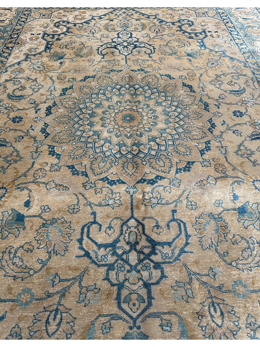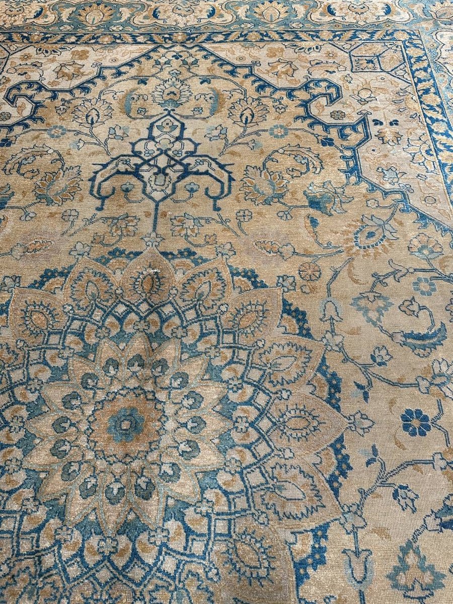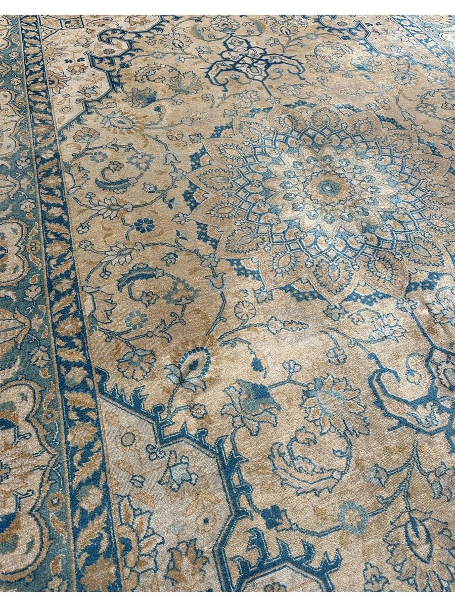 Decorate your space with the striking beauty of this 8x11 Antique Persian Tabriz area rug. The magnificent rug is handmade in Persia from wool and showcases a commanding central medallion design. The background presents a beautiful ivory tone, providing the classic backdrop to intricate design. The floral motifs have a color palette of muted blue, warm beige, and brown accents. This generously sized piece is perfect for anchoring spacious bedrooms, living rooms, or dining areas. Crafted with traditional hand-making techniques, this wool rug offers enduring durability and a soft touch underfoot. Enjoy the convenience of free and fast delivery within the United States.