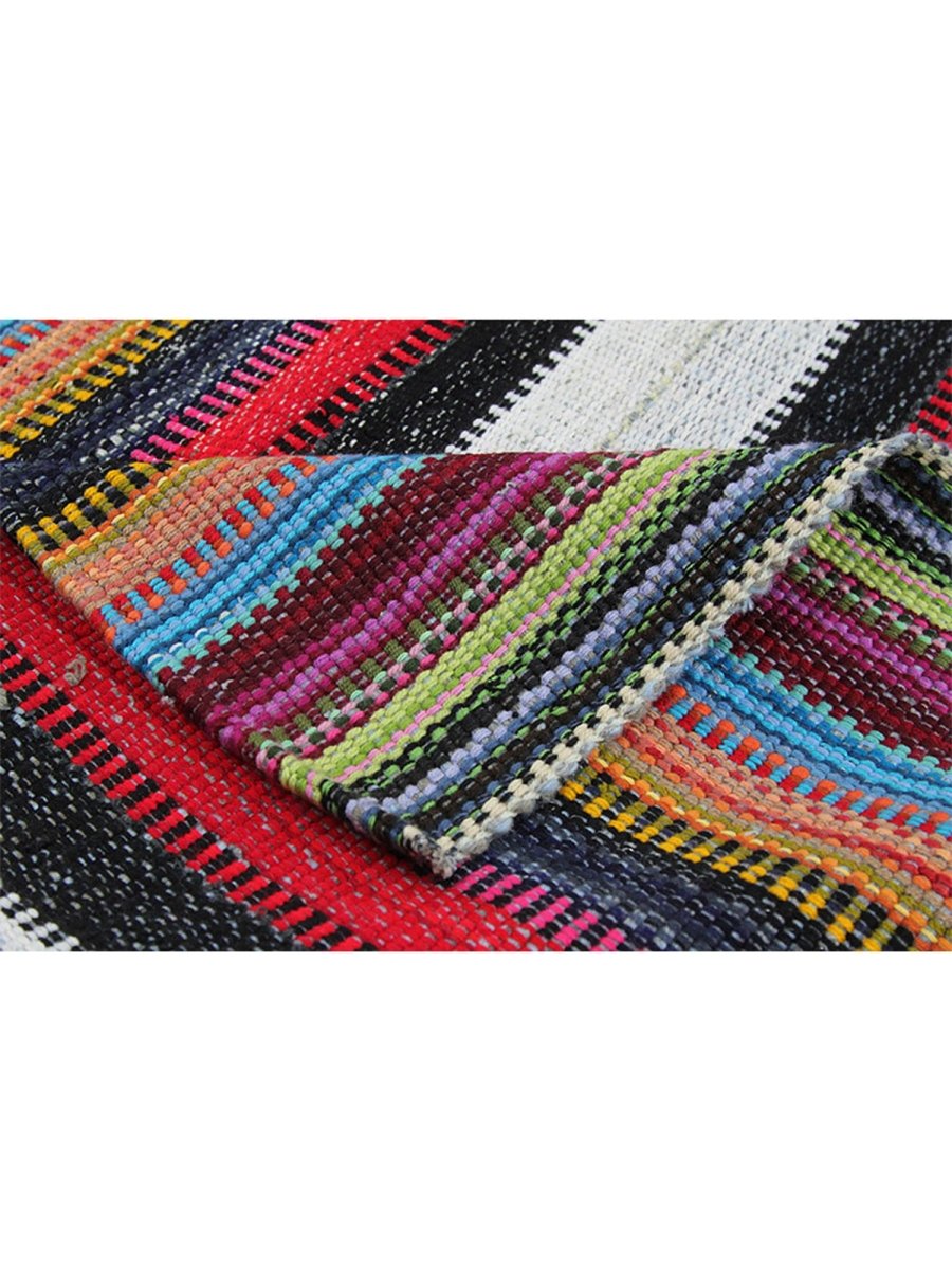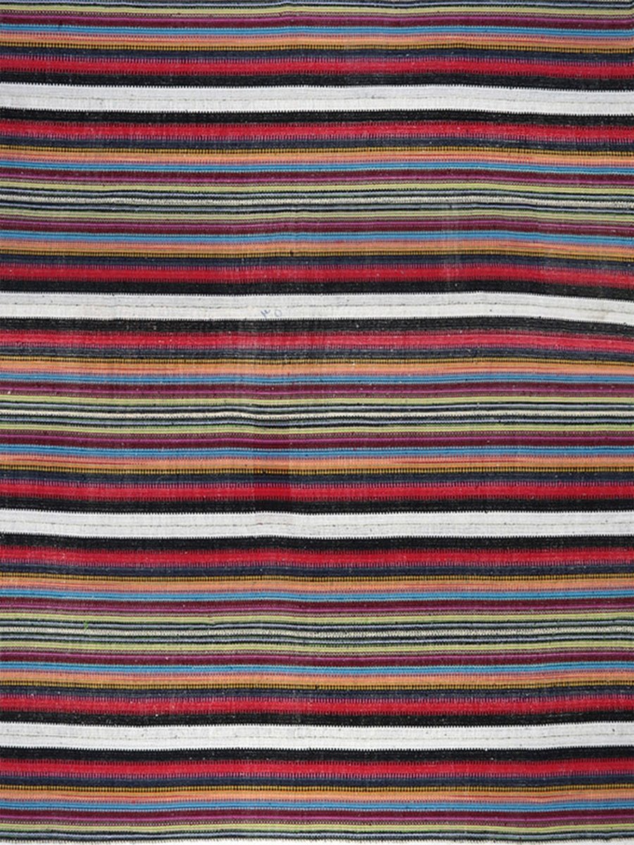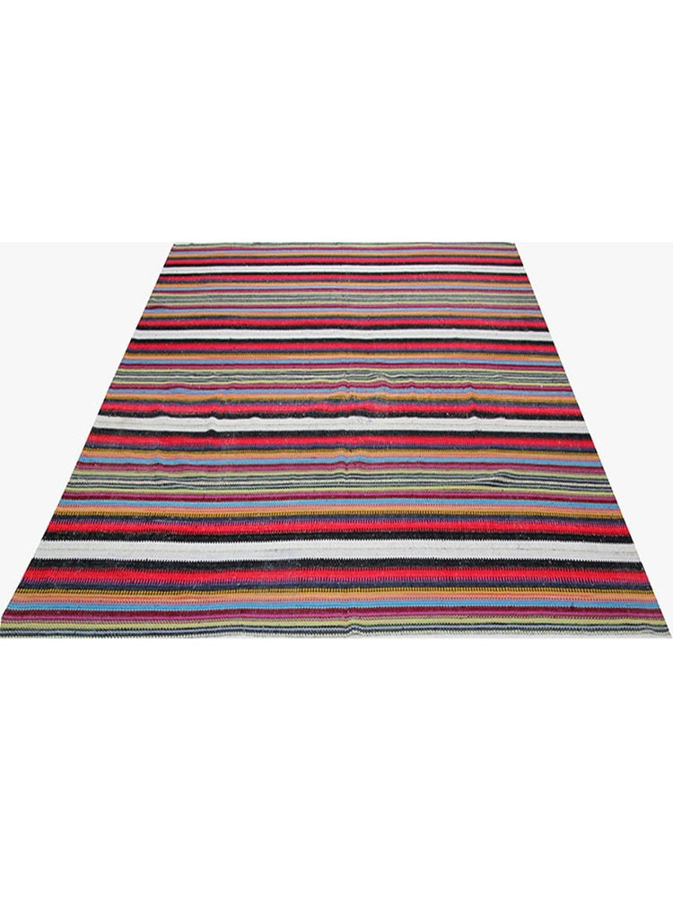 The 9x11 Persian Kilim Area Rug offers a vibrant and lively aesthetic with its rich color combination and intricate pattern. Handwoven in Persia using a durable cotton blend, this rug features bold stripes in shades of red, black, and white complemented by delicate bands of blue, purple, and green. The stripes vary in thickness, creating a rhythmic flow that adds movement and energy to the design. Fine woven details enrich the texture, enhancing its visual depth. Its rich palette and dynamic pattern make it a standout piece that brings warmth, personality, and cultural charm to your home.