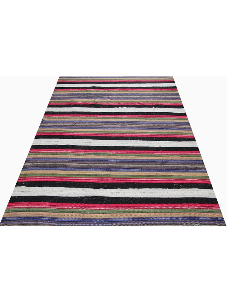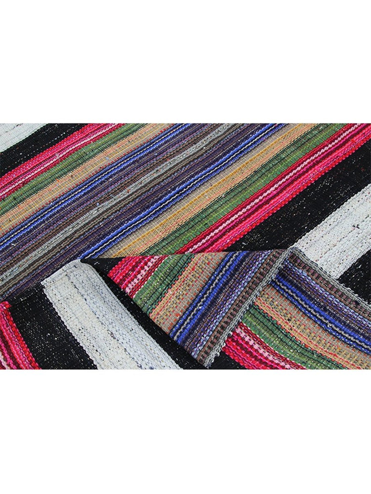 The 9x11 Persian Kilim Area Rug is a bold expression of Persian craftsmanship, featuring a distinctive striped pattern with contrasting colors and textures. Handwoven in Persia using a durable cotton blend, this flat-weave rug displays alternating bands of black and white, accented by bold red stripes that create a striking contrast. Additional thinner lines in earthy beige, muted green, and soft blue introduce complexity and visual depth. The intricate weaving adds texture to the rug, making it an engaging statement piece.