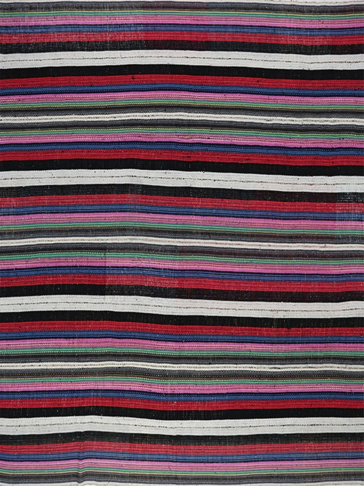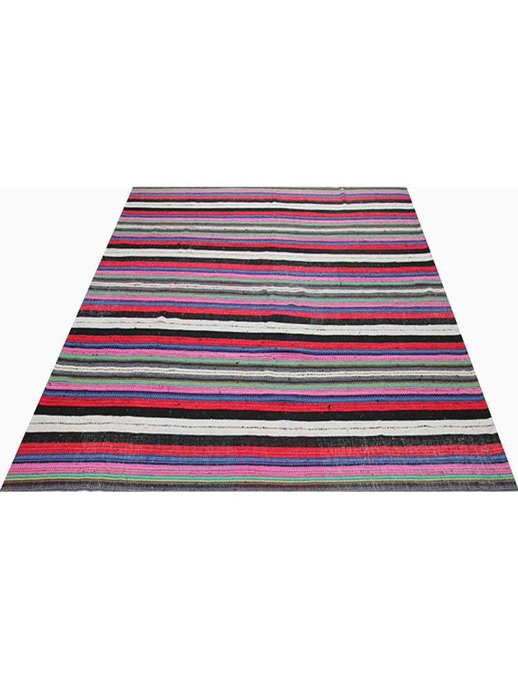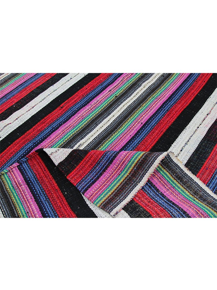 Add bold charm to your space with the 9x11 Persian Kilim Area Rug, handwoven in Persia with durable cotton blend material. This flat-weave rug features a vibrant striped design dominated by contrasting black and white bands, enriched by bold shades of red, purple, and green.