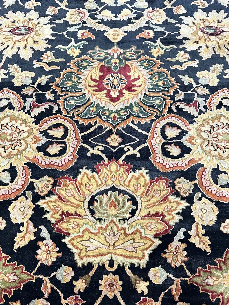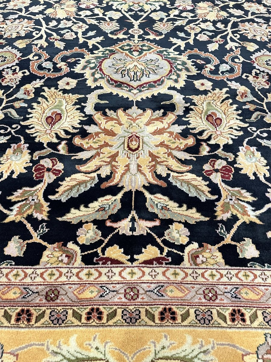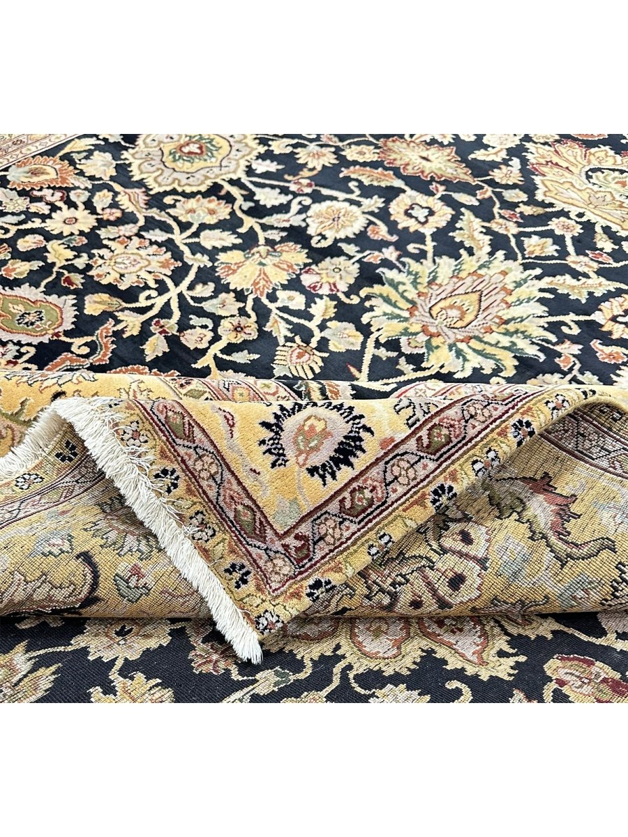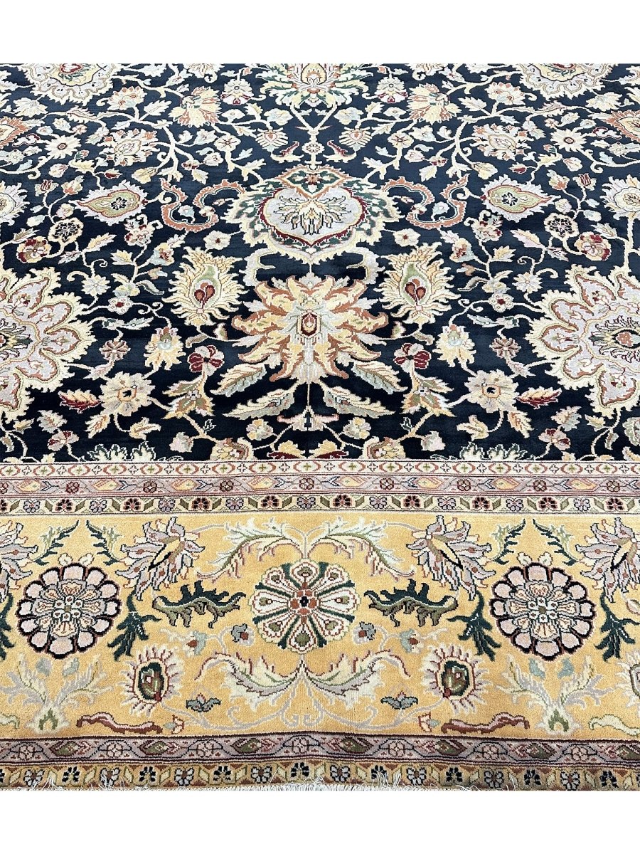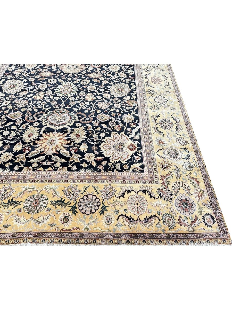 Introduce traditional elegance with this 9x12 Indian Agra area rug, handmade in India from wool. This beautiful rug features a captivating all-over design that covers the entire surface. The intricate pattern of repeating floral motifs, leaves, and vines creates a rich visual field. The field is striking with a deep black and navy blue hue, providing a dramatic backdrop. Contrasting light border in yellow-beige frames the rug beautifully. The tones in detail are light yellow-beige, warm gold, brown, subtle hints of muted red, and muted blue, adding visual complexity. This generously sized piece is perfect for anchoring a living or dining area. Crafted with traditional hand-making techniques, this wool rug offers lasting durability and a soft feel underfoot. This Indian Agra rug is enduring artistry. Enjoy free US shipping.