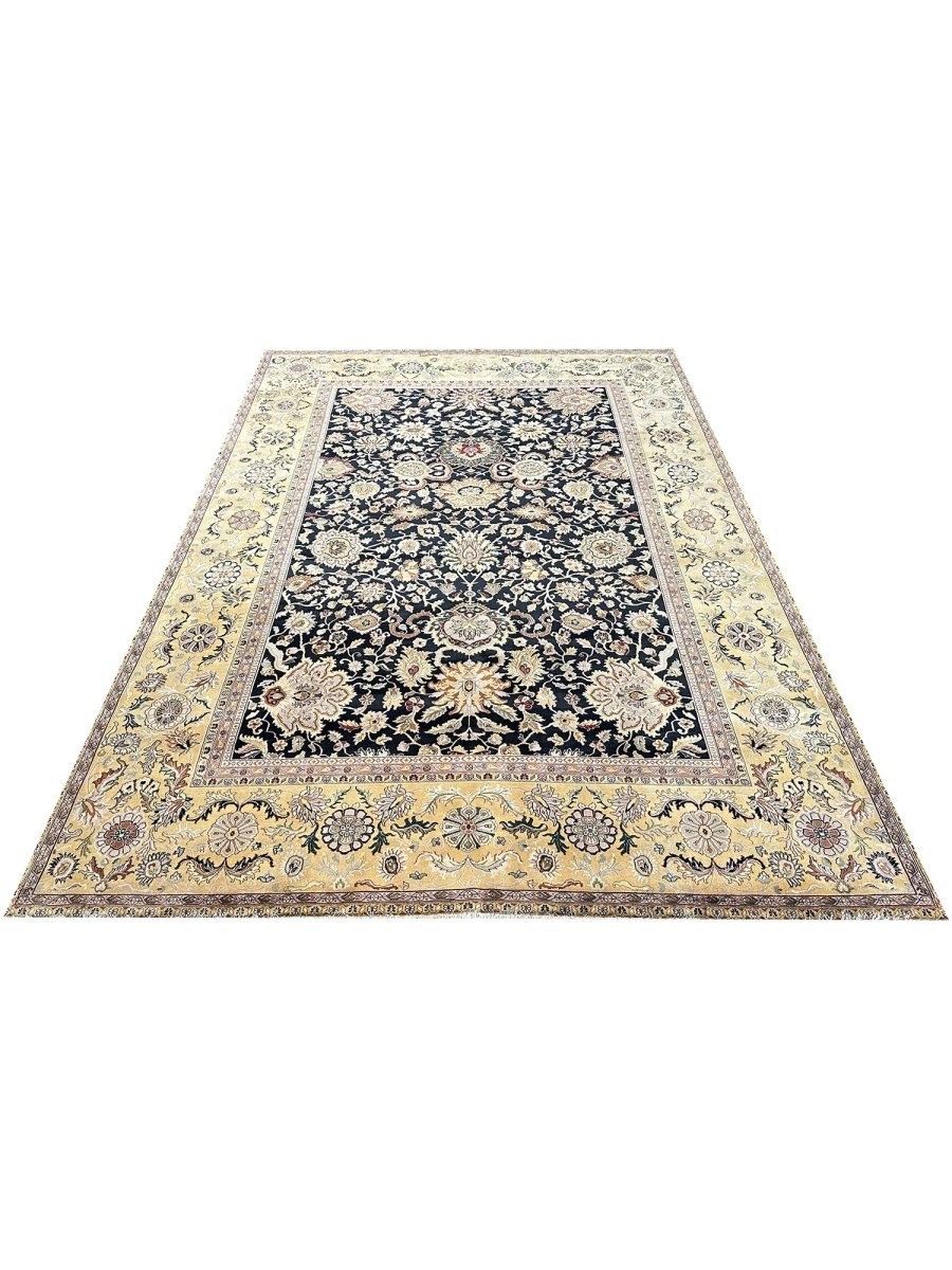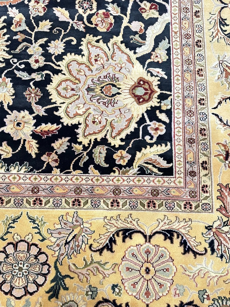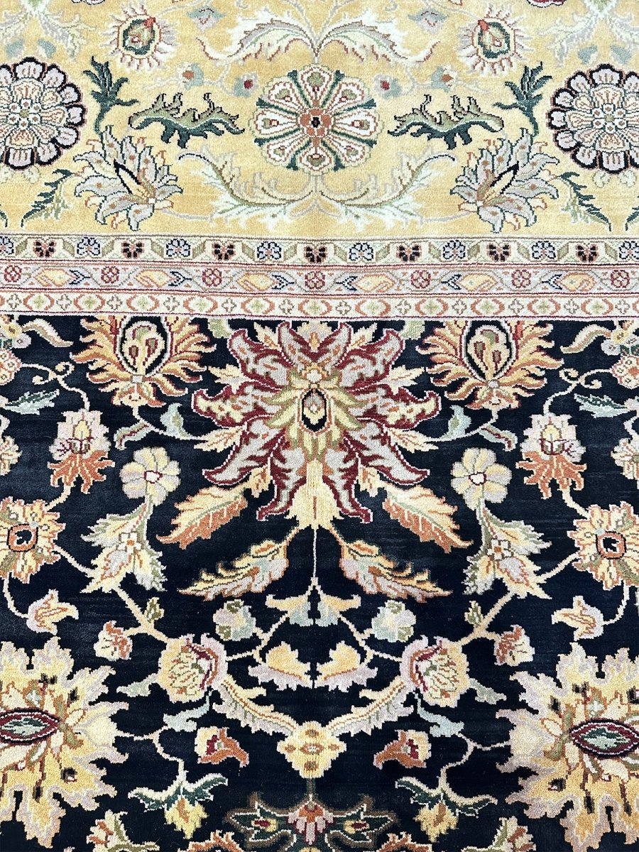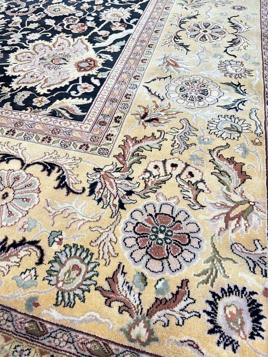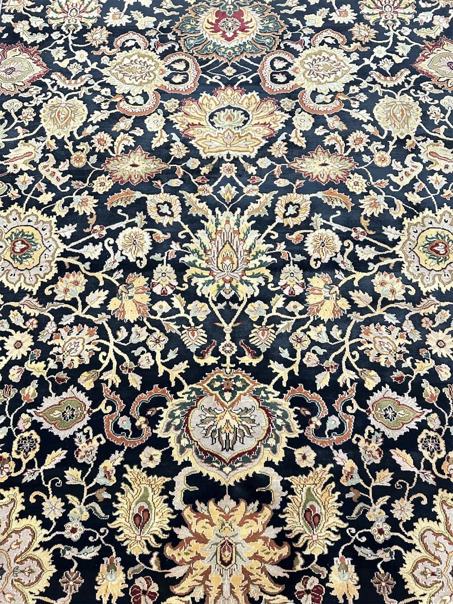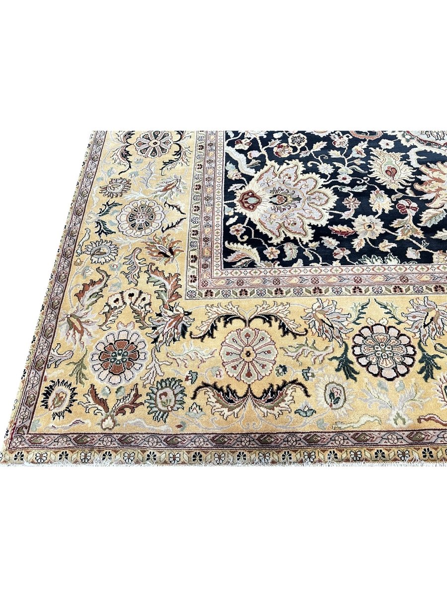 Introduce traditional elegance with this 9x12 Indian Agra area rug, handmade in India from wool. This beautiful rug features a captivating all-over design that covers the entire surface. The intricate pattern of repeating floral motifs, leaves, and vines creates a rich visual field. The field is striking with a deep black and navy blue hue, providing a dramatic backdrop. Contrasting light border in yellow-beige frames the rug beautifully. The tones in detail are light yellow-beige, warm gold, brown, subtle hints of muted red, and muted blue, adding visual complexity. This generously sized piece is perfect for anchoring a living or dining area. Crafted with traditional hand-making techniques, this wool rug offers lasting durability and a soft feel underfoot. This Indian Agra rug is enduring artistry. Enjoy free US shipping.