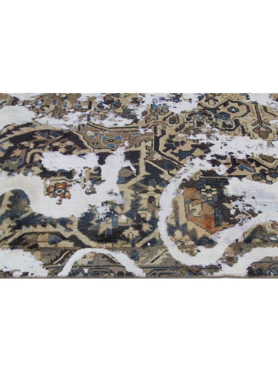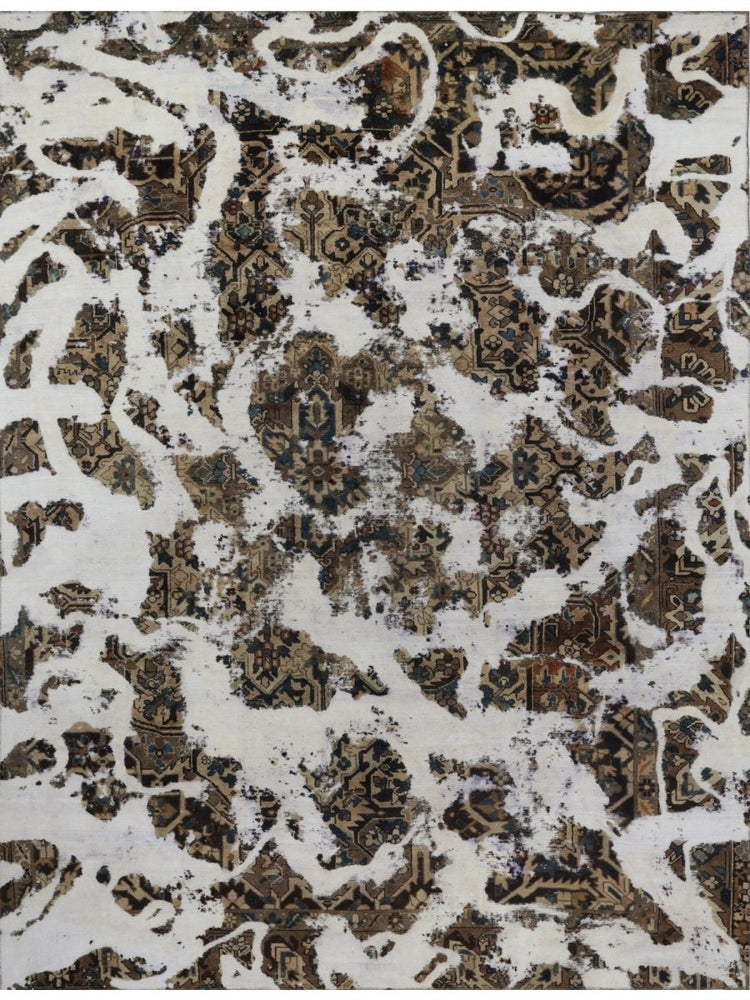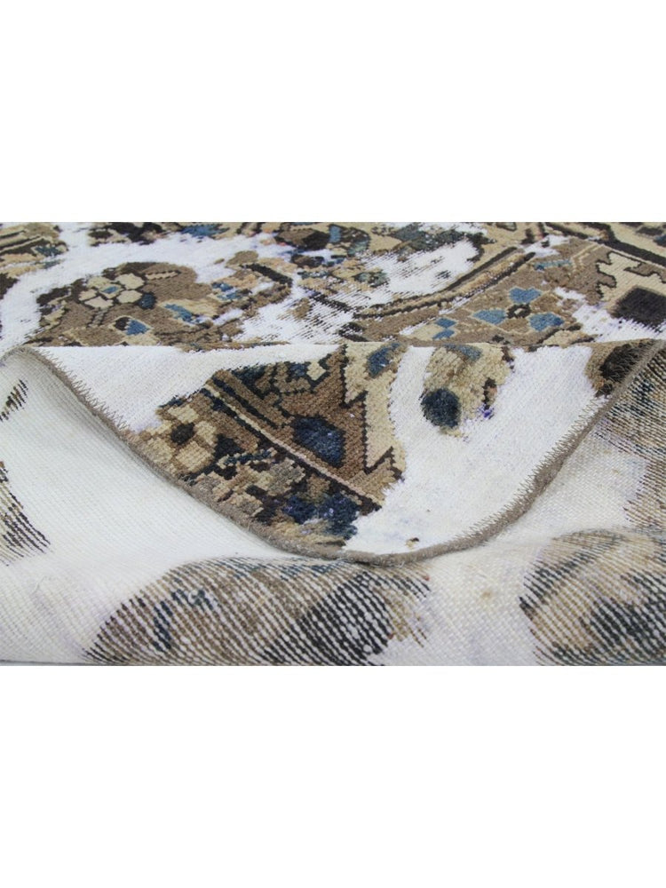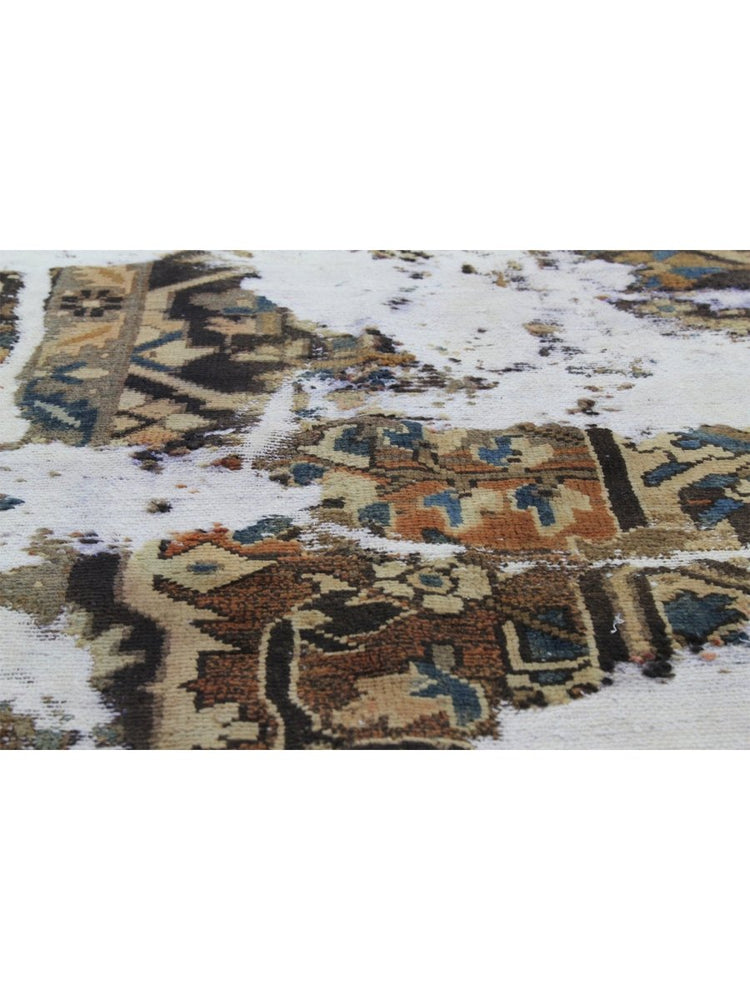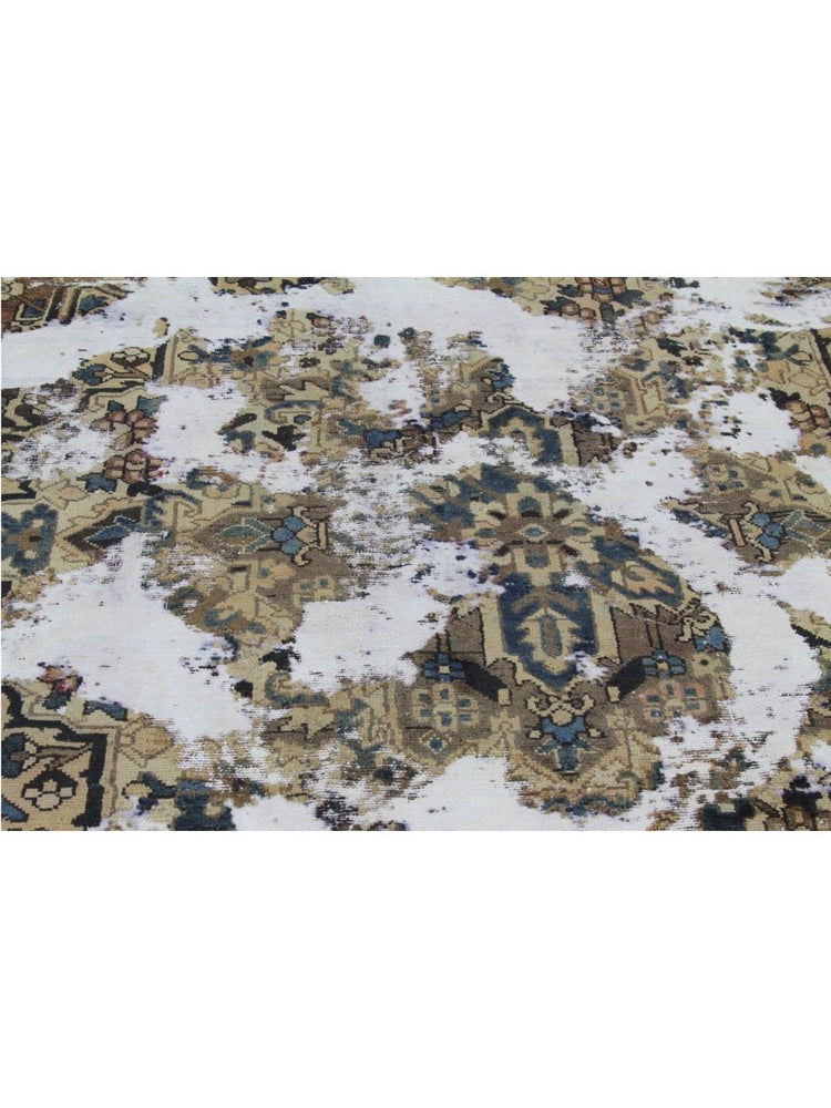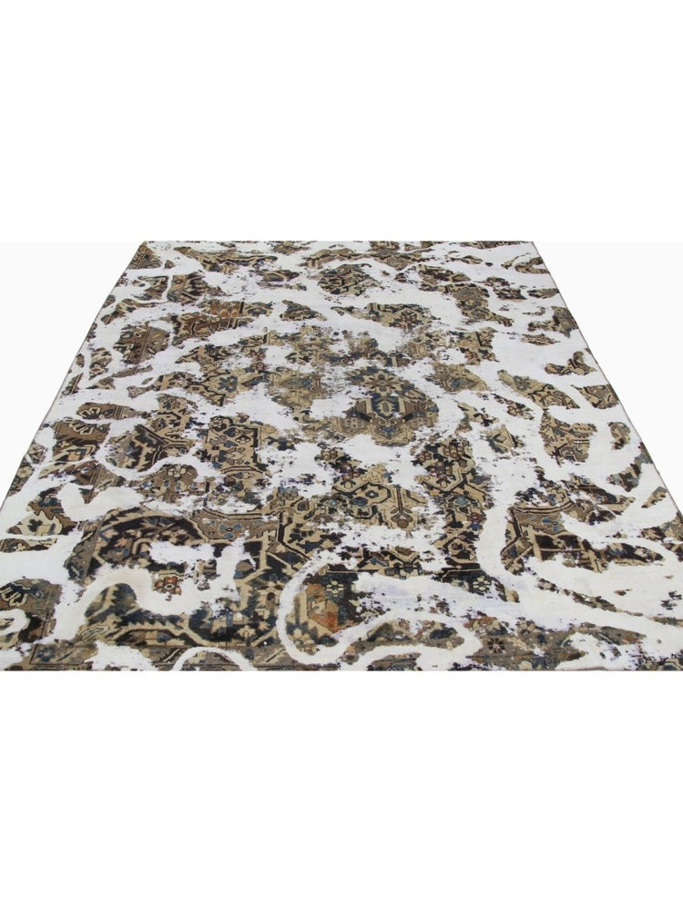 The 9x12 Vintage Persian Area Rug is a striking blend of classical patterns and trendy distressing. Hand-knotted from durable wool in Persia, this rug features a richly detailed geometric and floral pattern in earthy tones of brown and beige with distressed white overlays.