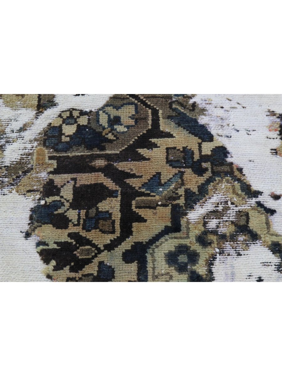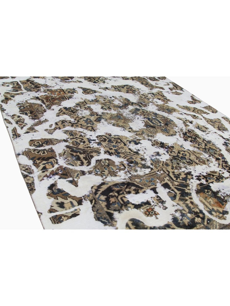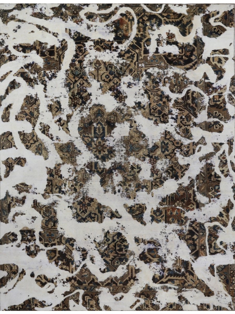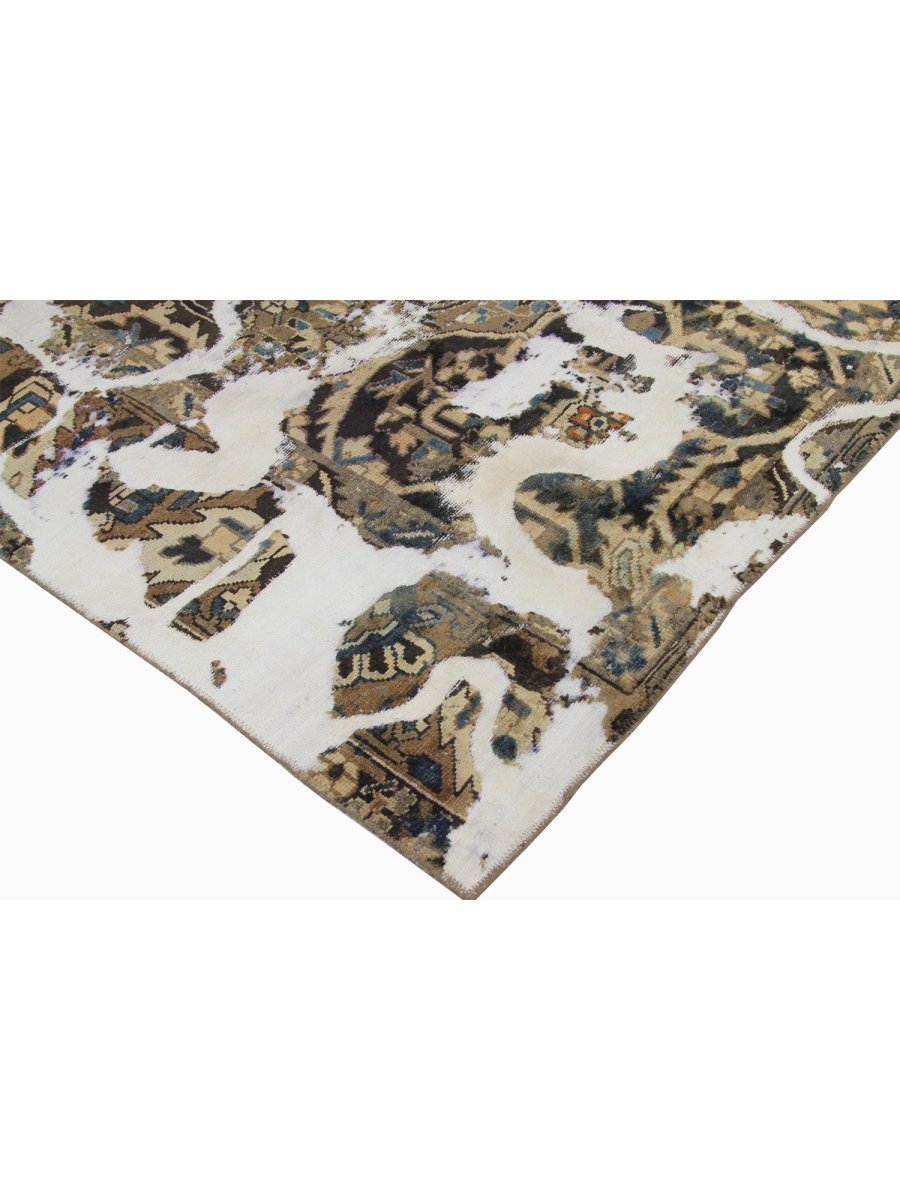 The 9x12 Vintage Persian Area Rug is a striking blend of classical patterns and trendy distressing. Hand-knotted from durable wool in Persia, this rug features a richly detailed geometric and floral pattern in earthy tones of brown and beige with distressed white overlays.