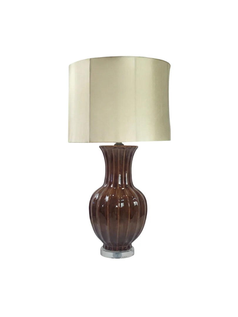 Introduce a warm, refined accent to your interior with this brown ceramic table lamp set on a clear acrylic base and finished with a classic linen shade. The sculptural ceramic body features a softly ribbed silhouette and a rich brown glazed finish with subtle tonal depth, lending the piece an understated elegance. The transparent acrylic base adds a modern touch while visually lightening the form, and the neutral linen shade provides a soft, ambient glow, making this lamp a versatile addition to both traditional and contemporary settings.