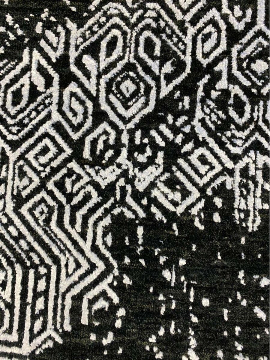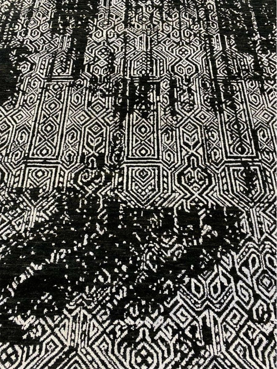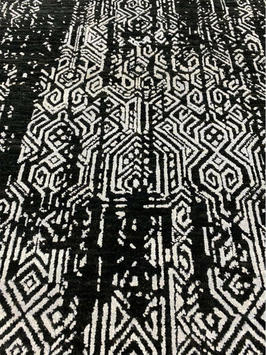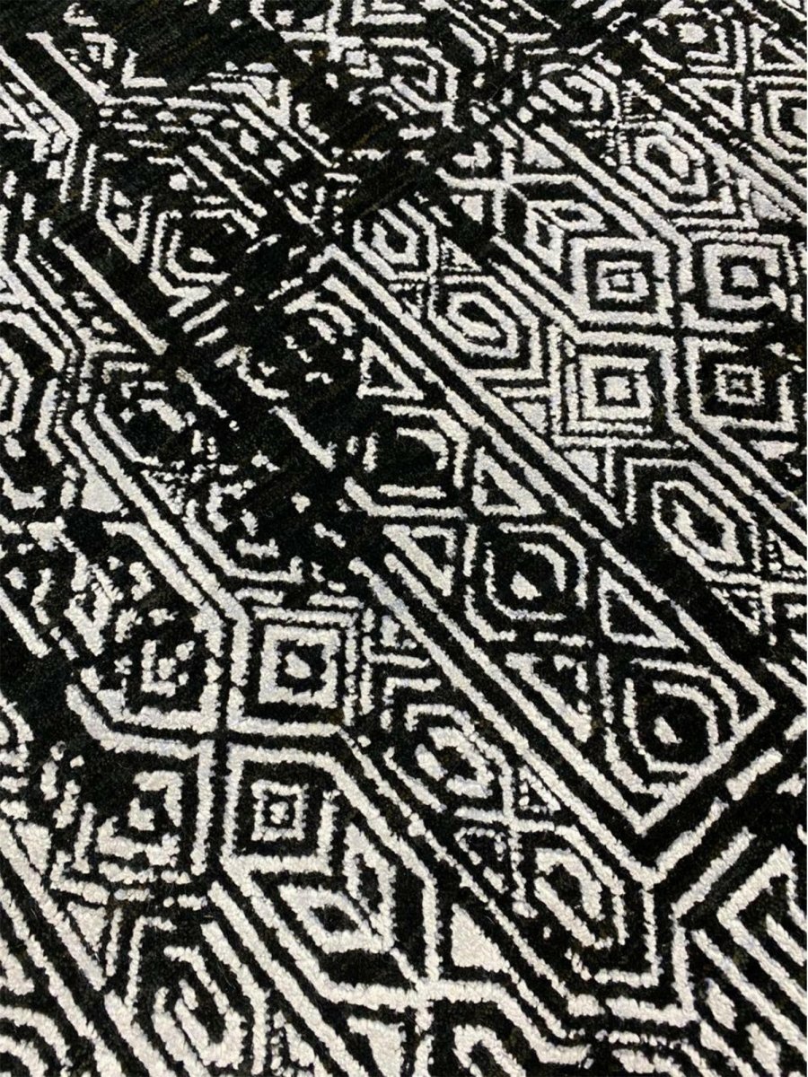 Enrich your home with this striking 6x6 new round modern abstract area rug, designed to bring bold elegance and visual impact. Hand-knotted in India from a premium blend of wool and bamboo silk, it offers a plush, luxurious feel paired with exceptional durability. The deep black and white tones and sleek abstract design create a dramatic yet refined aesthetic, making it a captivating focal element within a variety of interiors.