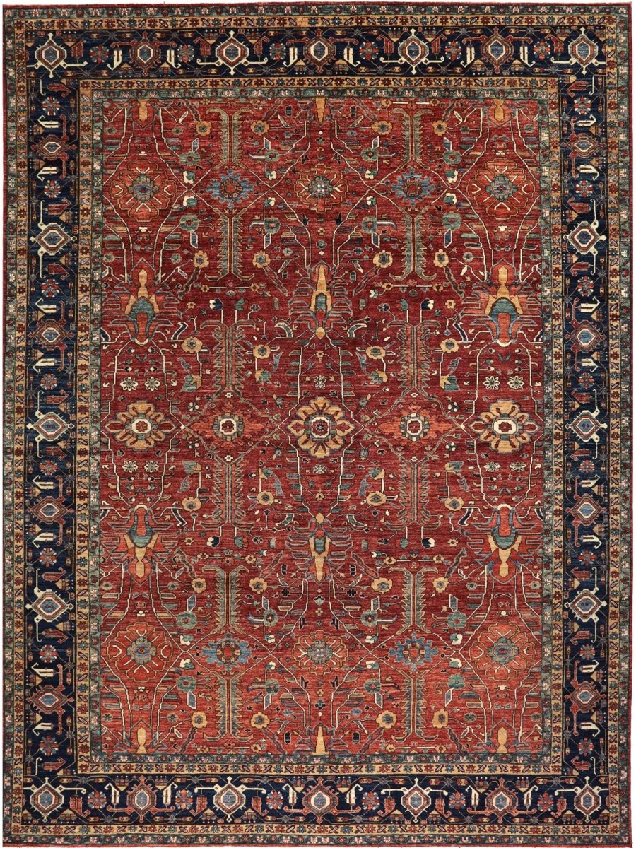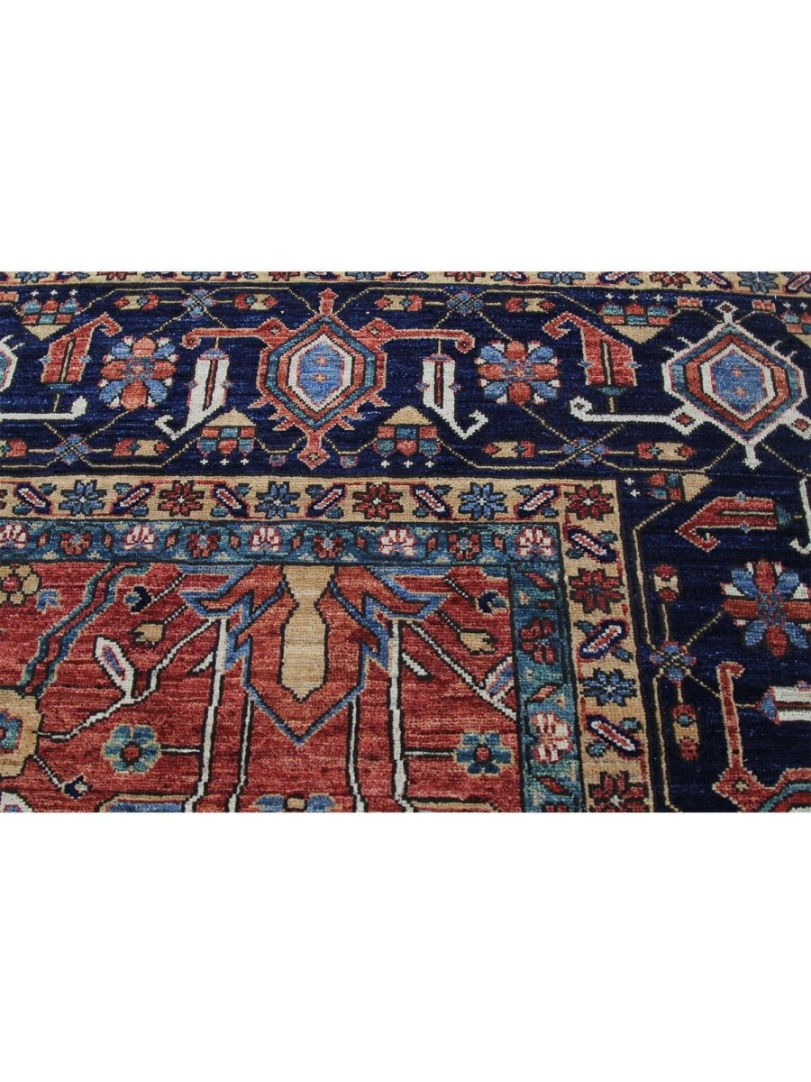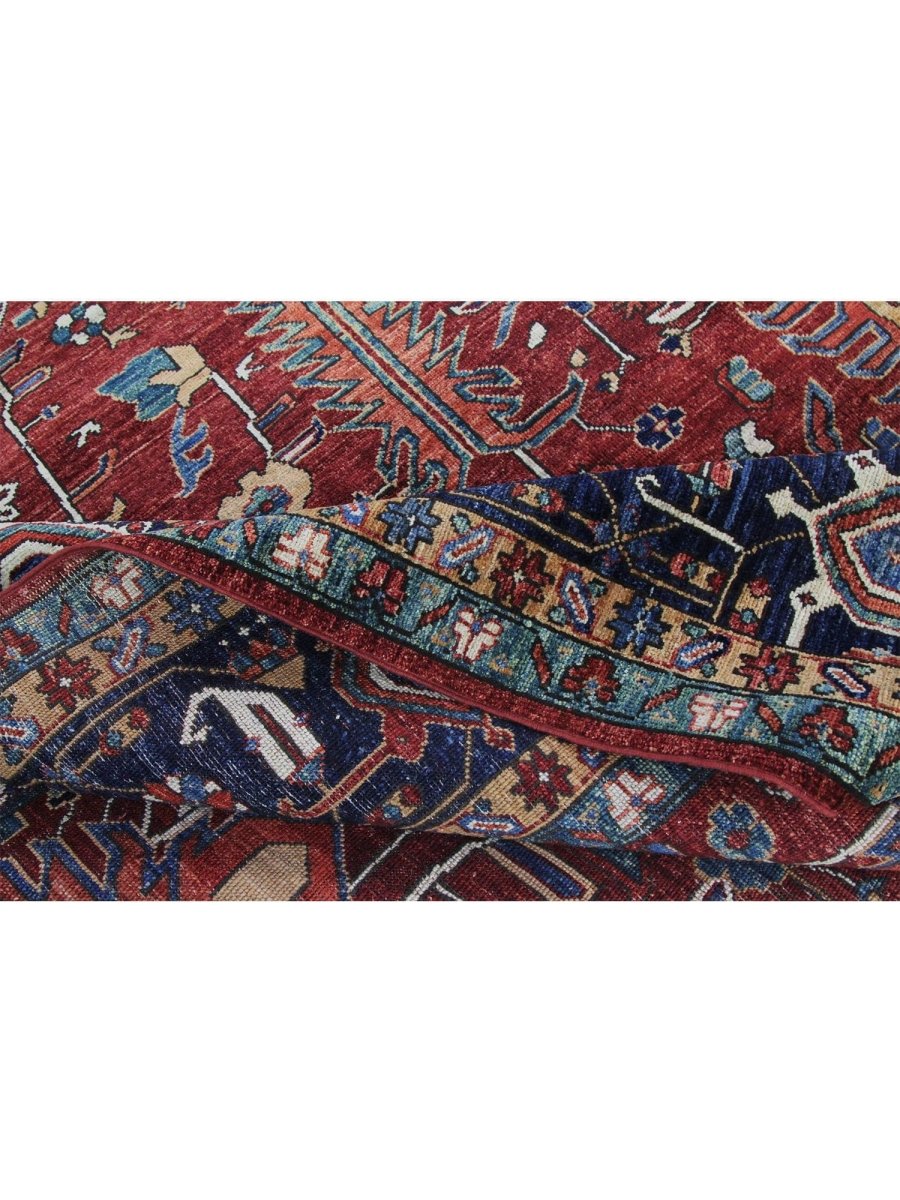 Add a touch of classic elegance to your home with this 10x14 Heriz Style Area Rug, crafted in Pakistan. This rug features a captivating geometric pattern, showcasing traditional motifs in a rich red, deep blue, ivory, and gold palette. Crafted from durable wool ensures longevity, perfect for spacious living rooms, dining areas, or bedrooms. The intricate border detail reflects skilled craftsmanship and enduring design. This piece effortlessly complements, adding warmth, texture, and sophistication. A true blend of artistry and function, it easily brings heritage charm into any space. Enjoy the benefit of free shipping across the United States. Each rug is one-of-a-kind, with subtle variations inherent to its creation.