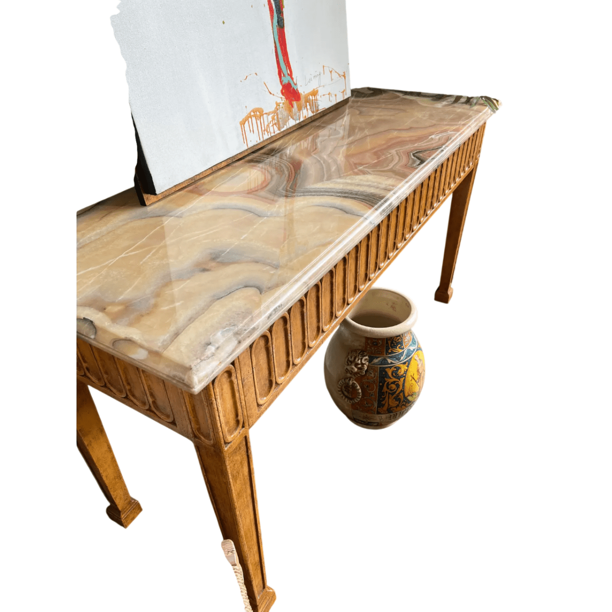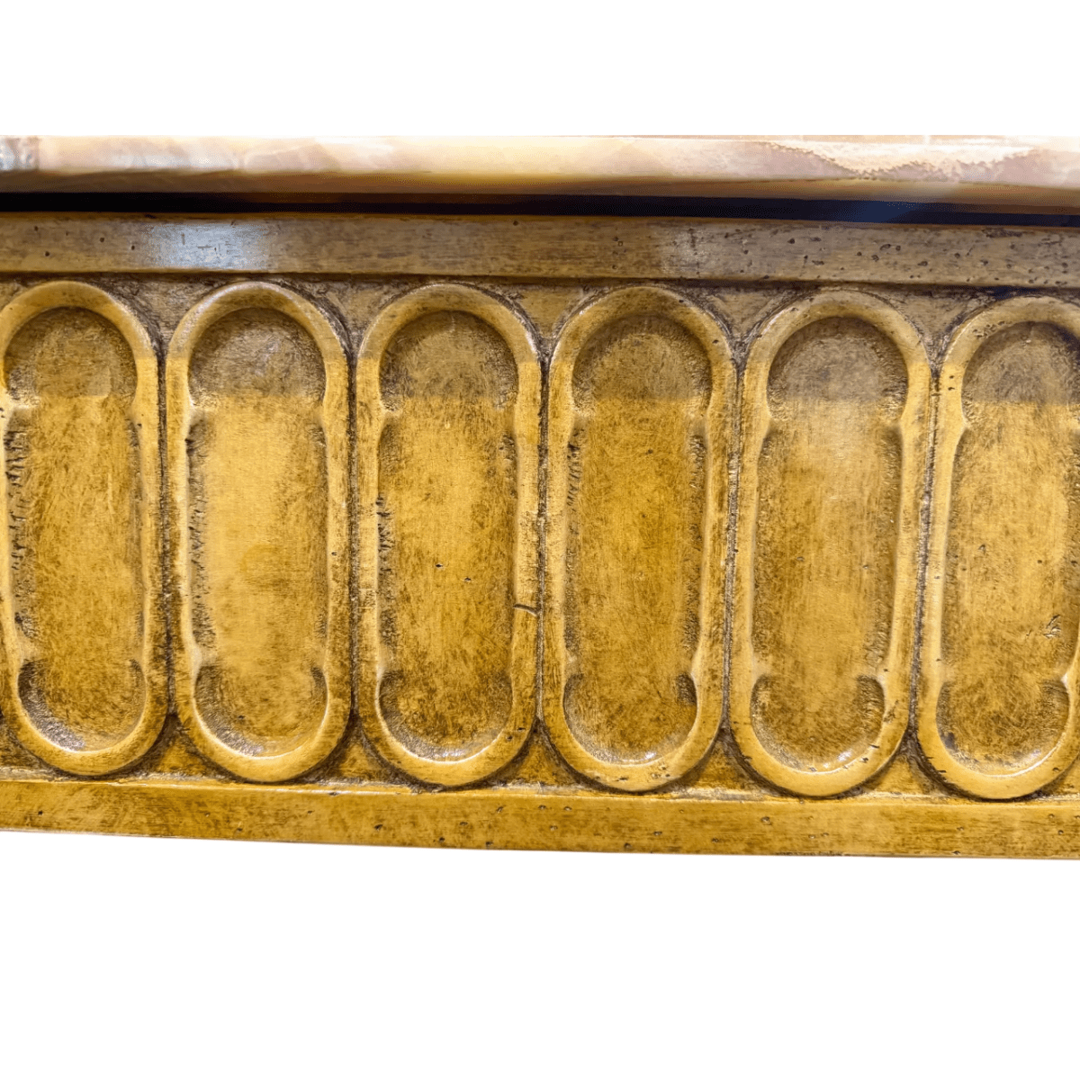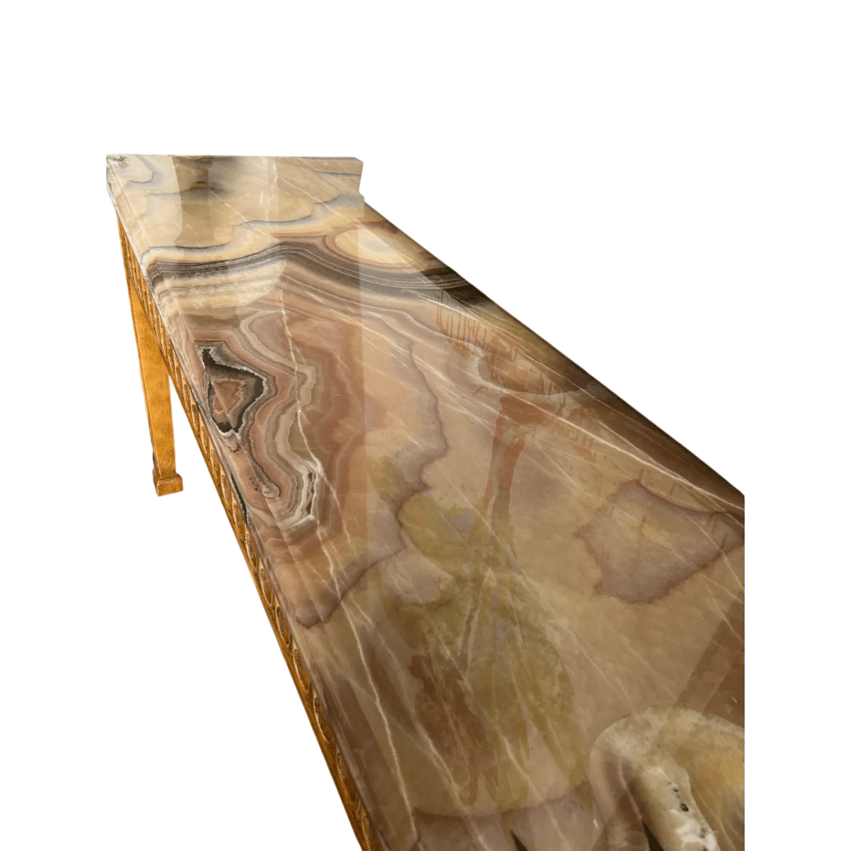 The top is fitted with a luxurious onyx stone surface with a beveled edge. The natural variations within the onyx create depth and visual richness, providing an elegant contrast to the painted base. The combination of carved detailing, stone top, and refined finish highlights the quality craftsmanship and classic European aesthetic of the piece.