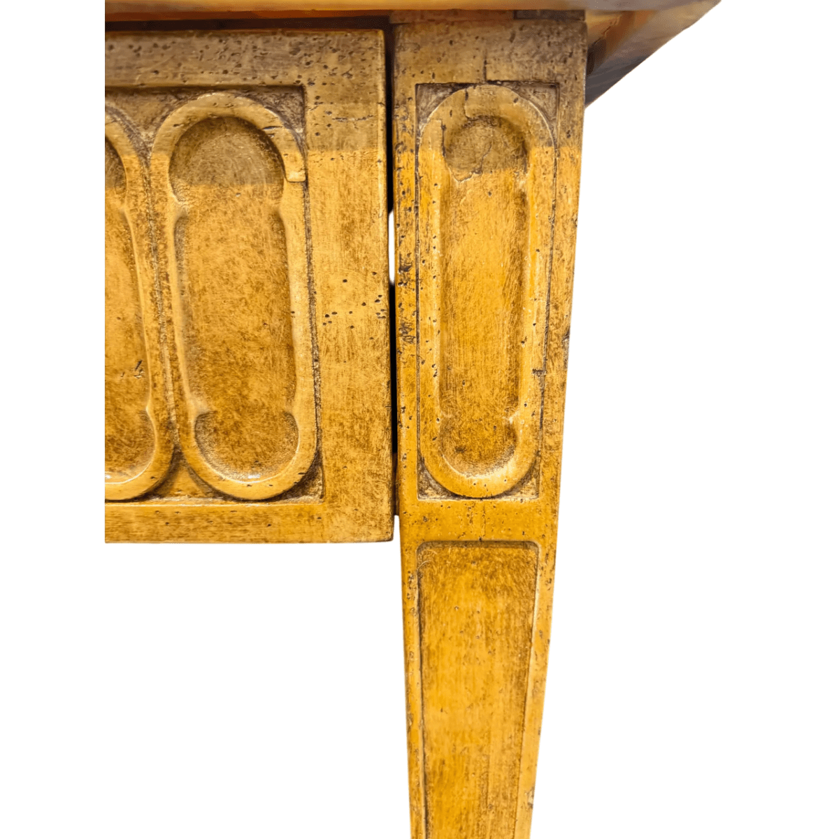 The console is finished in a warm hand-painted tan tone that enhances its decorative surface while maintaining a sophisticated and timeless appearance. Its clean rectangular form is complemented by a discreet hidden drawer, offering functional storage while preserving the table’s streamlined silhouette.