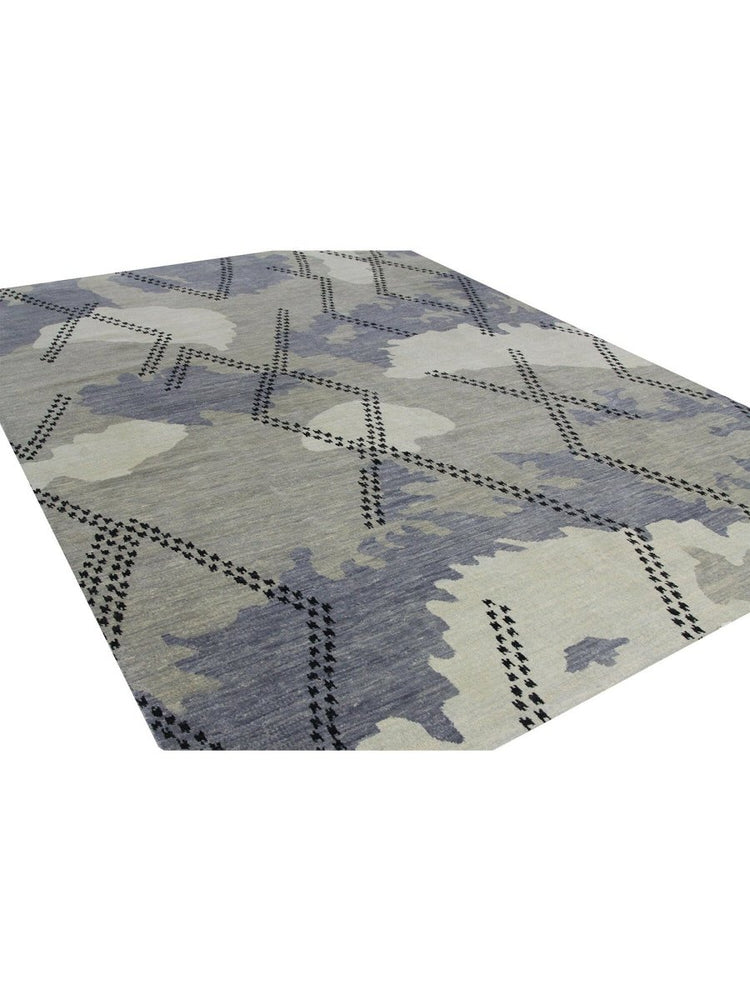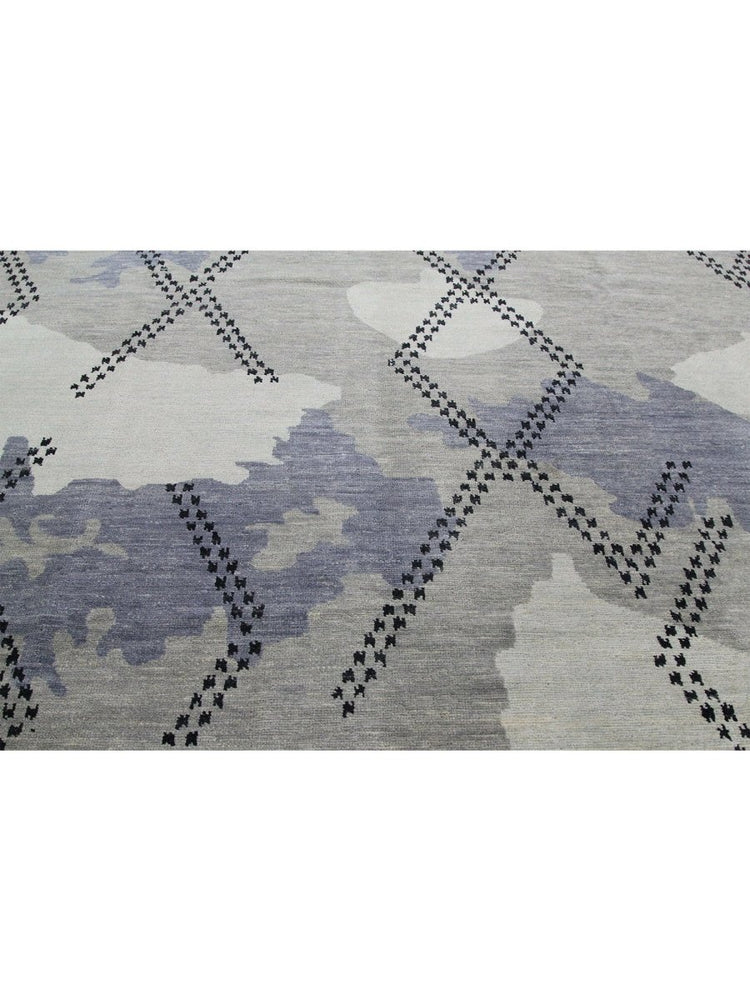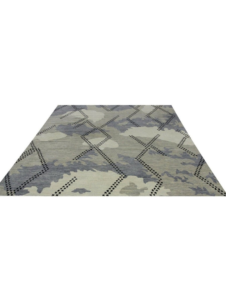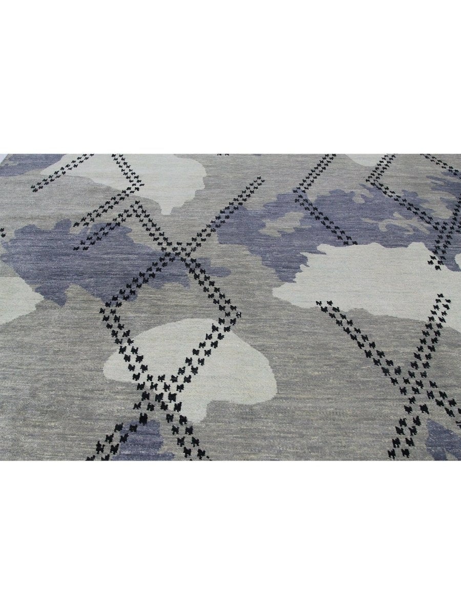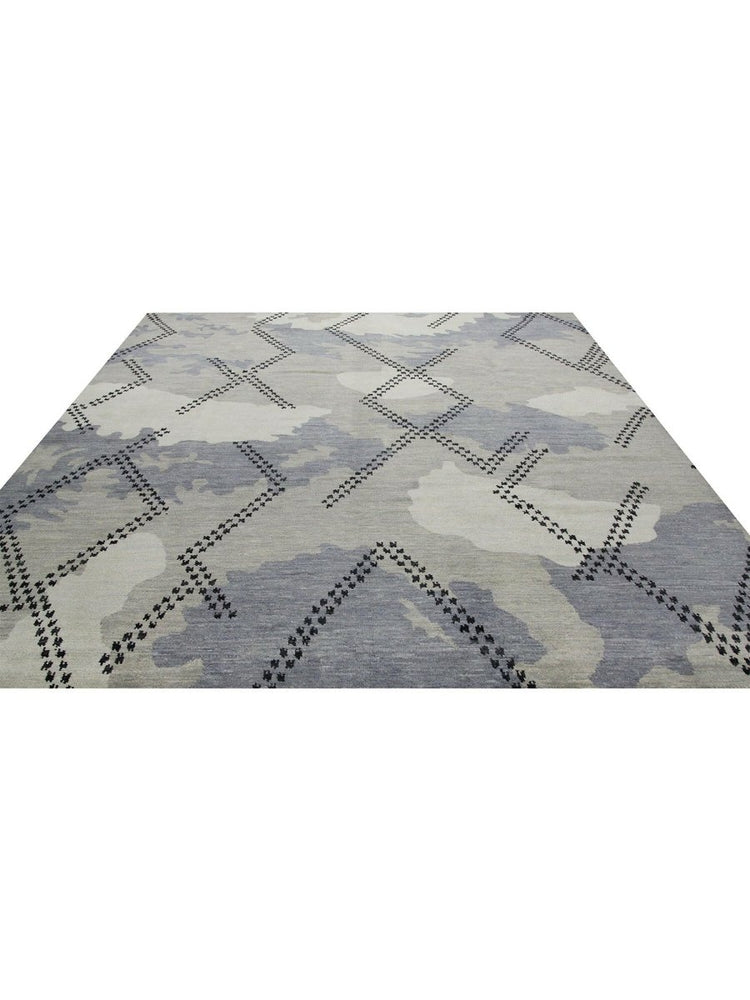 Immerse your space in the sophisticated design of this magnificent 9x12 Modern Abstract Area Rug. Meticulously hand-knotted by skilled artisans in India from a luxurious blend of premium wool, this new rug offers a soft underfoot feel and exceptional durability. The captivating abstract pattern is uniquely overlaid with a distinct geometric grid of dotted lines, all rendered in a compelling palette of deep blue, shades of gray, and warm beige, with striking black accents for the geometric elements. This artistic combination creates a visually dynamic and modern statement that effortlessly enhances any room.