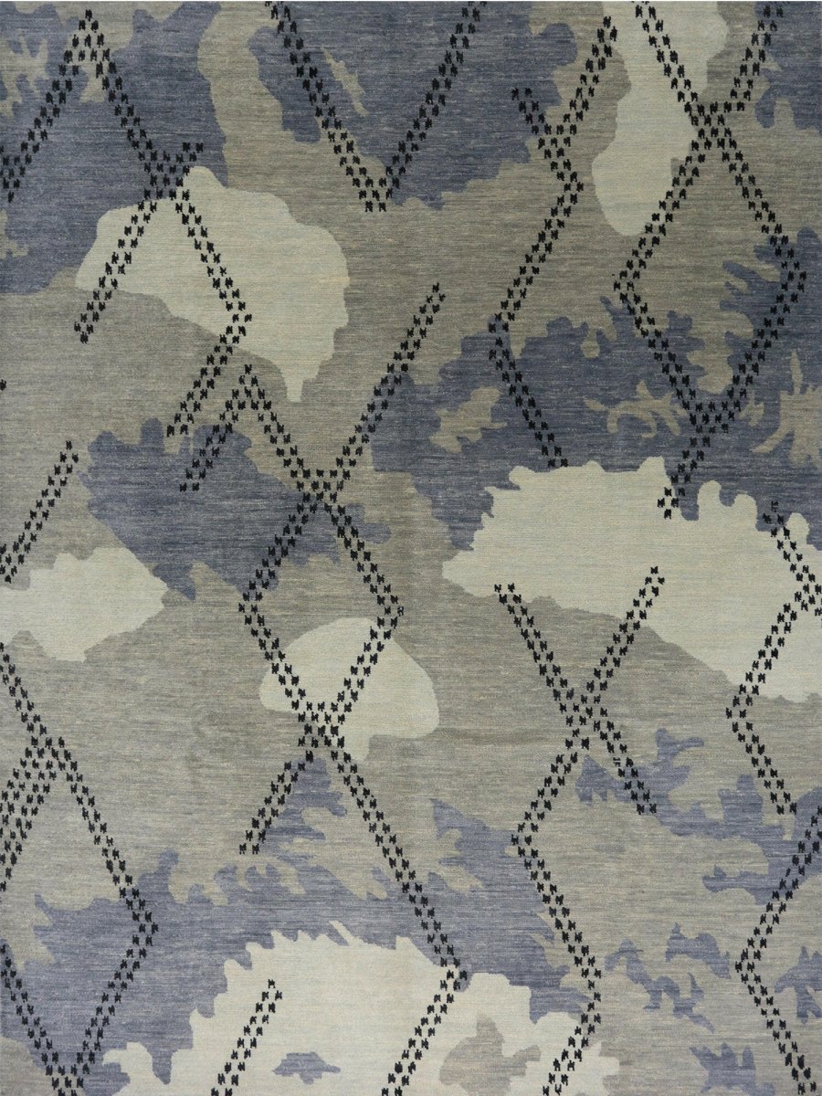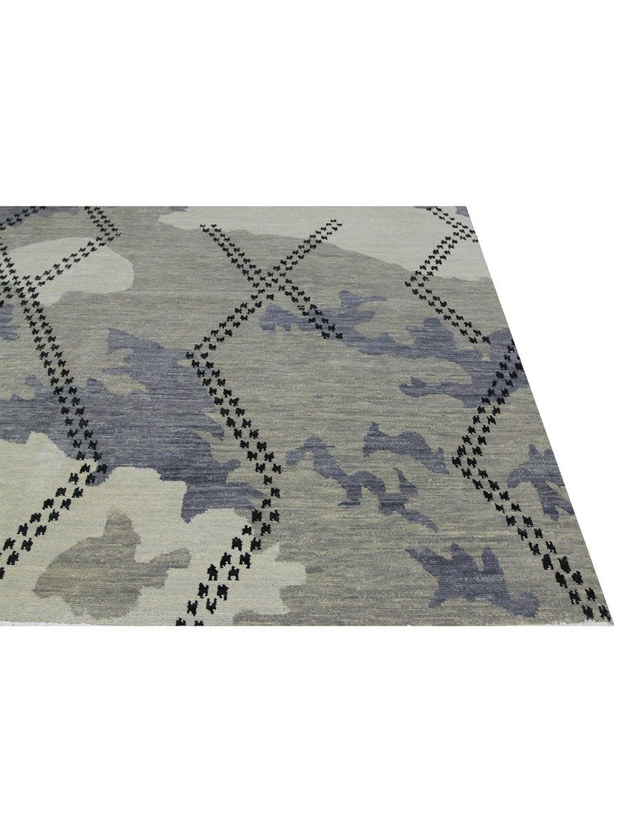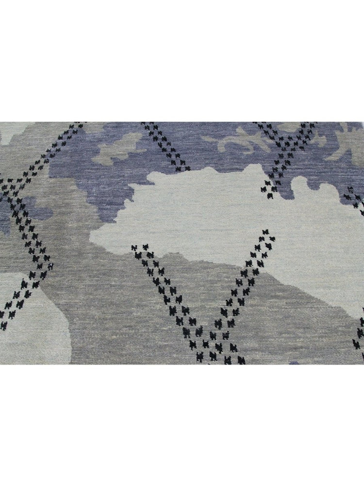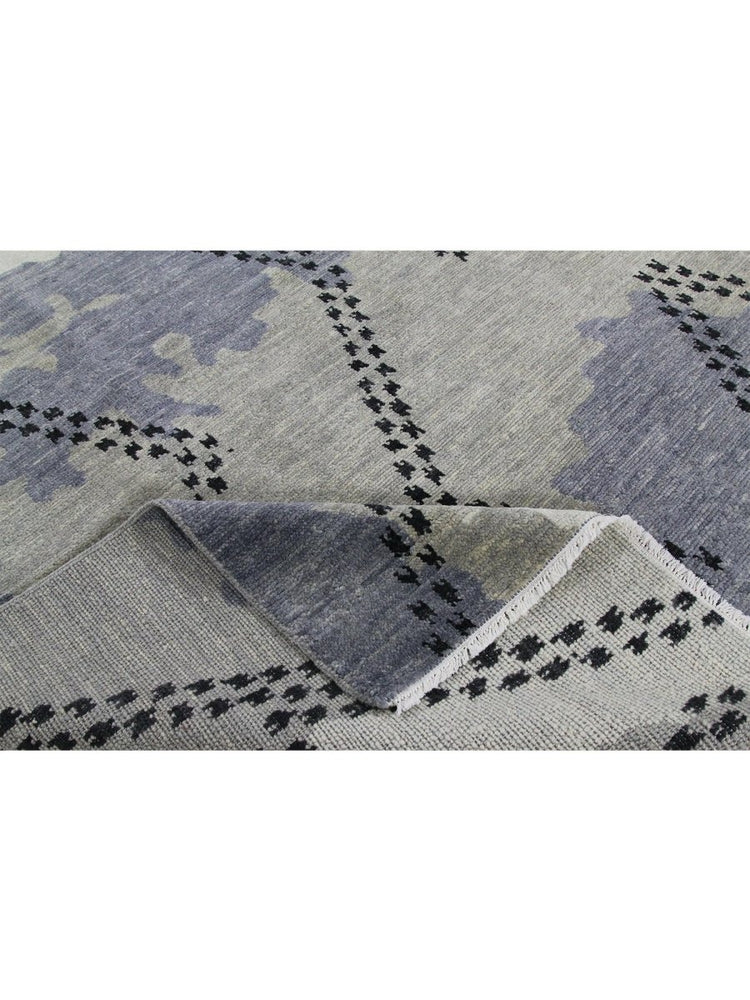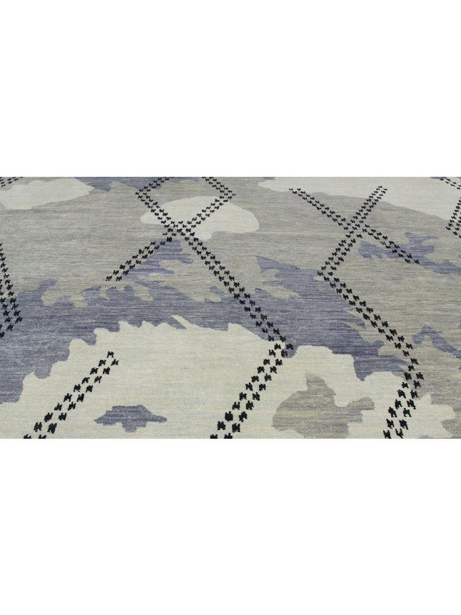 Immerse your space in the sophisticated design of this magnificent 9x12 Modern Abstract Area Rug. Meticulously hand-knotted by skilled artisans in India from a luxurious blend of premium wool, this new rug offers a soft underfoot feel and exceptional durability. The captivating abstract pattern is uniquely overlaid with a distinct geometric grid of dotted lines, all rendered in a compelling palette of deep blue, shades of gray, and warm beige, with striking black accents for the geometric elements. This artistic combination creates a visually dynamic and modern statement that effortlessly enhances any room.