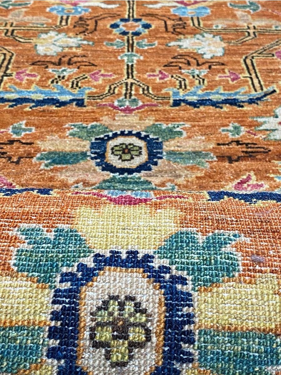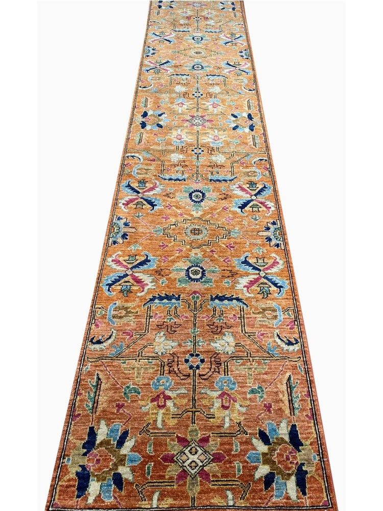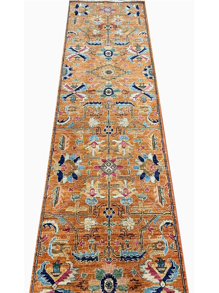 The 3x12 Heriz Style Runner Rug is a unique treasure that embodies the rich history of Pakistani weaving and will transform your living area. Made from high-quality wool, this gorgeous traditional rug features a geometric design that blends in perfectly with any type of interior design. It provides a friendly atmosphere and is perfect for narrow spaces such as hallways or entryways or as a chic addition in your workplace. It is a multipurpose addition to your house because of the striking blend of rust, blue, pink, and ivory hues that offer depth and character. This amazing carpeting is a stunning work of art that elevates your living area and goes beyond simple decoration. Take advantage of free US delivery.