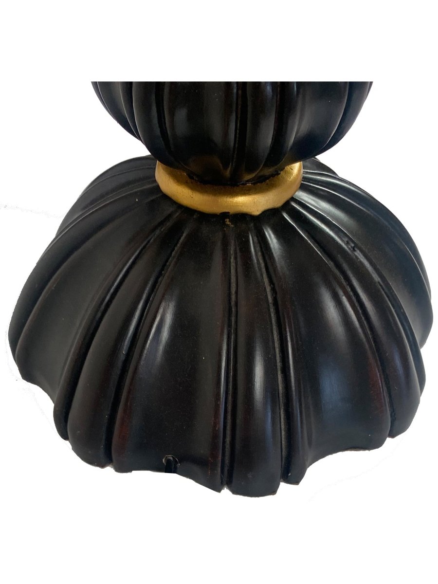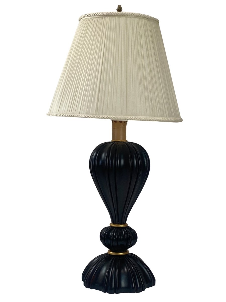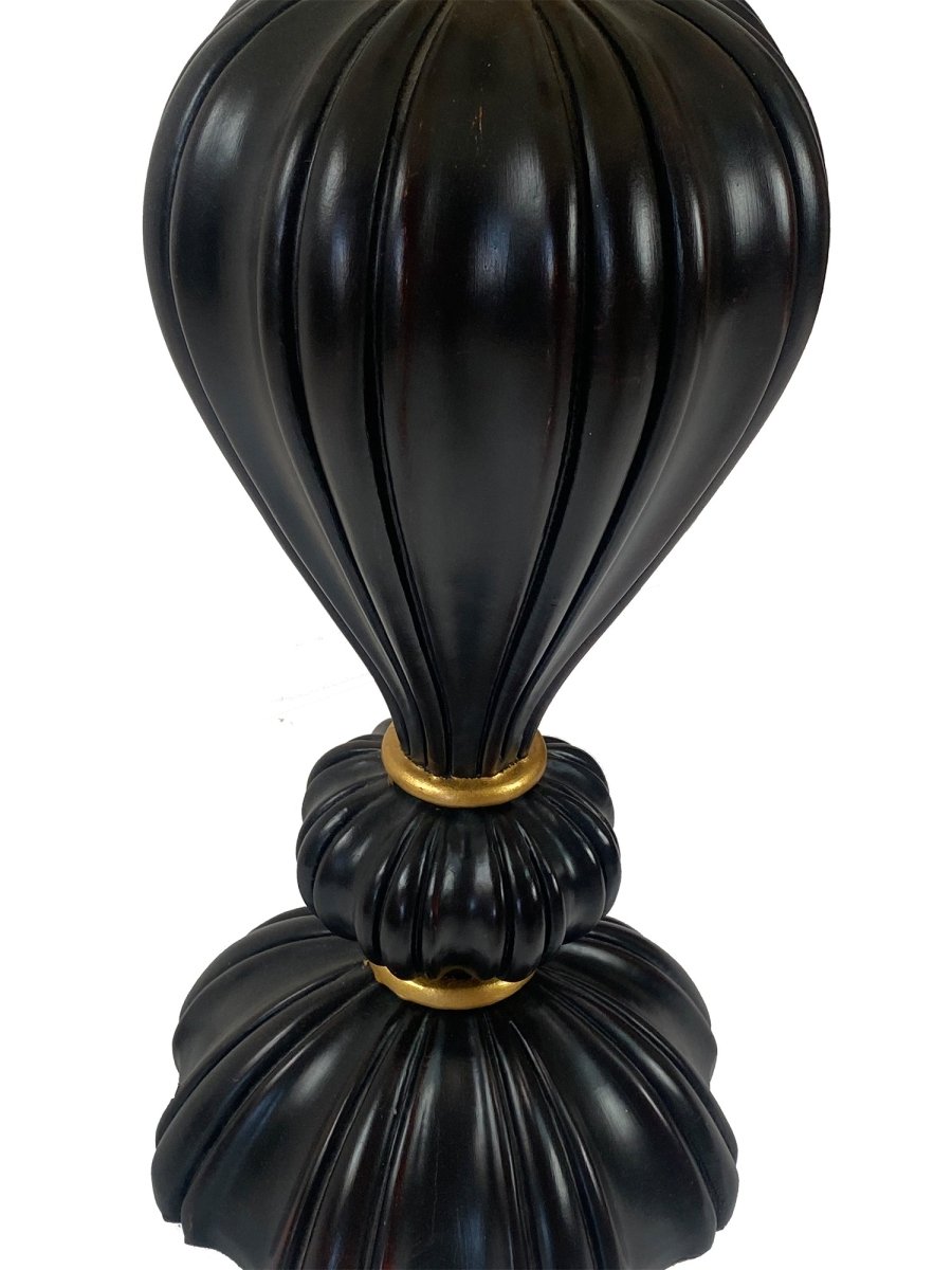 This Italian hand-carved table lamp features a Florentine-inspired design with a ribbed base composed of three stacked fluted elements: a teardrop-shaped upper section, a spherical mid-section, and a flared scalloped foot. The base is finished in matte black with slender gold rings between each section, providing subtle contrast and visual interest.