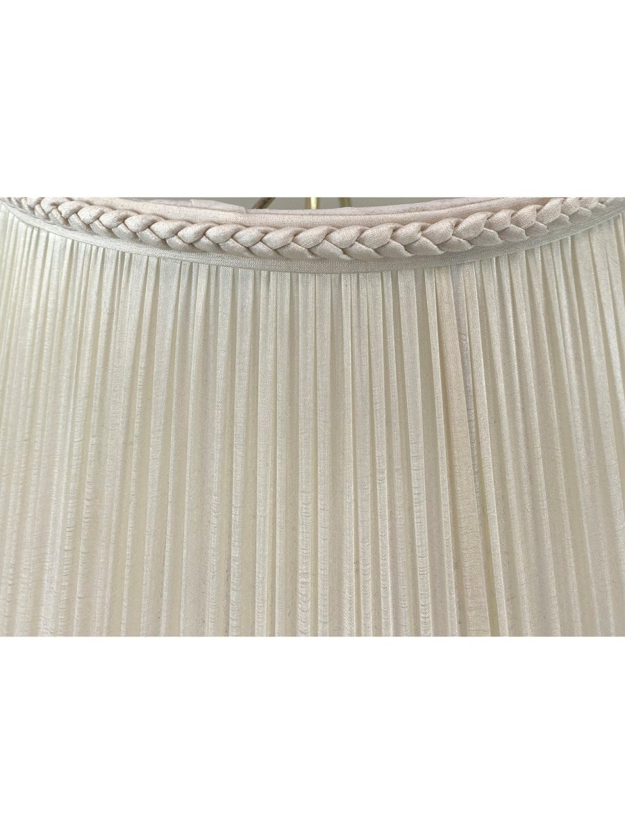 A brass-toned neck supports a finely pleated ivory lampshade with braided trim and a small finial. Crafted with attention to detail, this lamp combines decorative artistry with functional lighting.