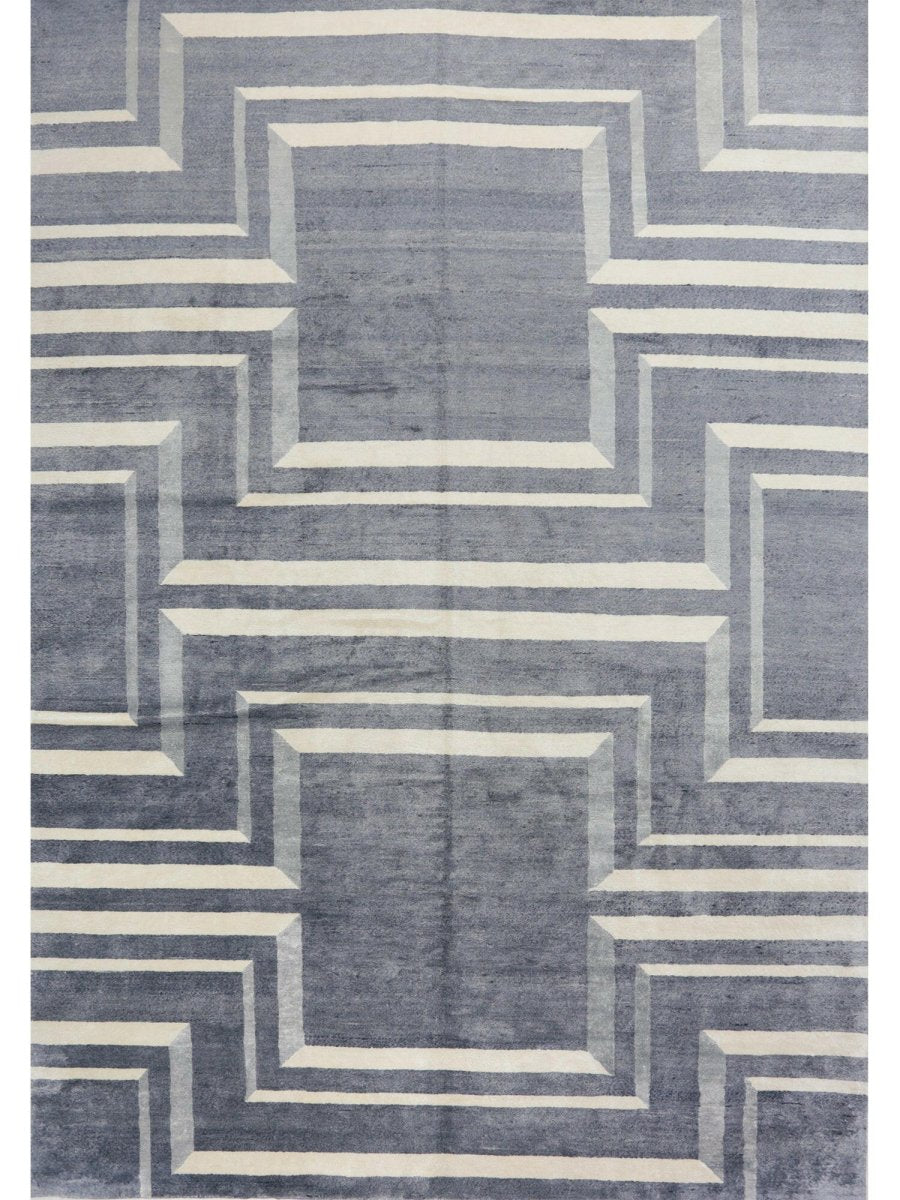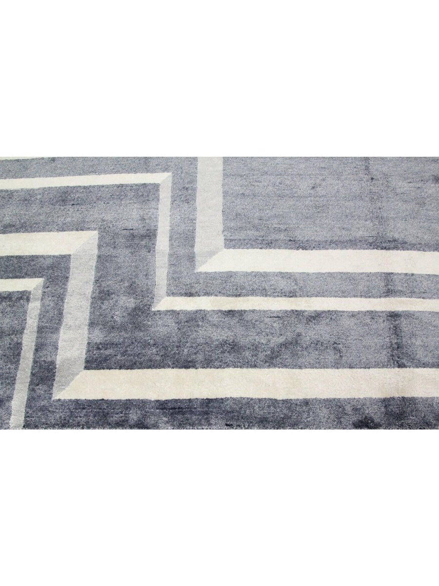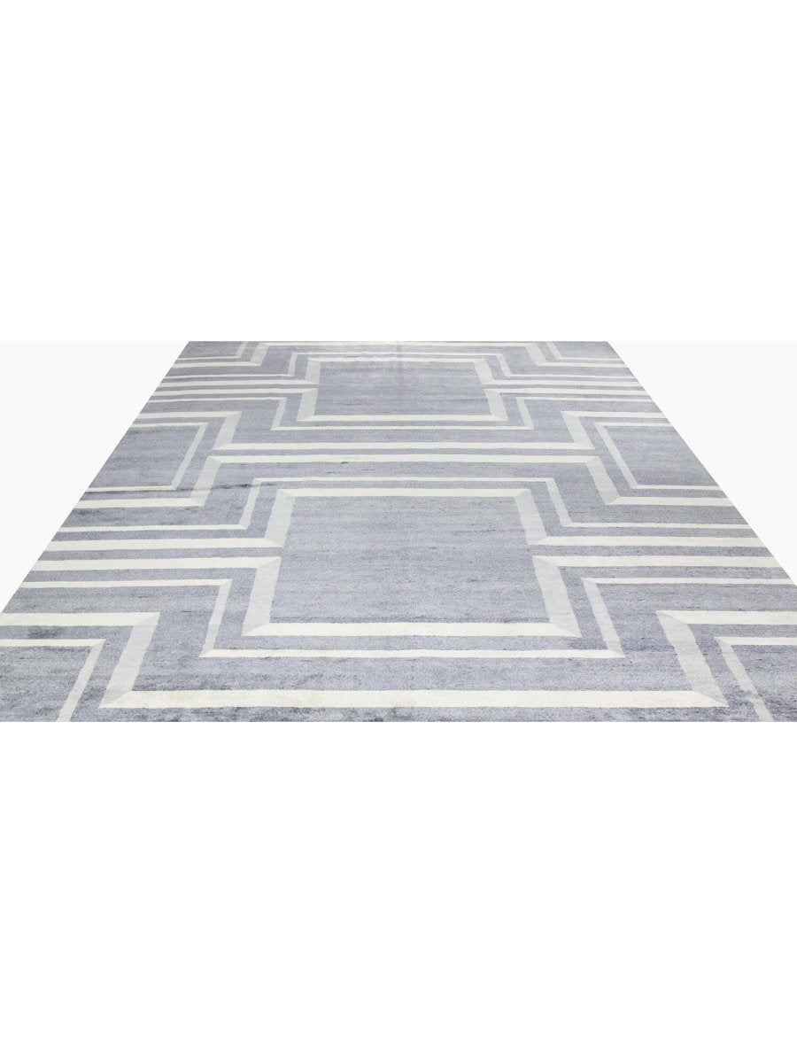 Immerse your space in the sophisticated allure of this magnificent 10x14 Contemporary Area Rug. Expertly hand-knotted in India from a luxurious blend of premium wool and bamboo silk, this new rug offers a rich texture and exceptional durability. The captivating geometric pattern features a striking interplay of gray and cream tones, creating a refined and distinctive visual appeal that instantly elevates any room.