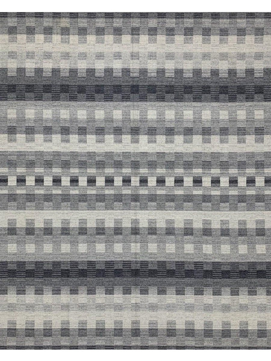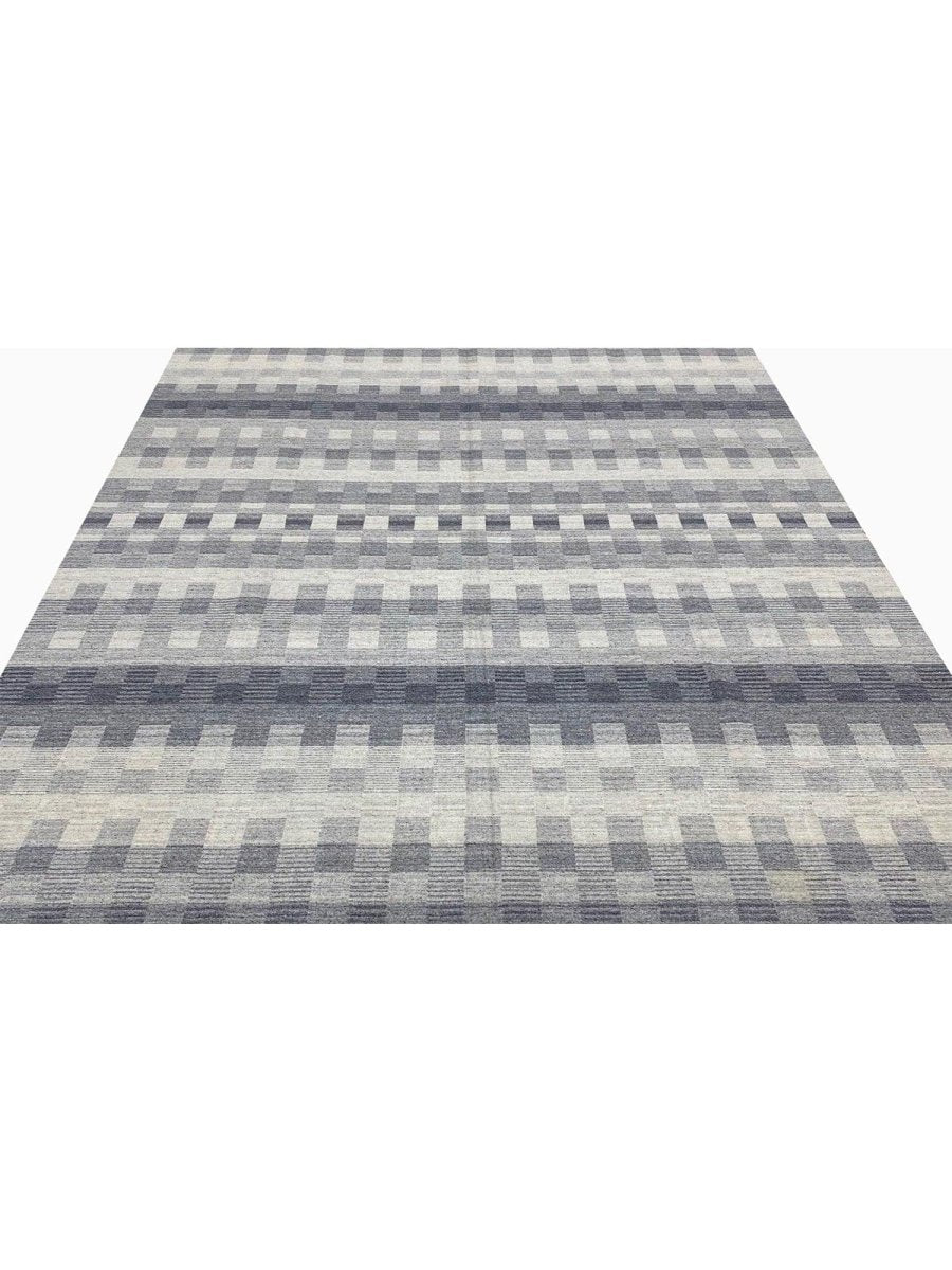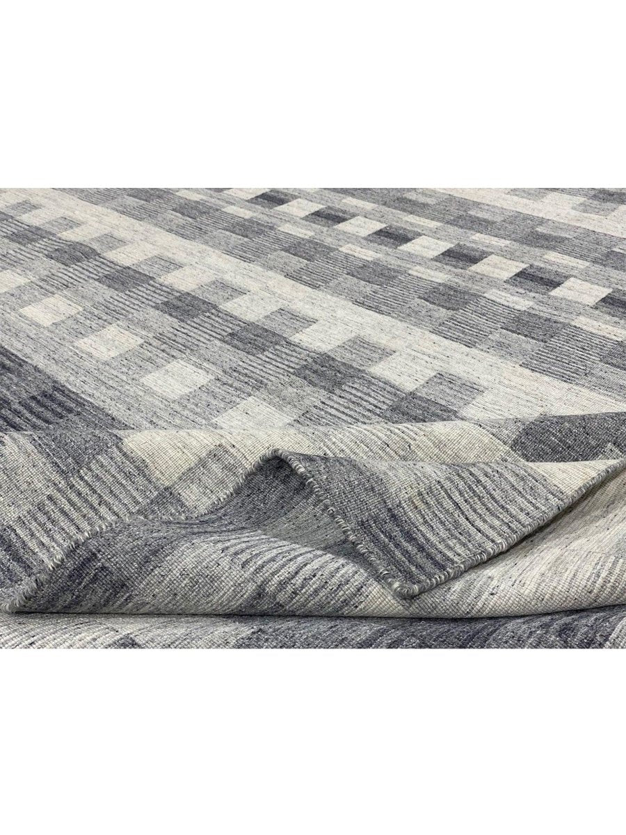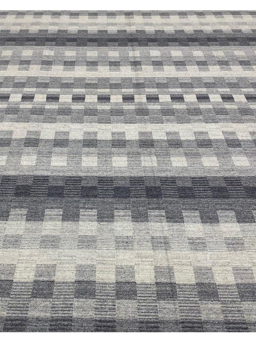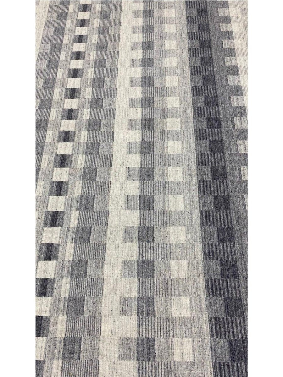 The 8x10 Modern Kilim Area Rug blends modern design with cultural craftsmanship, making it a perfect choice for sleek spaces. Hand-knotted in India from high-quality wool, this rug features a striking geometric pattern with alternating blocks of gray and off-white, creating a textured and layered effect. The soft and smooth wool construction ensures durability while providing a comfortable surface underfoot. The clean, minimalist design complements modern decor styles, adding depth and sophistication. Its muted color palette and precise geometric patterns bring elegance and functionality to any space, making it a versatile addition to your home.